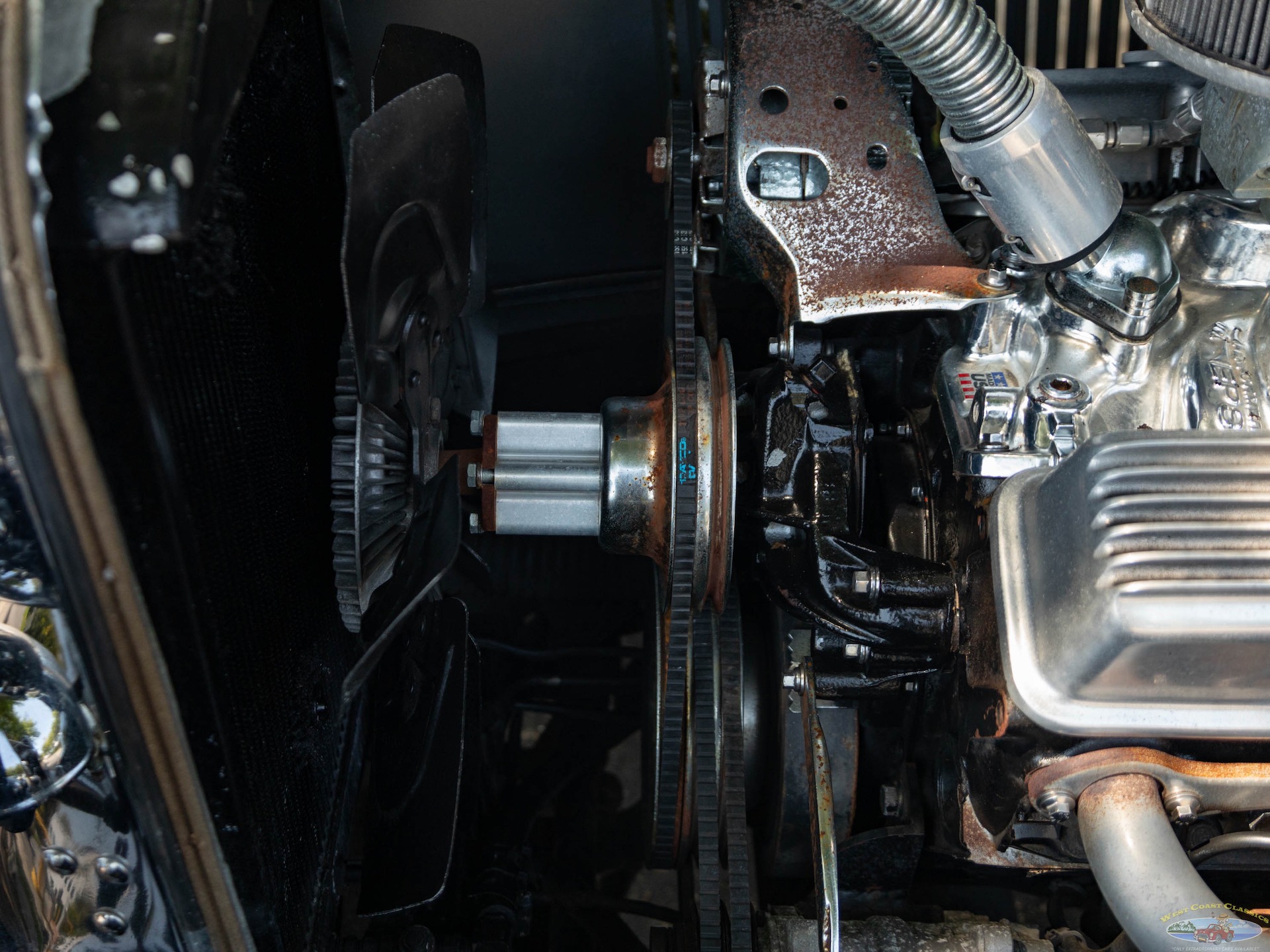 The car rides on 'Hiedts Superride' front suspension with sway bar and Air Ride Technologies Shockwaves rear suspension/Triangulated 4 bar with das control air pump with tank. The car stops using Wilwood front disc brakes with rear drums. The car has a standard rack and pinion steering hooked to a reworked stock steering column with Borgeson steering u-joints and a 'Griffen' radiator with air conditioning and heat!