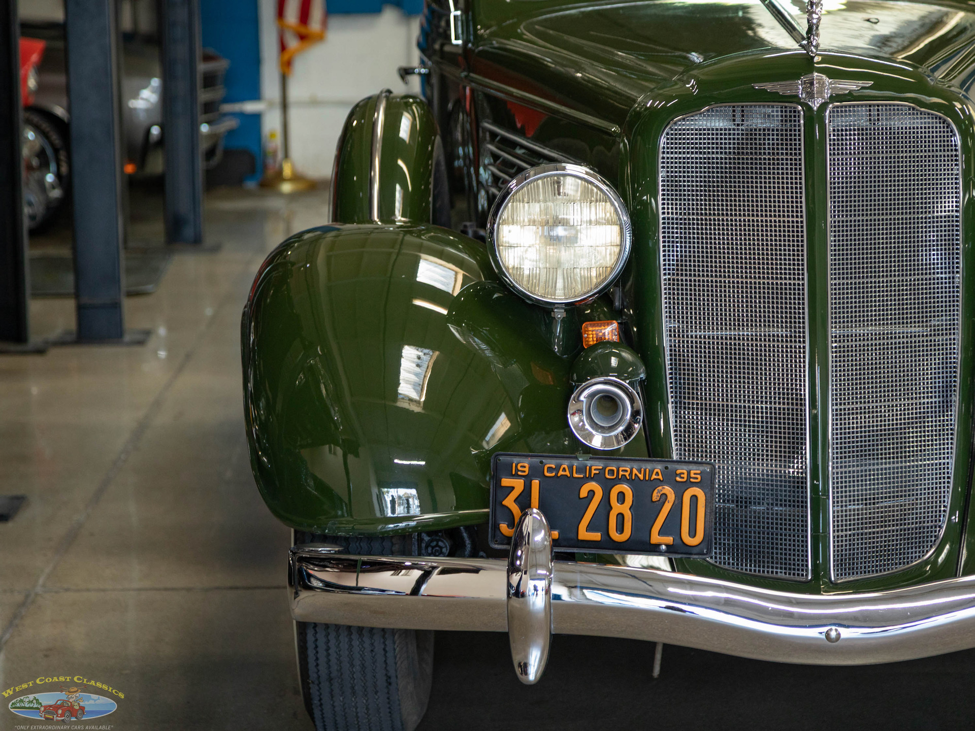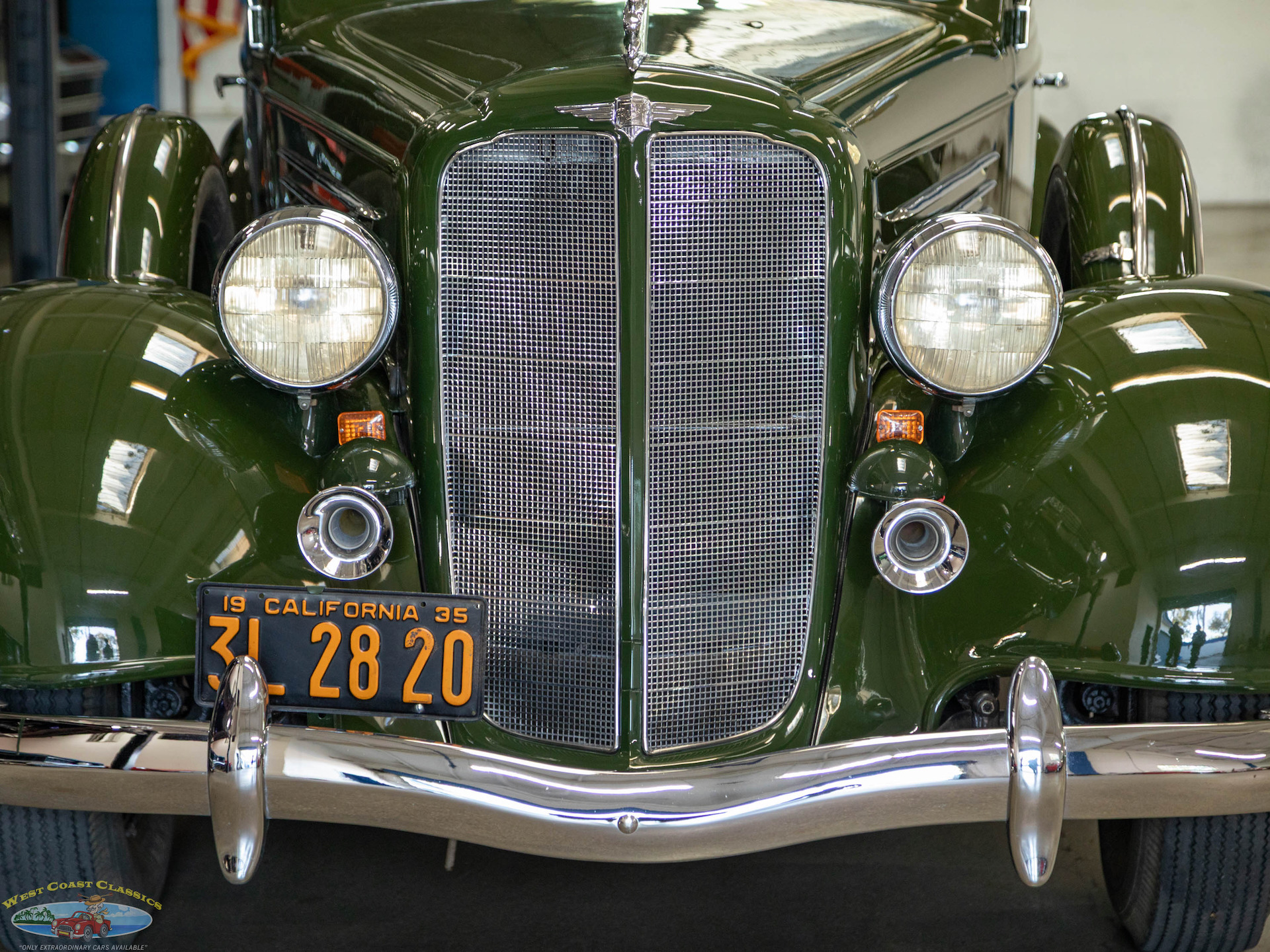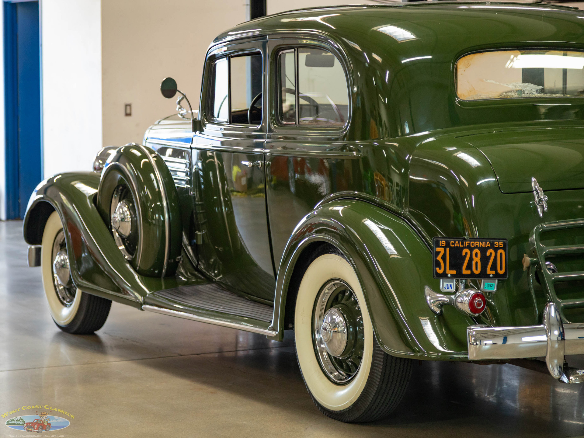 Exterior: Distinguished by sweeping aerodynamic lines, a "thinner depth" chrome grille for 1935, and artillery-style or wire-spoked wheel