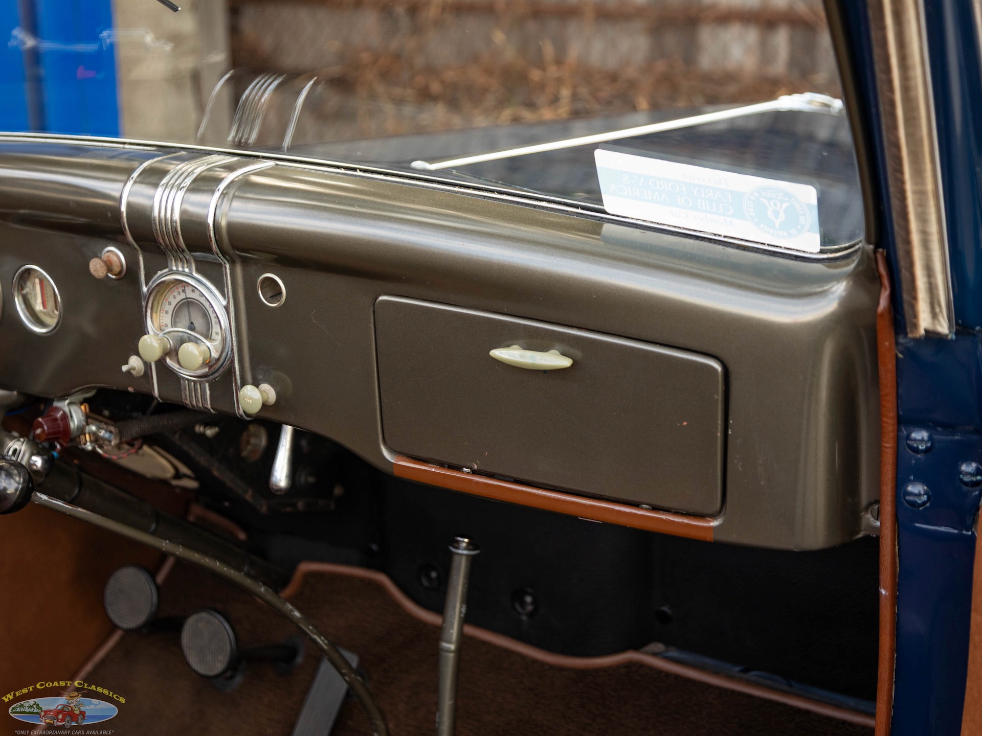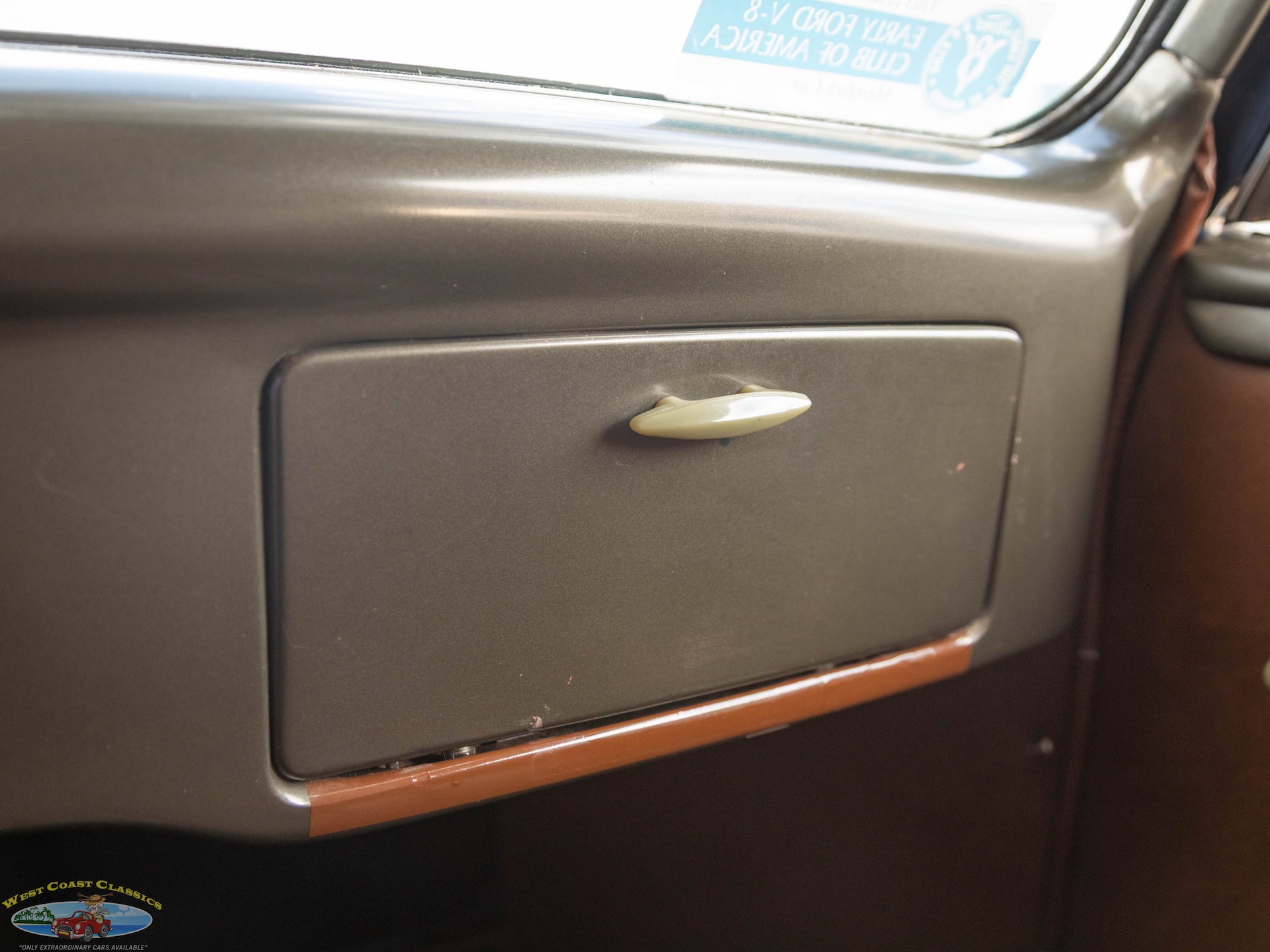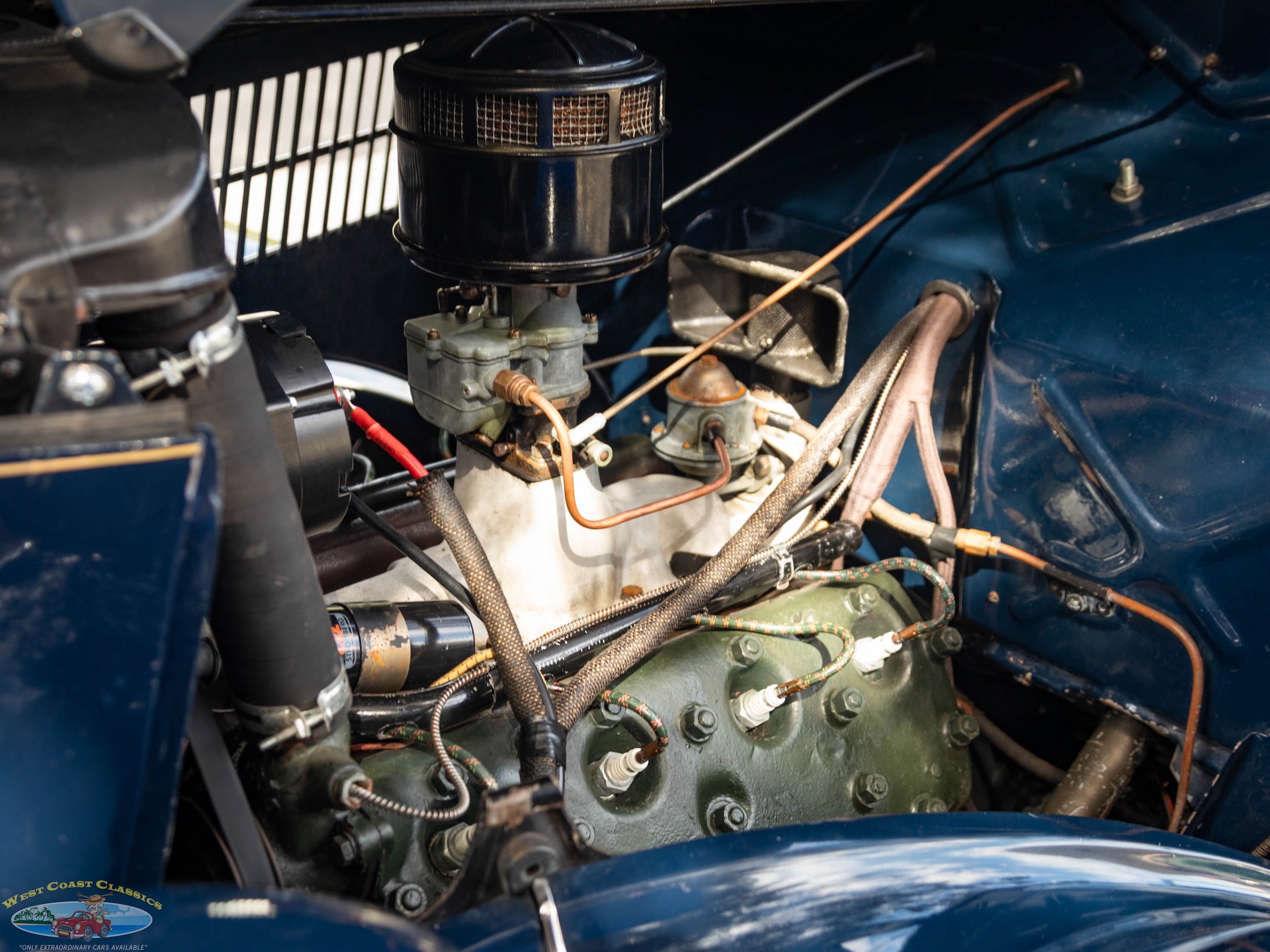 The 1936 V8 85HP DeLuxe cabriolet offered here is beautifully presented in probably the most striking of color combinations; 'Washington Blue' with a stunning Tan leather interior in the correct pattern, exceptional wood-grained trim (including the dashboard and window turns), and proper Ford script glass in the side windows and back window. The bodywork is impressively straight, with fresh welting and rubber seats, and the brightwork, including both chrome and stainless, is very attractive. Its engine bay has an excellent, stock appearance, with an original air cleaner and generator, factory manifolds and exhaust, and proper detailing down to the correct hose clamps. Desirable accessories fitted included a jewel cigar lighter, rear-view mirror, original Ford clock, chrome bumper guards, as well as matching 'Washington Blue' stock V8 hub caps with trim rings.