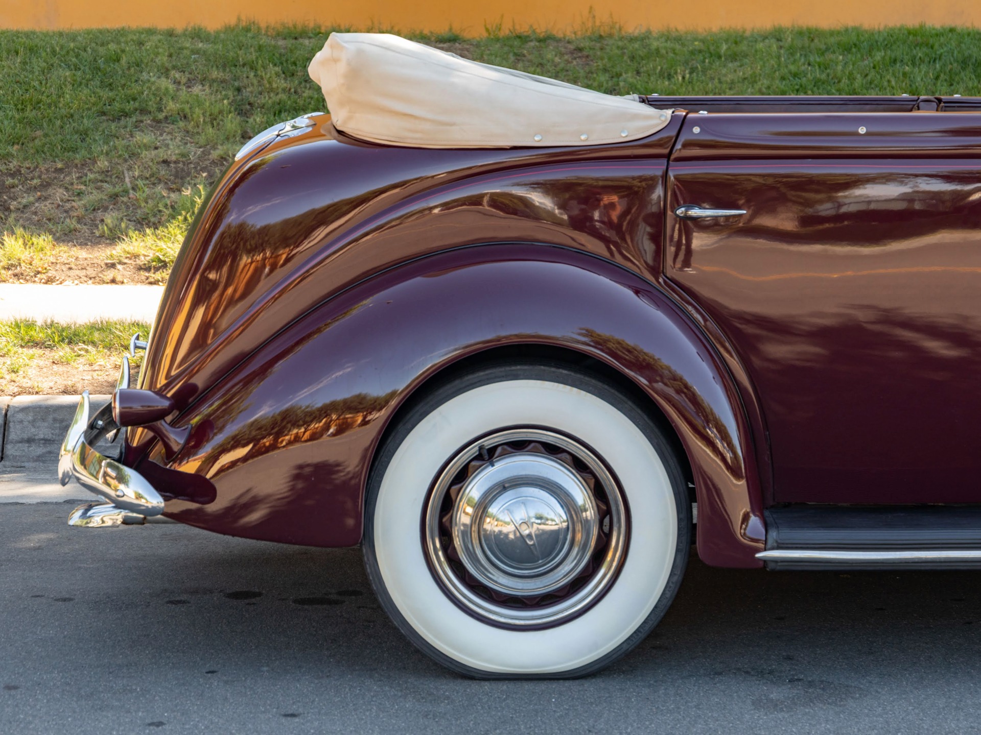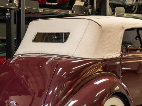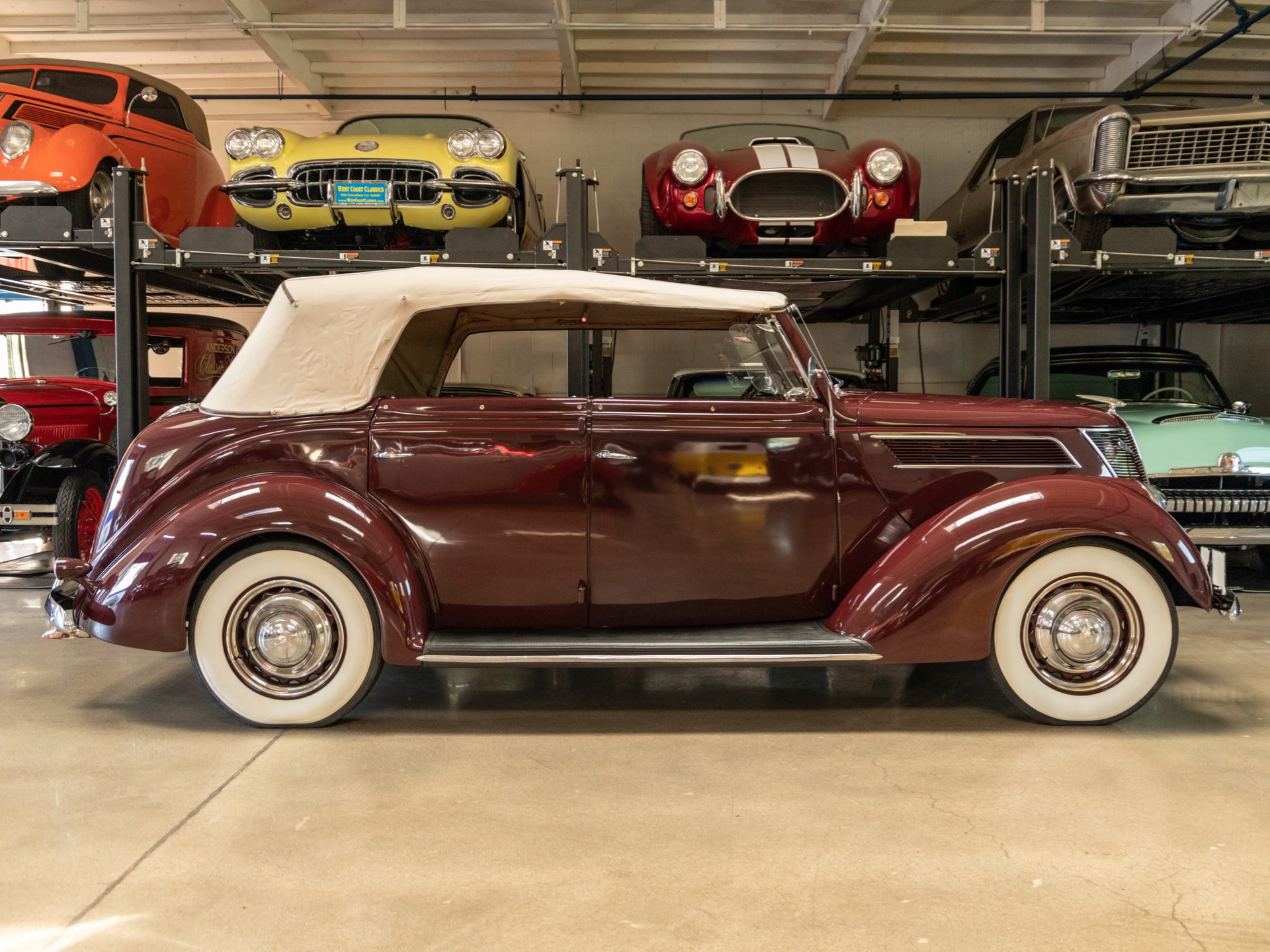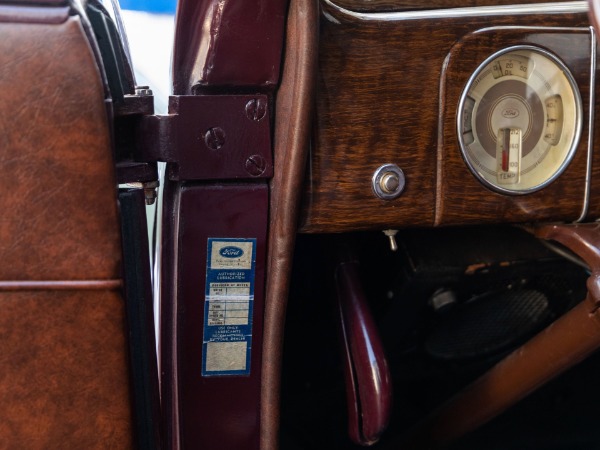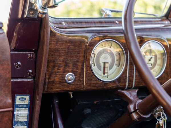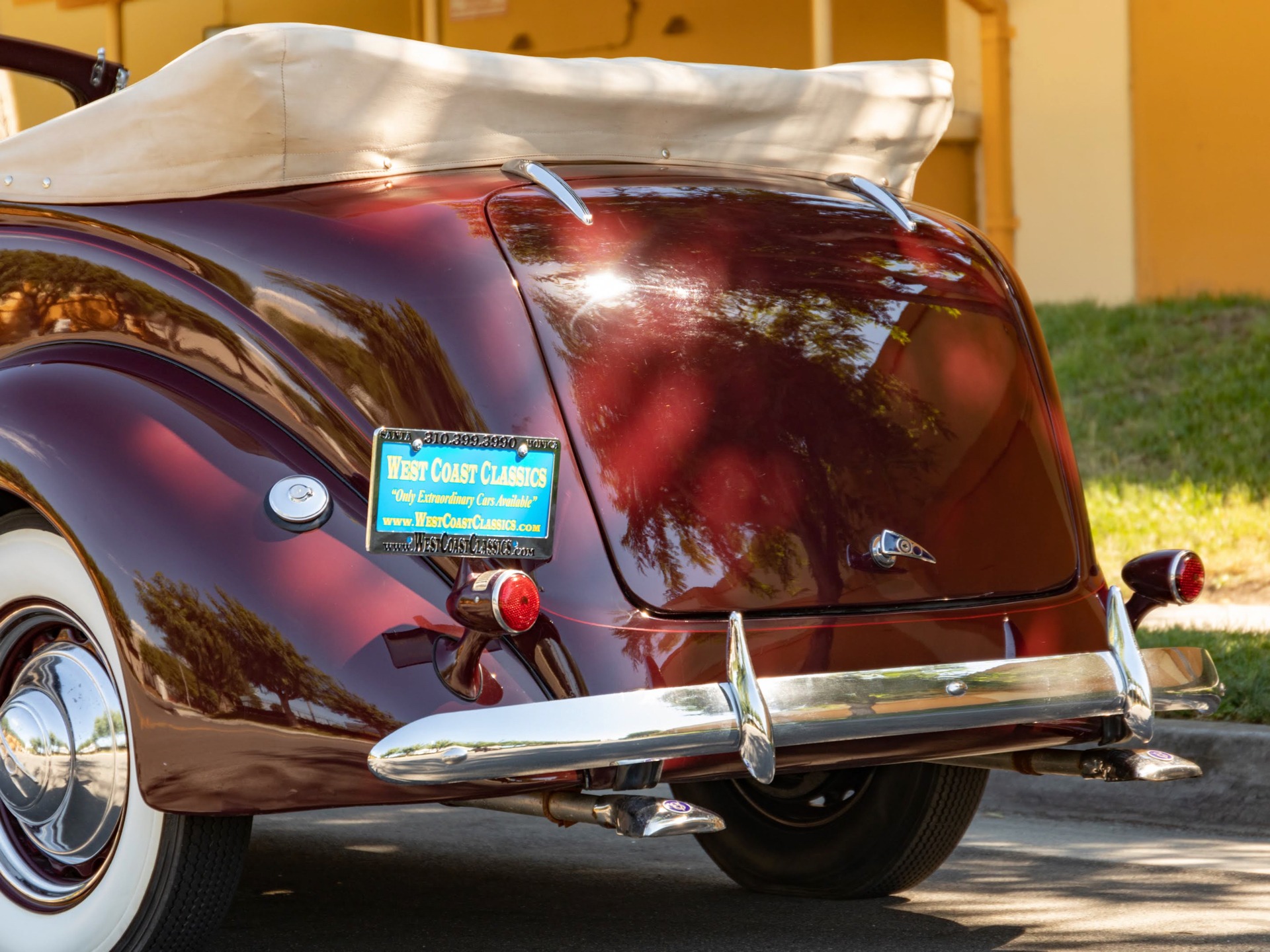 This 1937 DeLuxe Phaeton is one of 3,723 built that year, the rarest of that years body styles apart from the Roadster, and is equipped with the early 21-stud 221 CID V-8 engine with a 3 speed manual transmission backed by a 3.78:1 differential. The car has its original 'Bright Coach Maroon' factory color paint and is rust free throughout with all the body contours correct, door gaps are even, and the doors shut well. The interior had been reupholstered in Brown with matching door panels and carpets and is complemented by the iconic banjo steering wheel and a stem-wind clock in the glove box door. A taupe canvas top nicely completes the motif and the undercarriage is exceedingly clean and rust free. The original wheels are fitted with whitewall tires accented with original spider hubcaps and trim rings. The spare wheel rests in it's original trunk location.