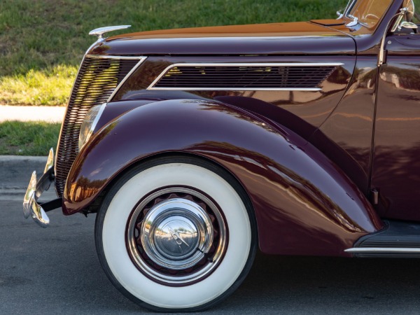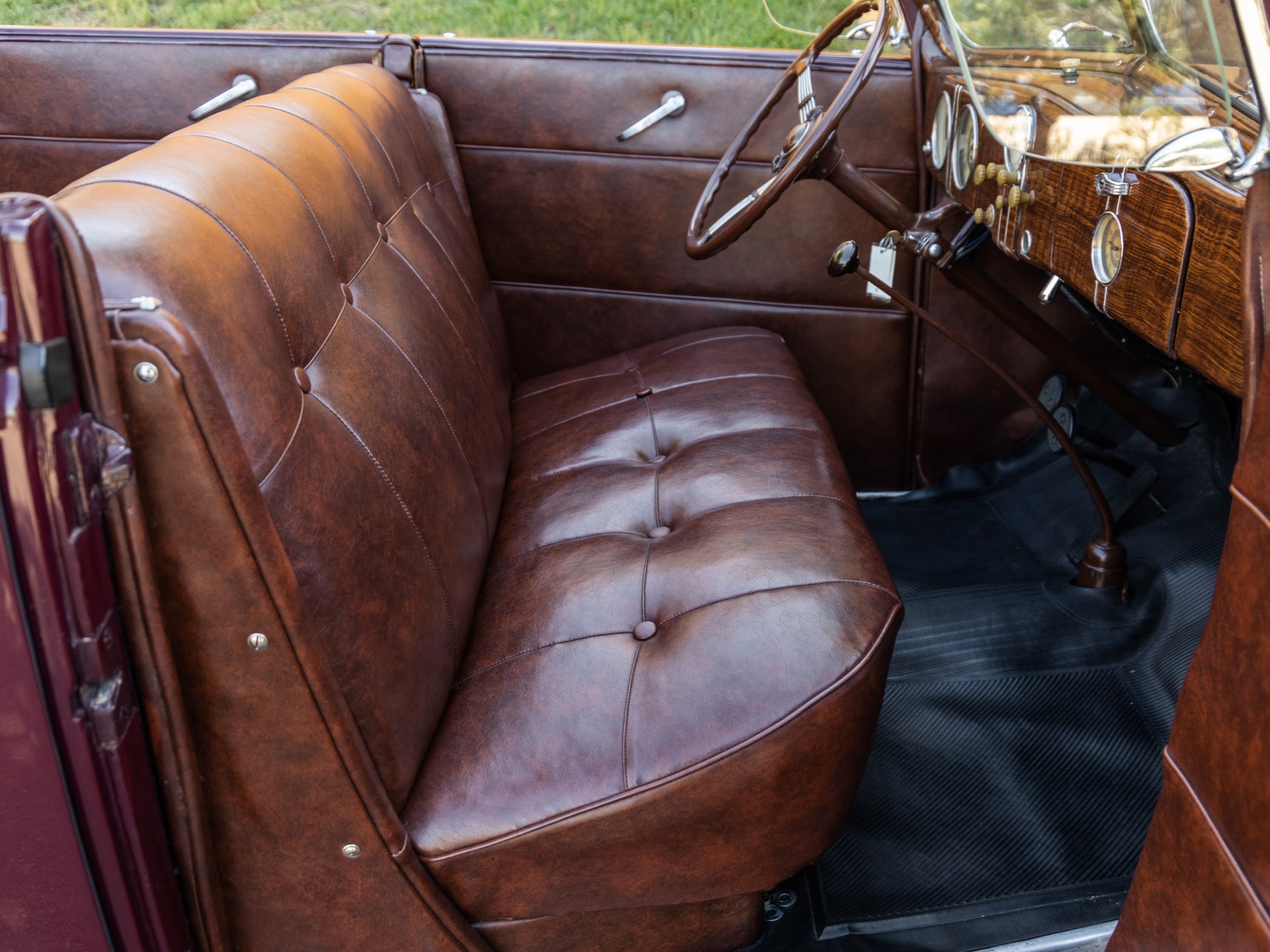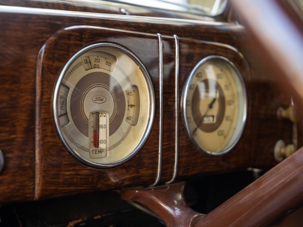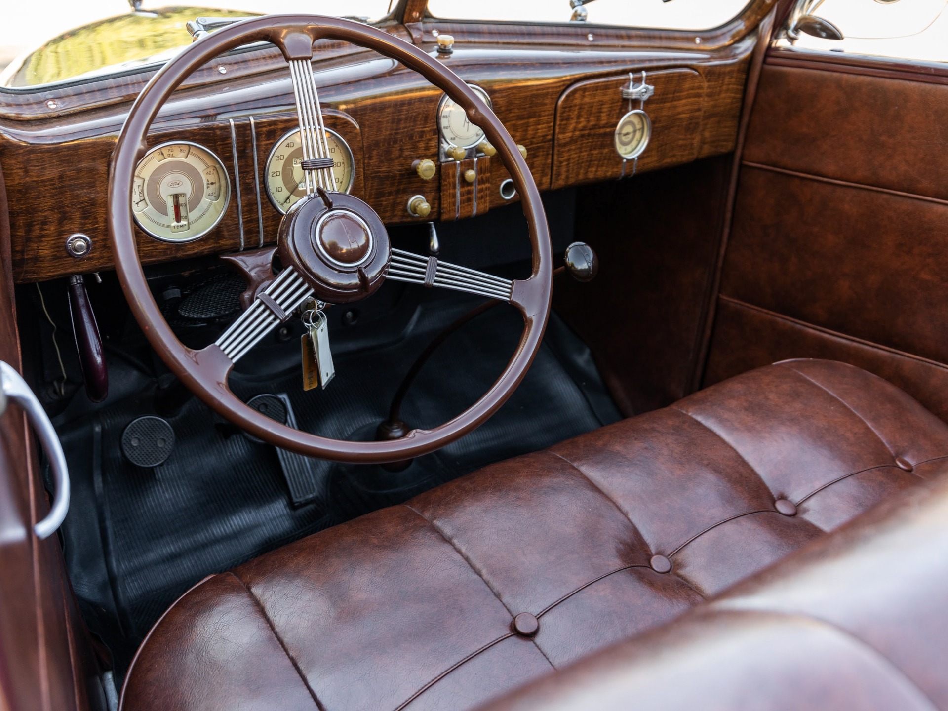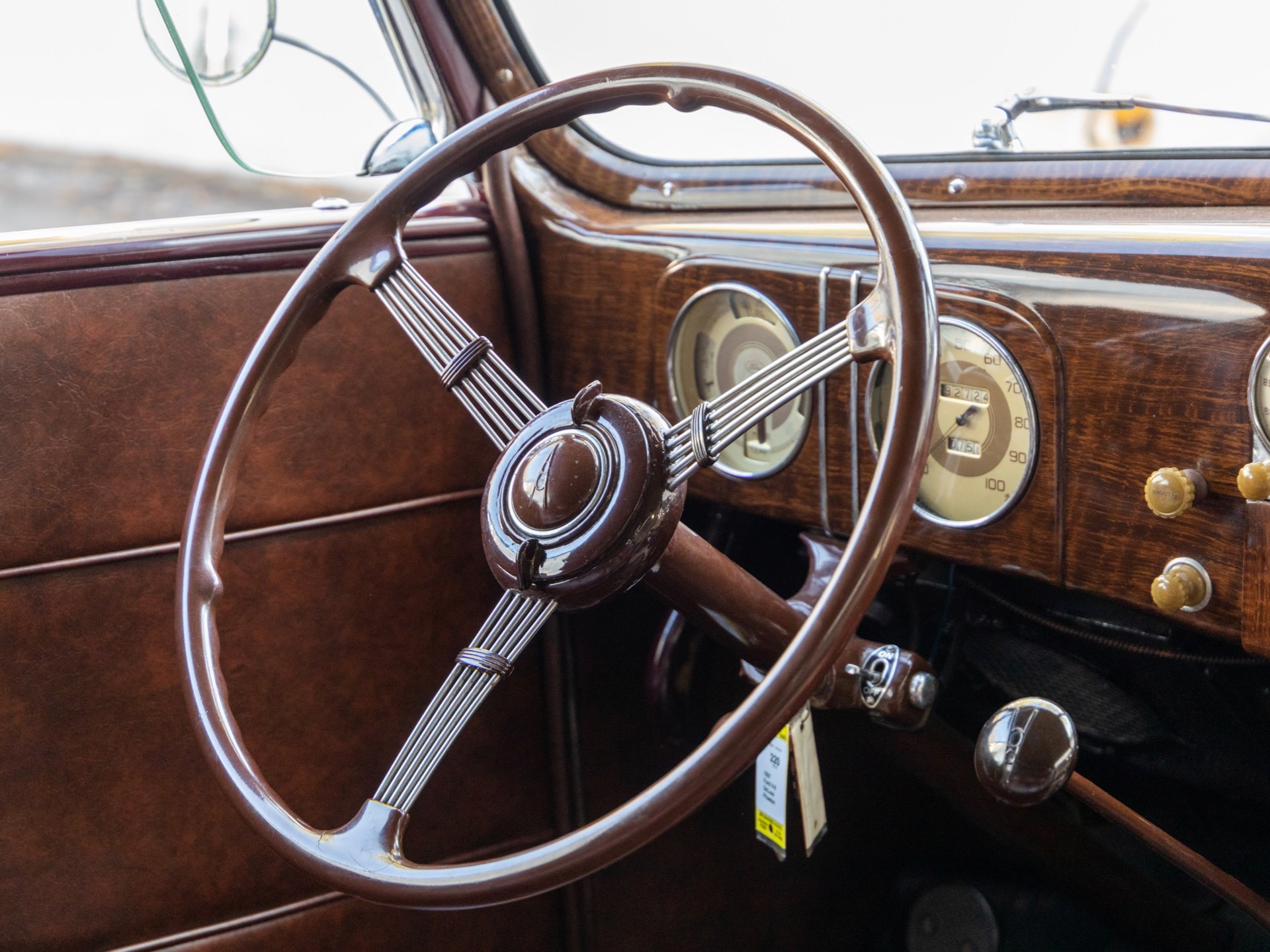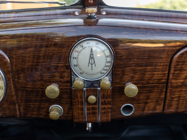 This 1937 DeLuxe Phaeton is one of 3,723 built that year, the rarest of that years body styles apart from the Roadster, and is equipped with the early 21-stud 221 CID V-8 engine with a 3 speed manual transmission backed by a 3.78:1 differential. The car has its original 'Bright Coach Maroon' factory color paint and is rust free throughout with all the body contours correct, door gaps are even, and the doors shut well. The interior had been reupholstered in Brown with matching door panels and carpets and is complemented by the iconic banjo steering wheel and a stem-wind clock in the glove box door. A taupe canvas top nicely completes the motif and the undercarriage is exceedingly clean and rust free. The original wheels are fitted with whitewall tires accented with original spider hubcaps and trim rings. The spare wheel rests in it's original trunk location.