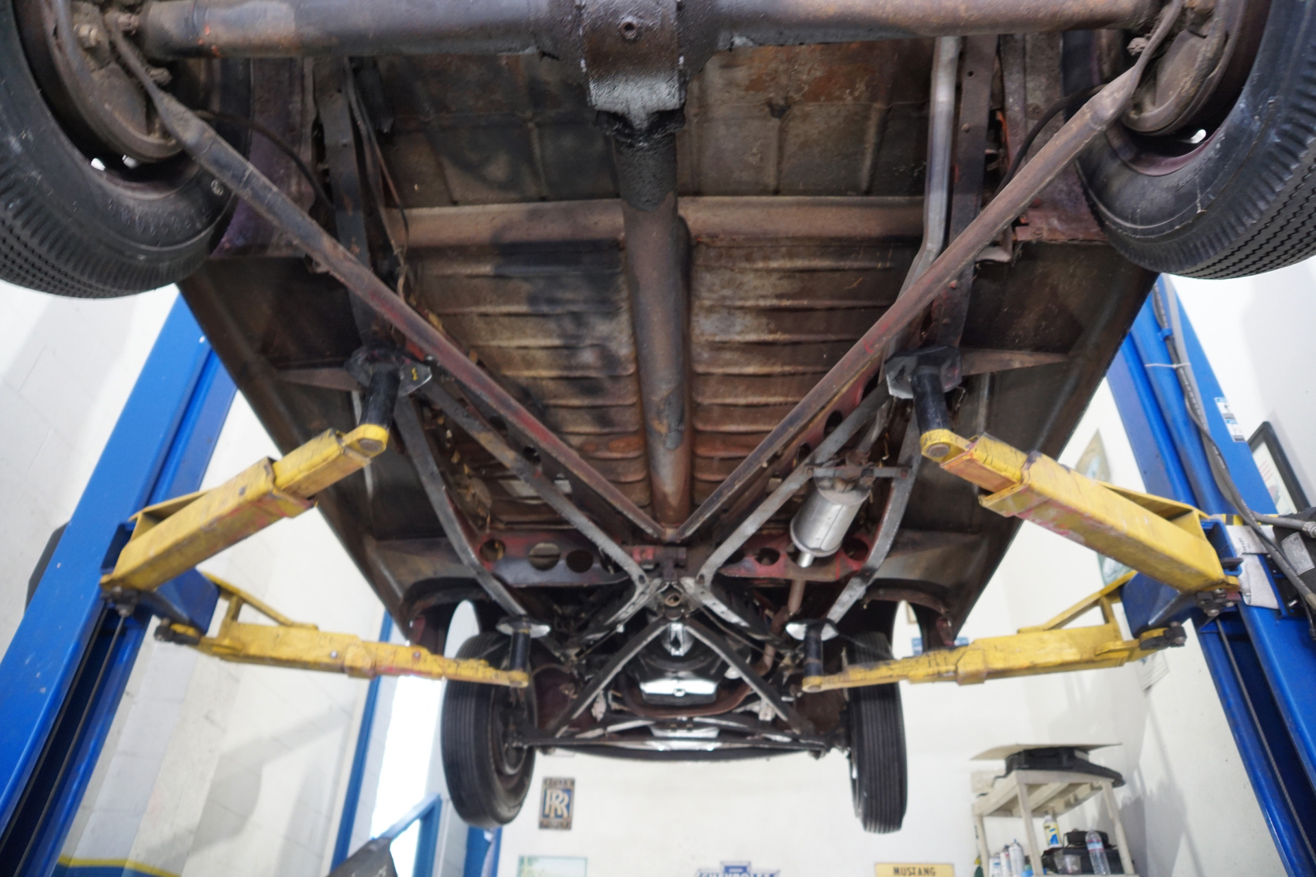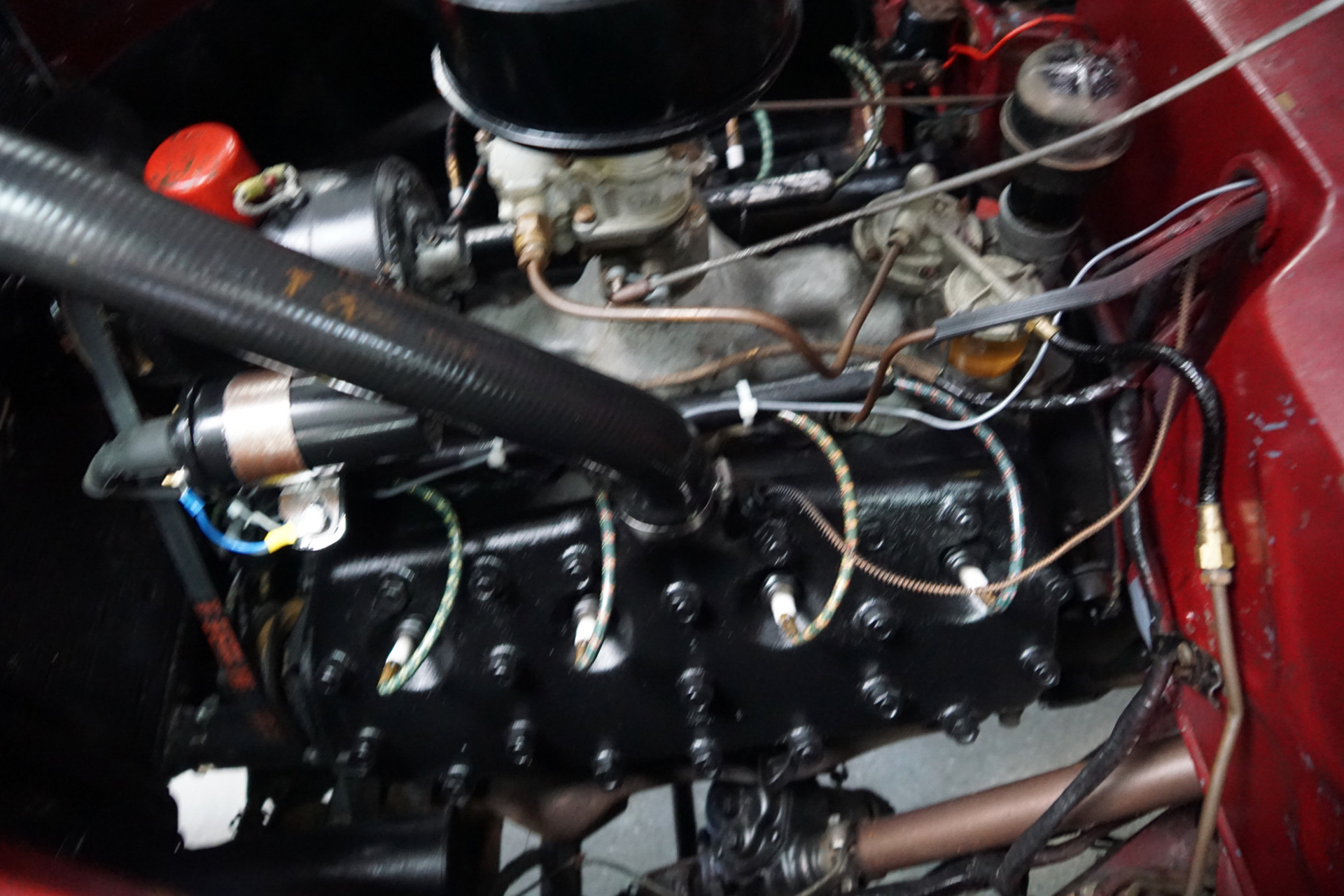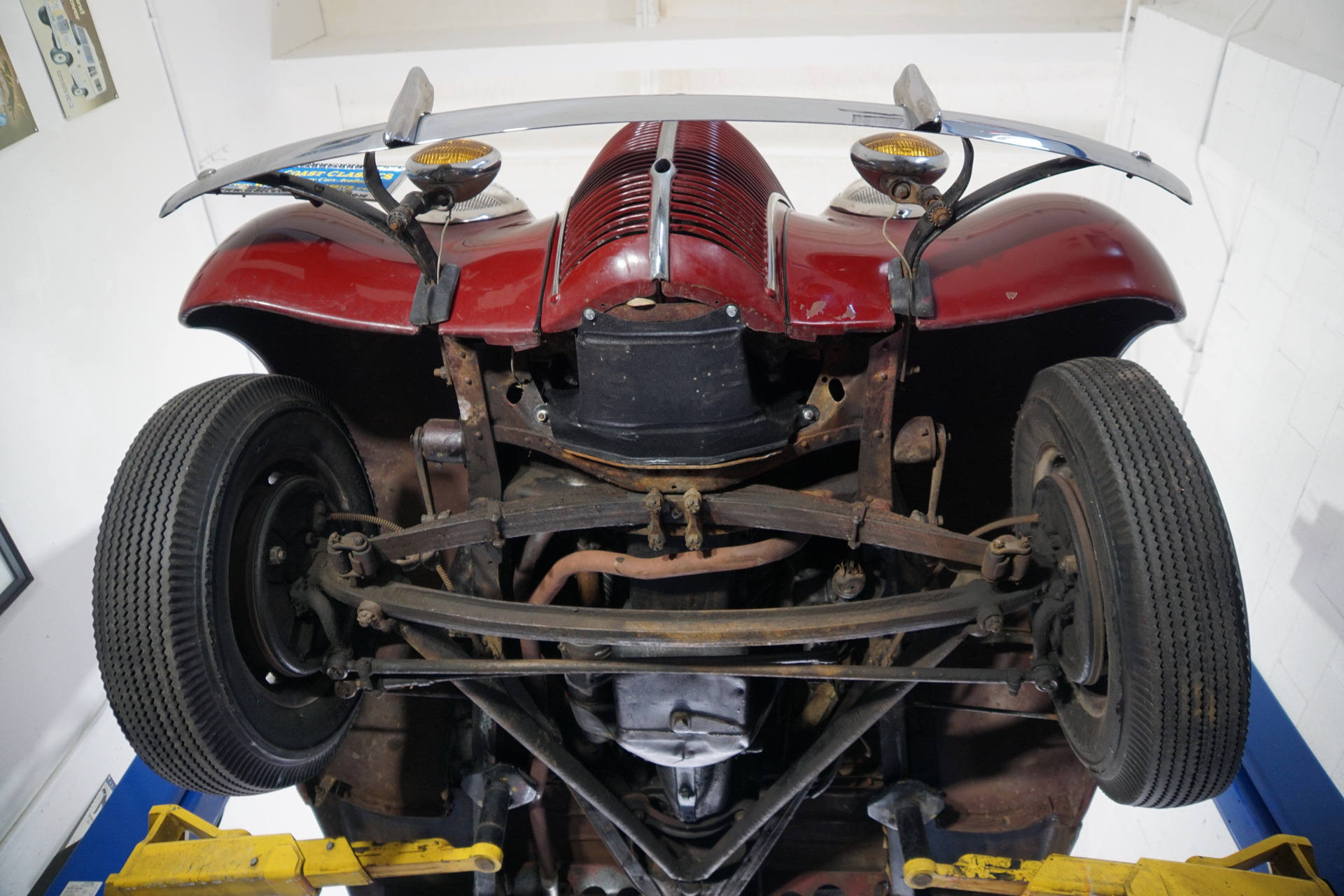 Since aquiring the car we had the car fully serviced and installed an electronic ignition distributor, replaced all spark plug wires and water pumps etc and the car actually now drives very well and is still quite striking thoughout with the accessory door hinge mirrors, wind wings, and spider hub caps contributing to the effect. The interior had already been reupholstered in Brown with matching door panels and carpets and is complemented by the iconic banjo steering wheel and a stem-wind clock in the glove box door. A taupe canvas top nicely completes the motif and matching side curtains are found in the trunk. The undercarriage is exceedingly clean and rust free. The original wheels are fitted with whitewall tires accented with original spider hubcaps and trim rings. The spare wheel rests in it's original trunk location.