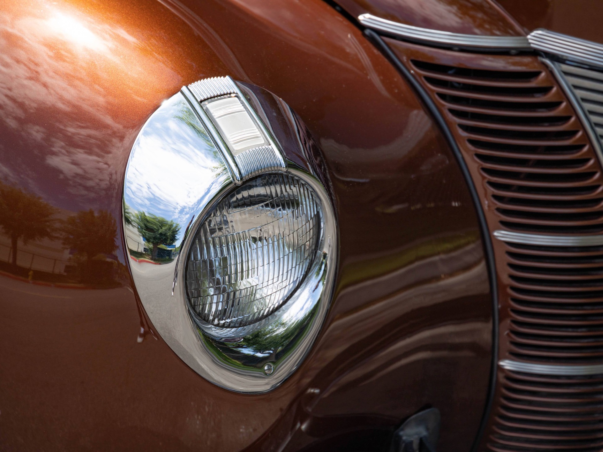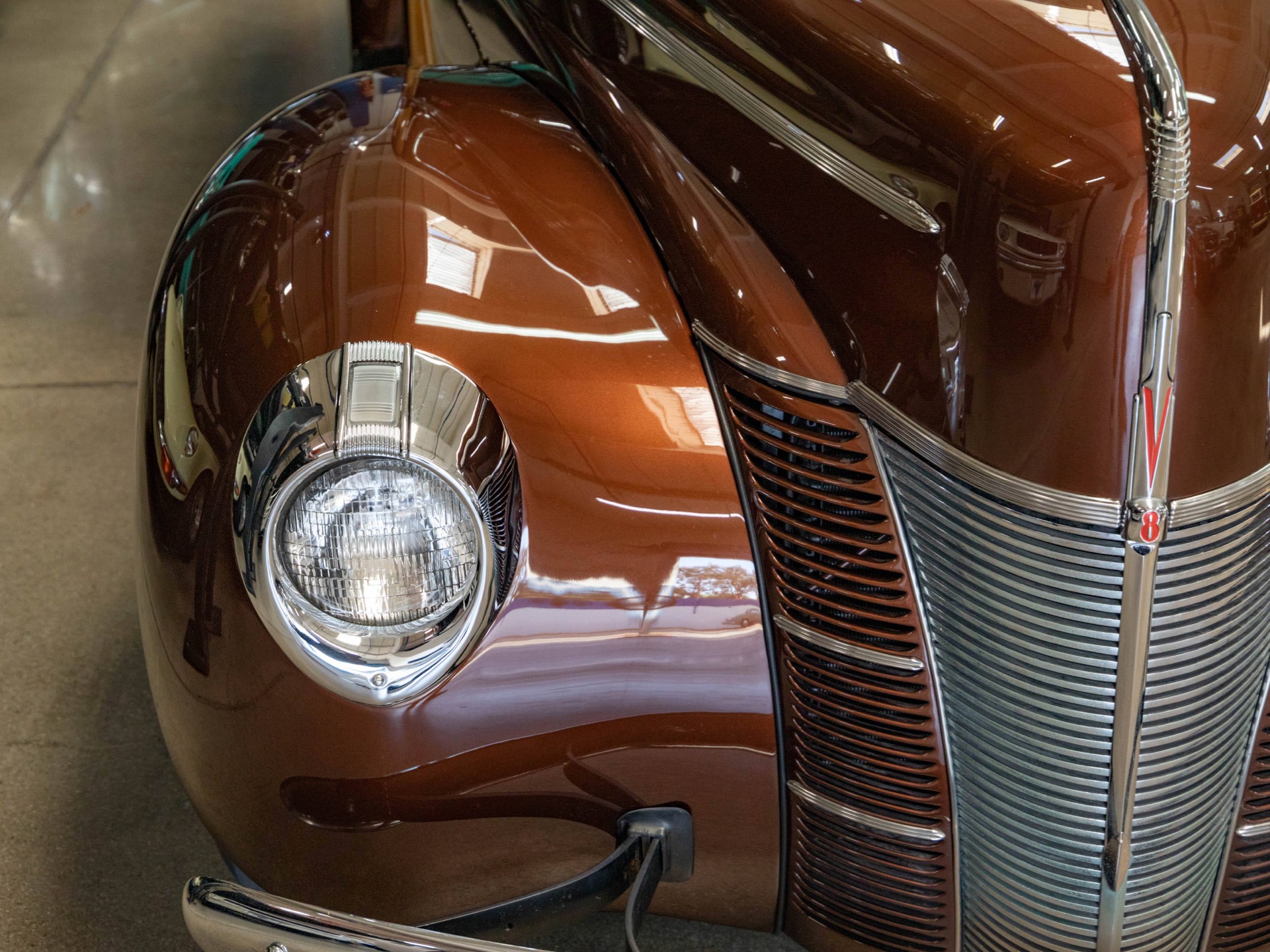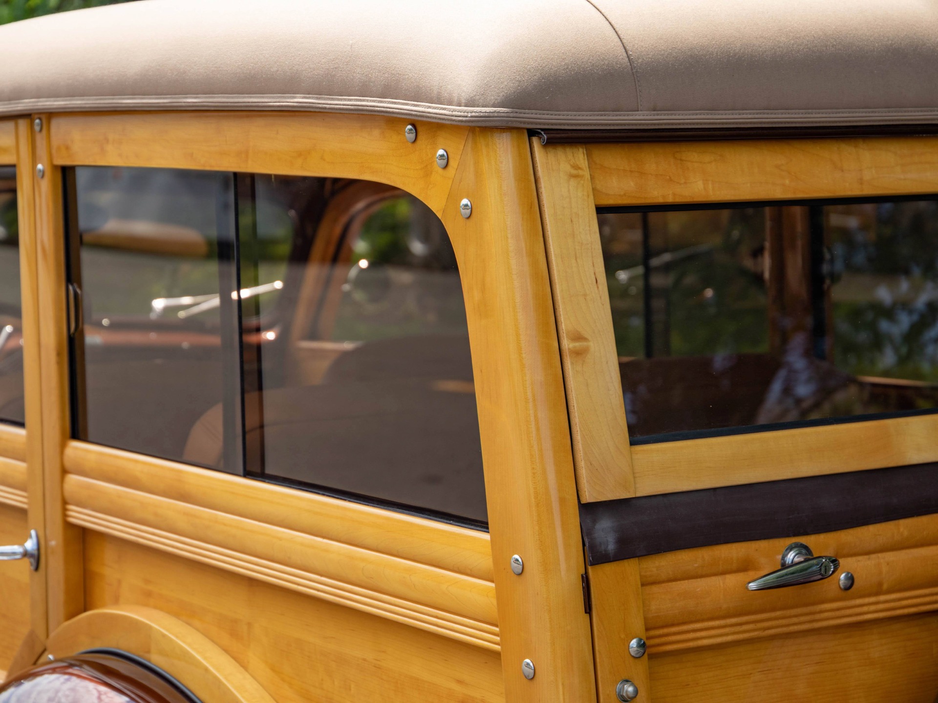 The bodies then took on a much different appearance. The roofline was subtly altered, becoming more rounded at the windshield header. Panel spacing was changed, such that the lower panel became narrower, and the rear quarter panels were consolidated into one piece. The rear doors, formerly hinged at the back, suicide style, now swung toward the front. The spare tire, housed inside in 1938 and 39, on the back of the drivers seat, was returned to the tailgate, where it had been located from 1935 to 1937. Deluxe wagons were given the option of maple or birch framing, while Standards came in maple only. Darker-colored gumwood began to be used for panels, in addition to birch, in both series. The choice of material was random. Bodies were given three coats of varnish, hand-sanded between each application. Three engines were available: the popular 221 cubic inch 85 hp V-8, the small 136 cubic inch 60 hp V-8 (installed in just two Standard wagons), and the larger 239 cubic inch 95 hp V-8 from the new Mercury, which was fitted to 354 Deluxe station wagons.