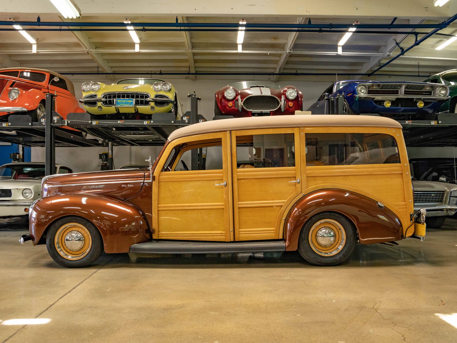 West Coast Classics are proud to present an absolutely exceptional and beautiful example of this no expense spared and stylishly customized all American classic Woody hot rod wagon - a 1940 Ford Deluxe Woody Station Wagon, customized, crafted and built by the late, and an absolute legend in the southern California Woody community, Doug Carr of the renown 'Wood N' Carr' shop of Signal Hill, CA shop, and reportedly one of his very last, if not the last, Woodys built. With only some 335 miles on the build the wagon boasts all new wood, a fuel injected crate 302 Ford racing engine matched to an Art Carr 4 speed automatic performance transmission, Vintage AC & Heat, Power windows, Power steering, Power electric brakes, all new suspension, soundproofing, Walker radiator, all new smoked glass windows & windshield, all new 12V wiring system and stunning paint in its original factory color and an all new custom leather interior!