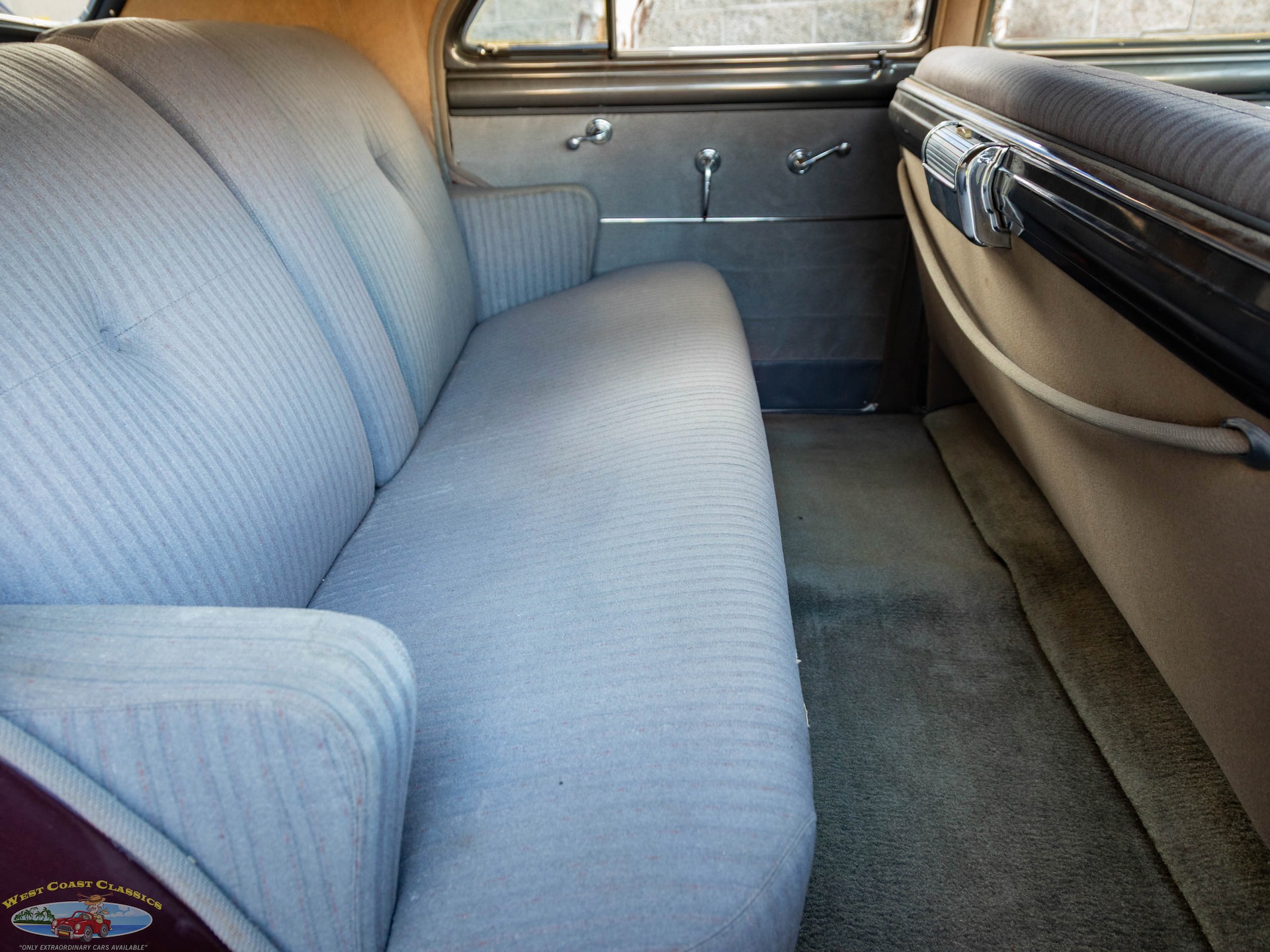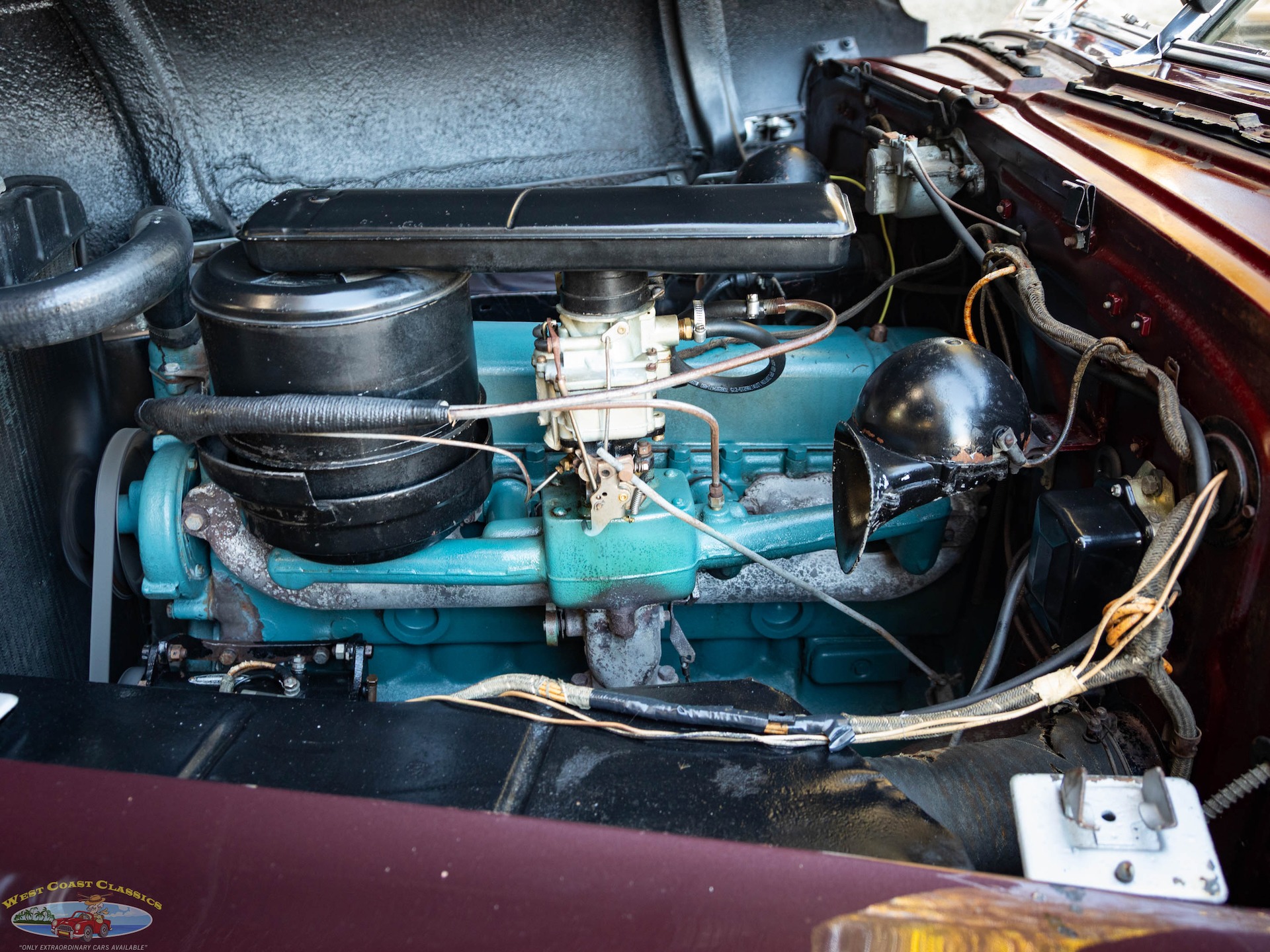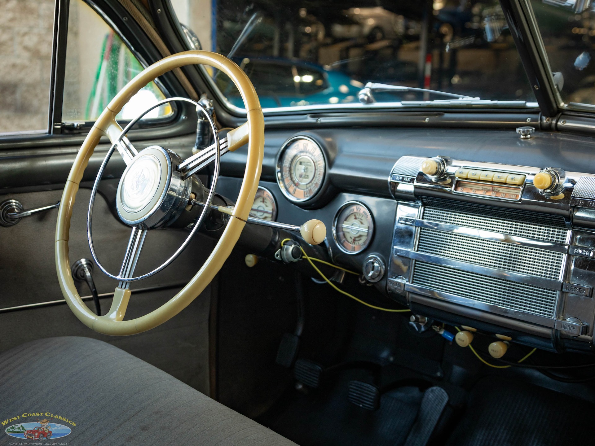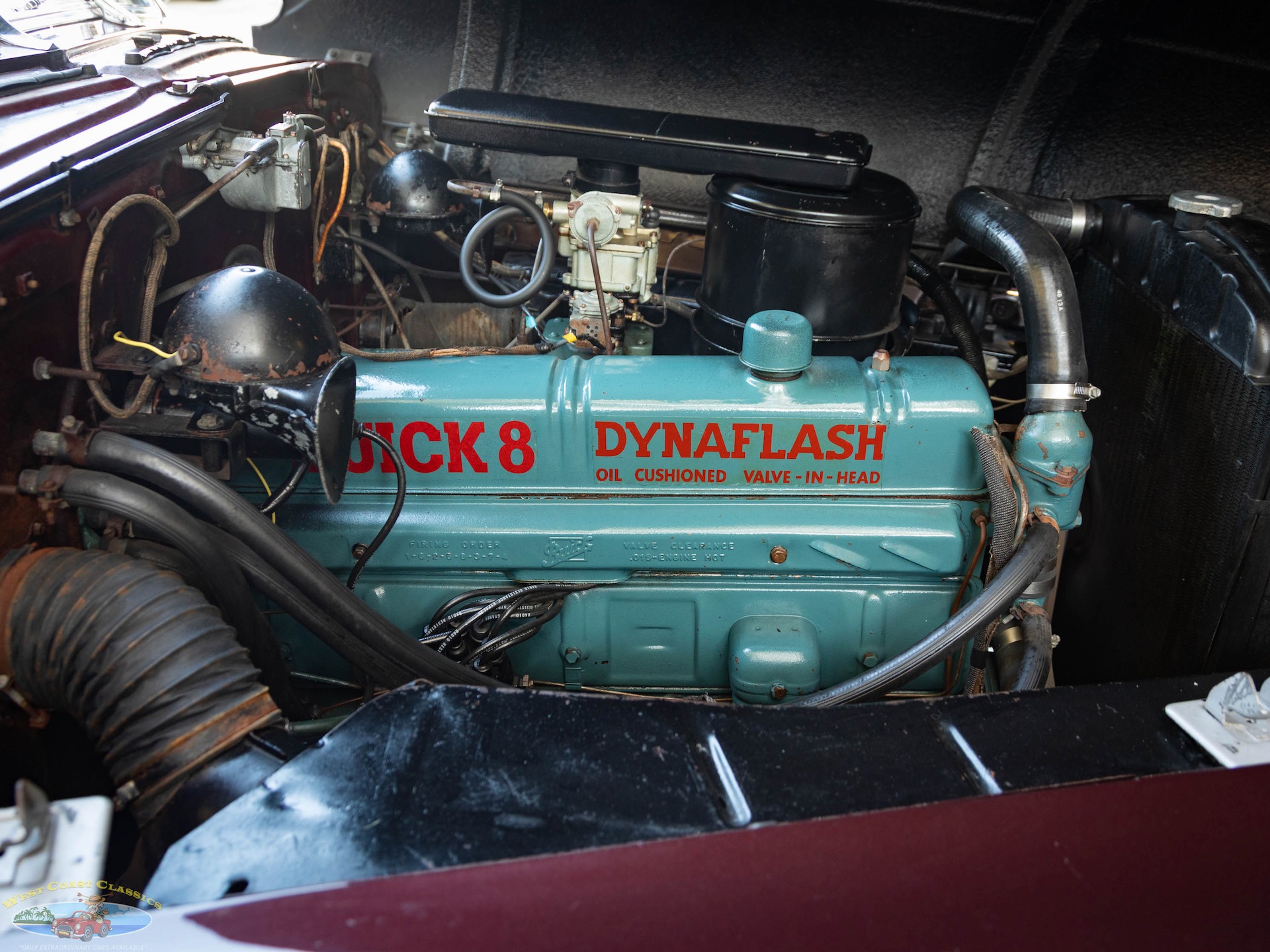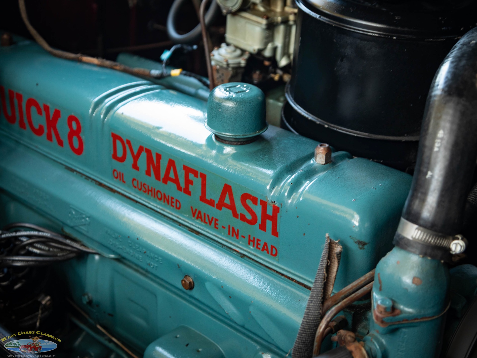 Step on the gas pedal and the big 248 cubic inch OHV straight-8 springs to life quickly and easily, immediately settling into an easy idle that sounds muscular but muted. It drives superbly with big Buick torque available at any speed. It wears correct Buick Turquoise engine enamel and following the war, all large-series Buicks used single 2-barrel carburetors, which is what is on the car today. Even the original oil bath air cleaner is still in place.