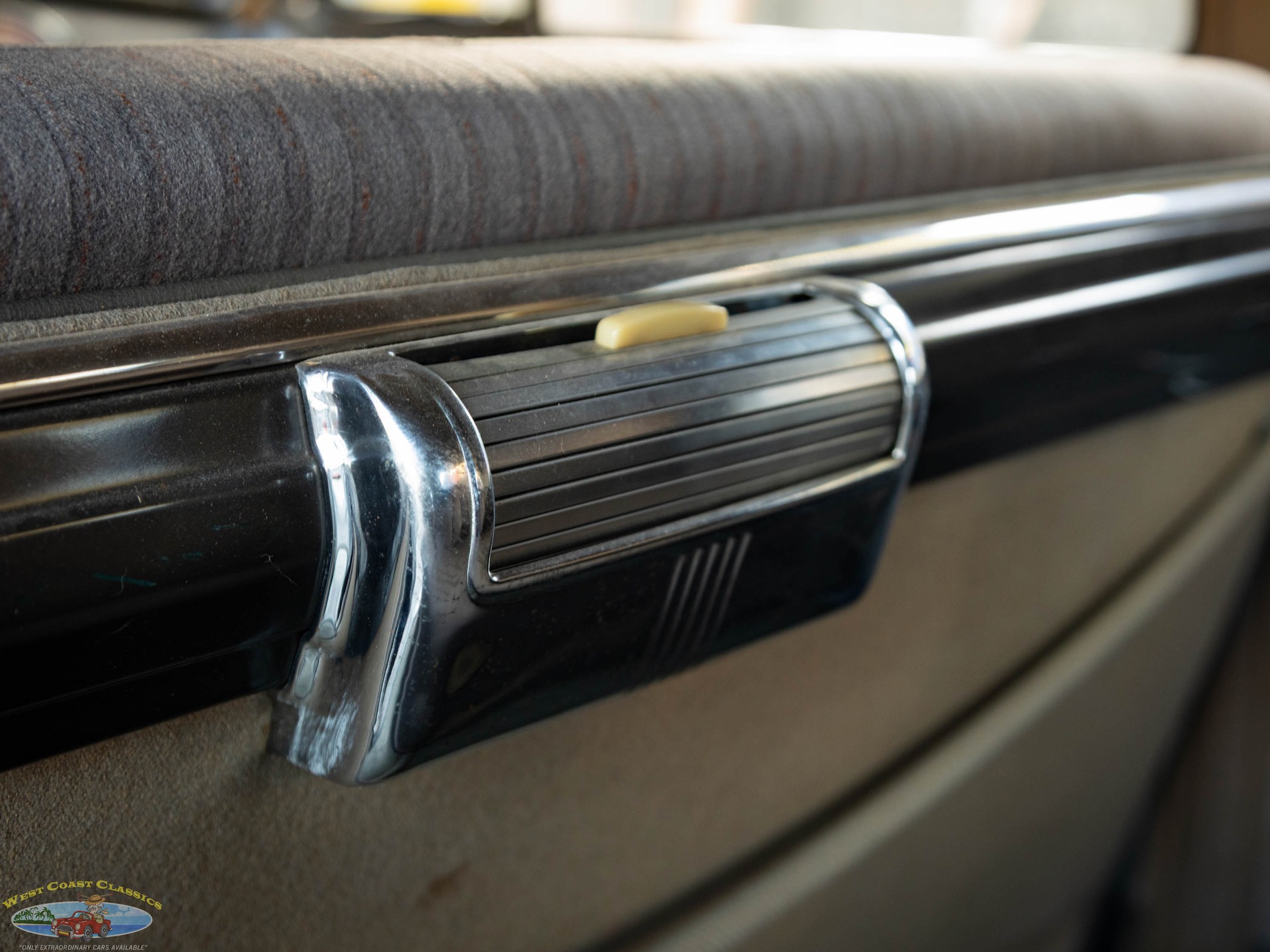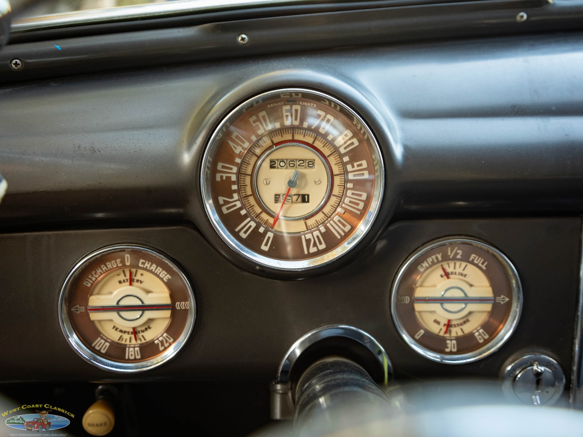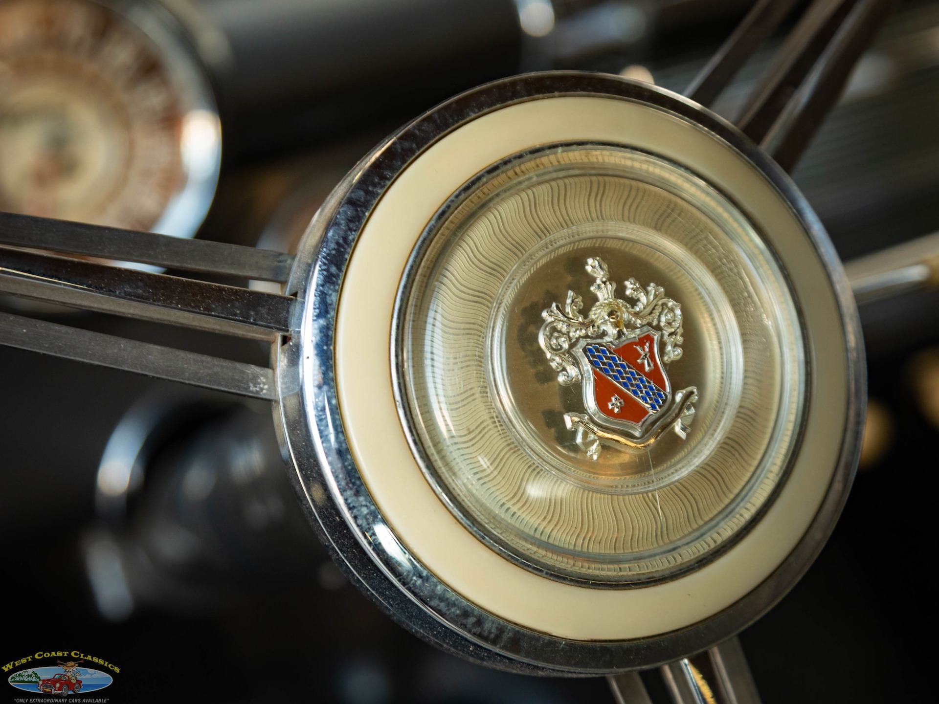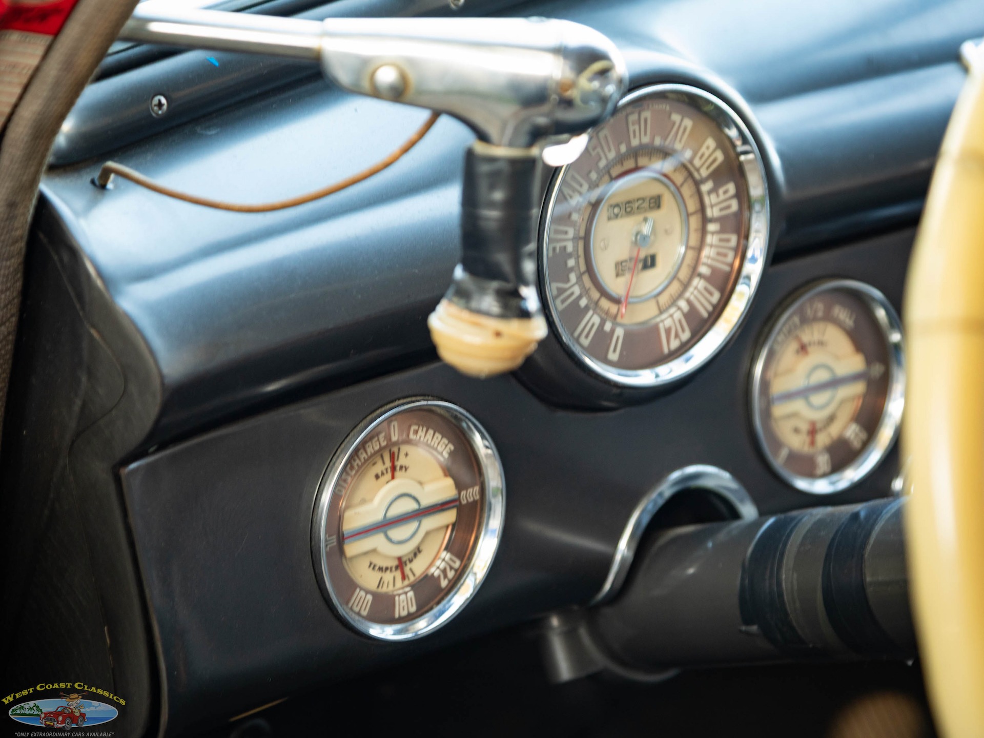 The driver sits behind a massive steering wheel that makes guiding this big car effortless and gauges are arrayed in round pods, with the speedometer front and center and auxiliary dials on either side. Secondary controls are the chrome pull switches underneath and theres a Sonomatic AM radio up high in the center of the dash.