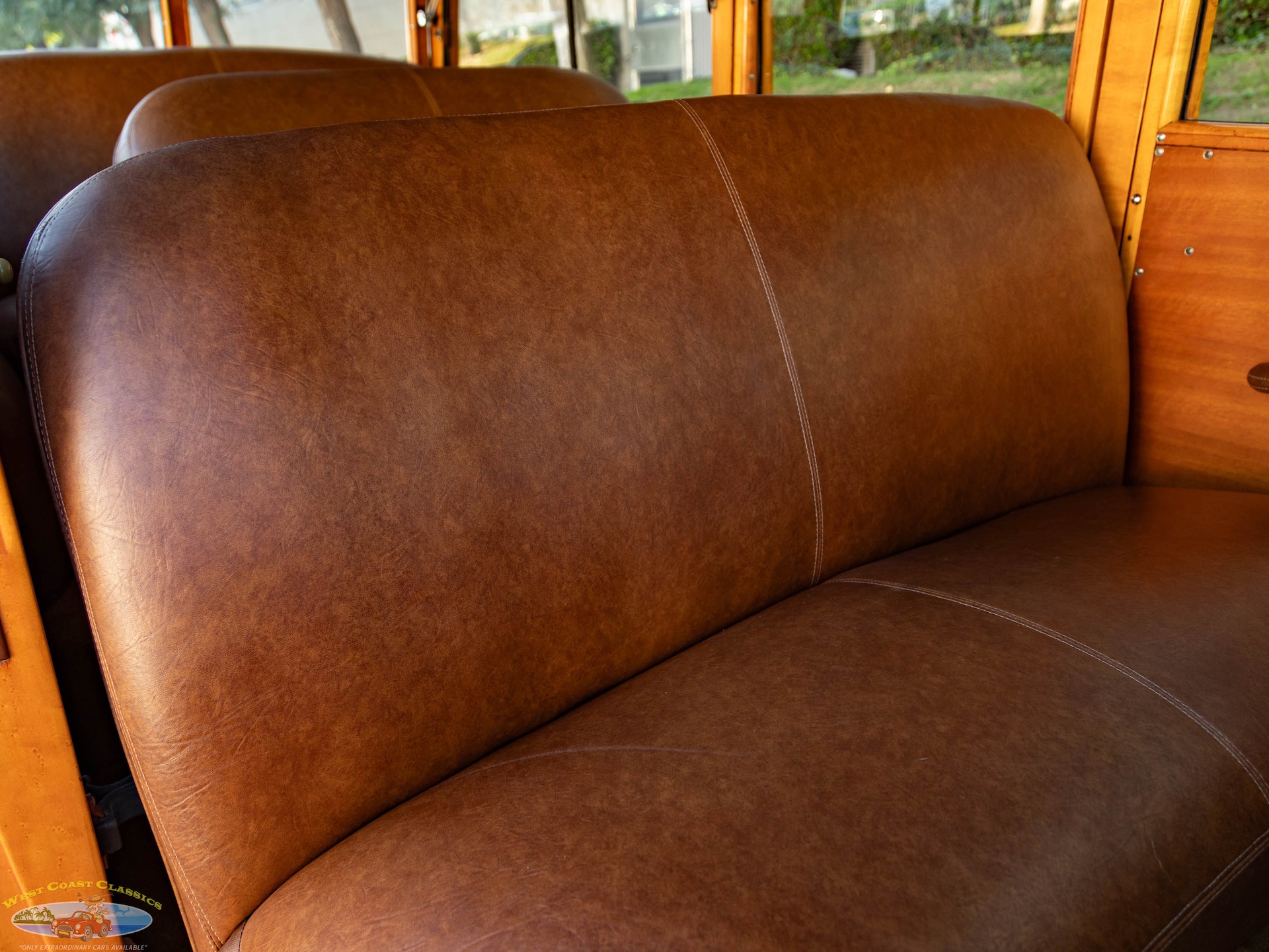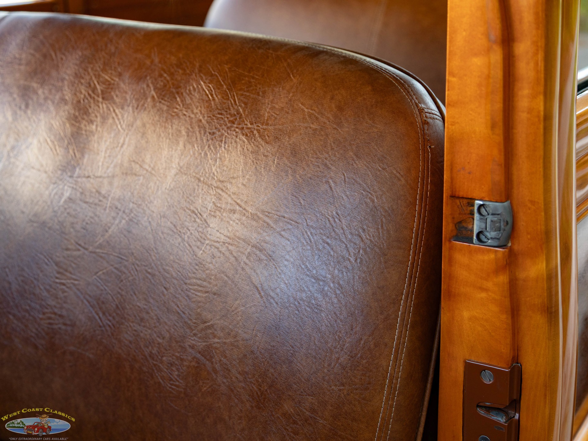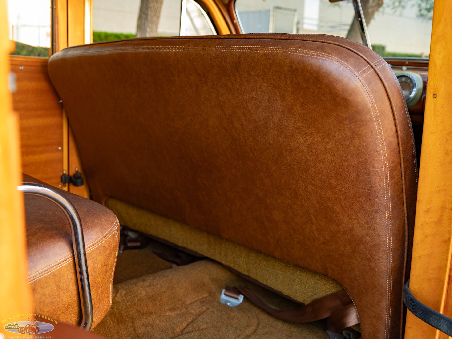 West Coast Classics is proud to present an absolutely stunning example of an all-American classic: the 1947 Mercury Eight Woody Station Wagon. This exceptional vehicle showcasing the 239 24 stud Flathead V8 engine is finished in the elegant 'Taffy Brown' exterior with original hand-selected Bird's Eye Maple woodgrain panels. The interior is equally impressive, featuring a luxurious brown leather three-row seating arrangement.