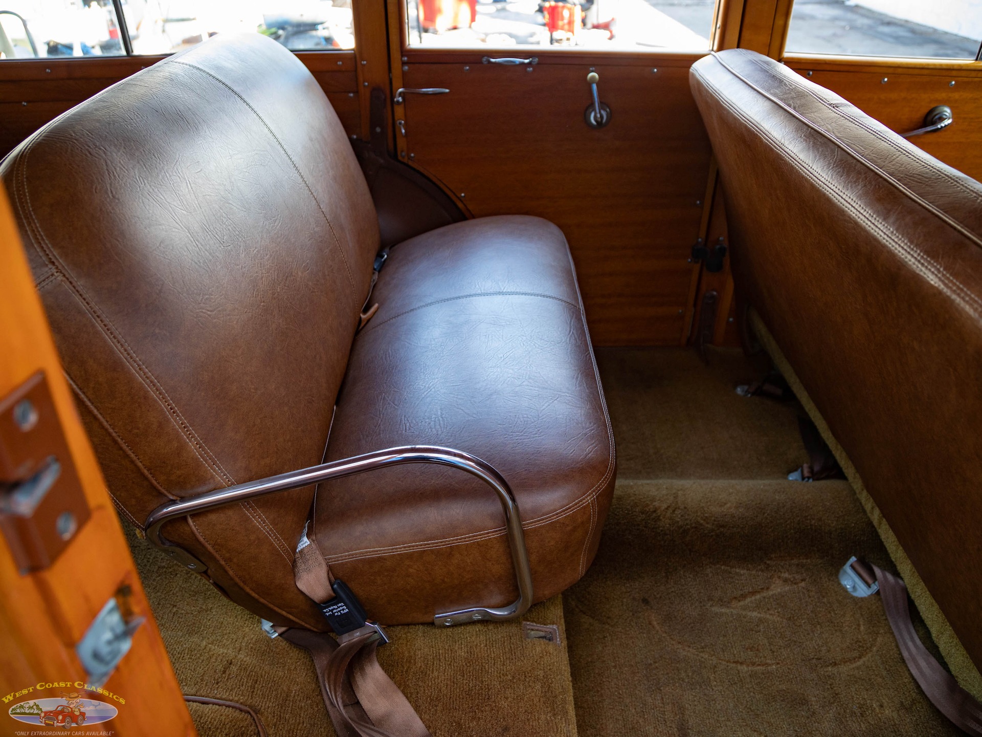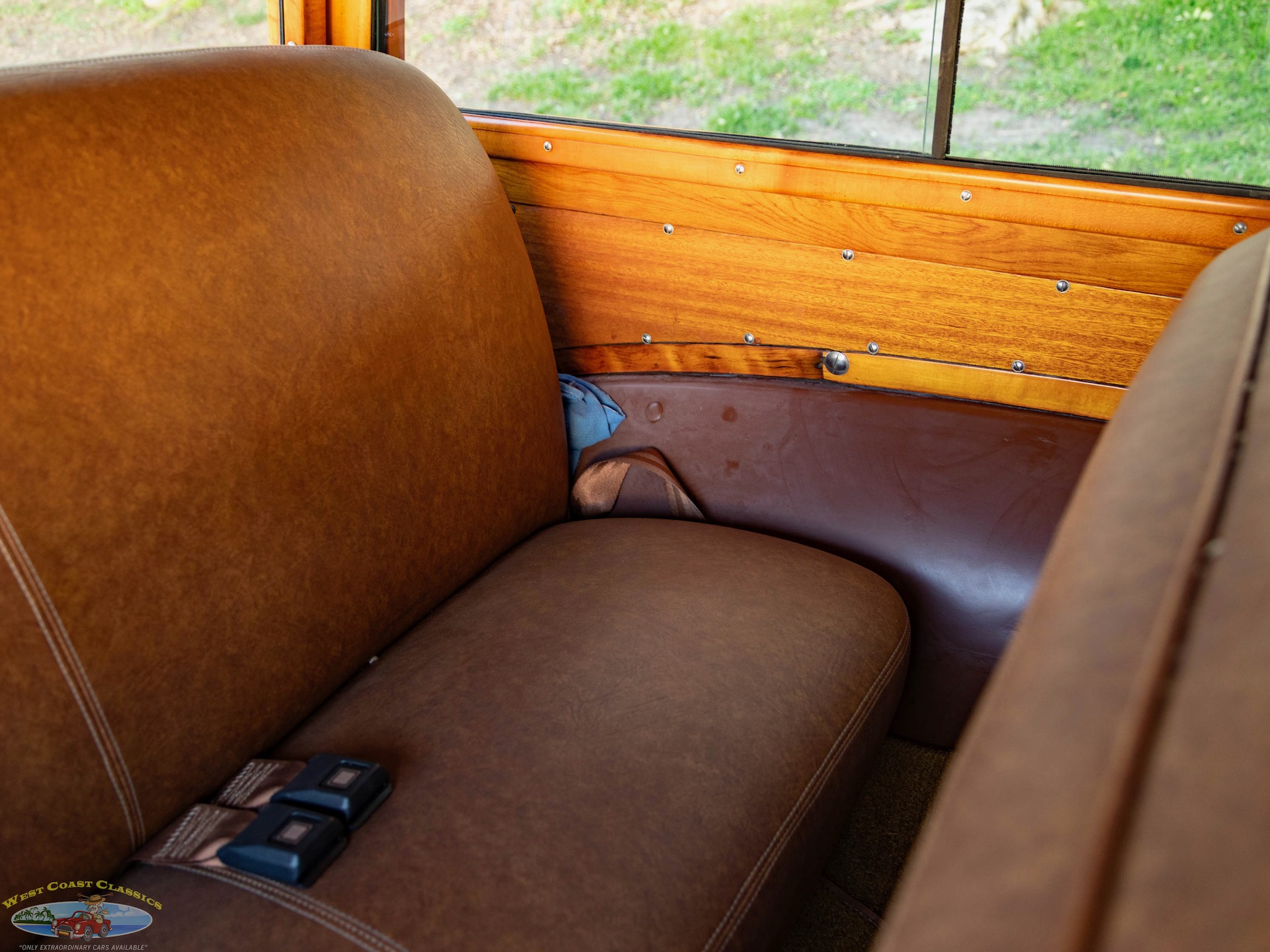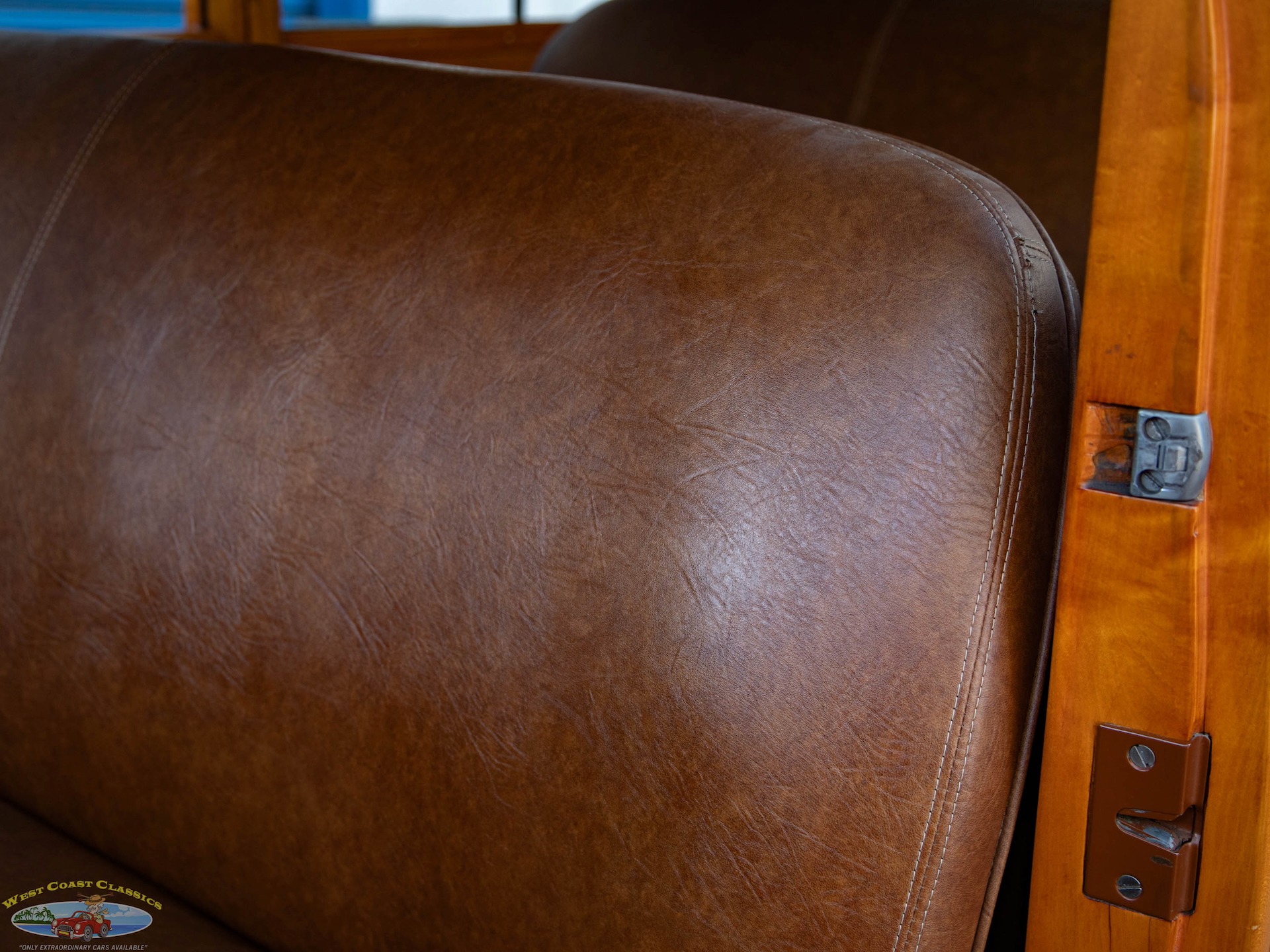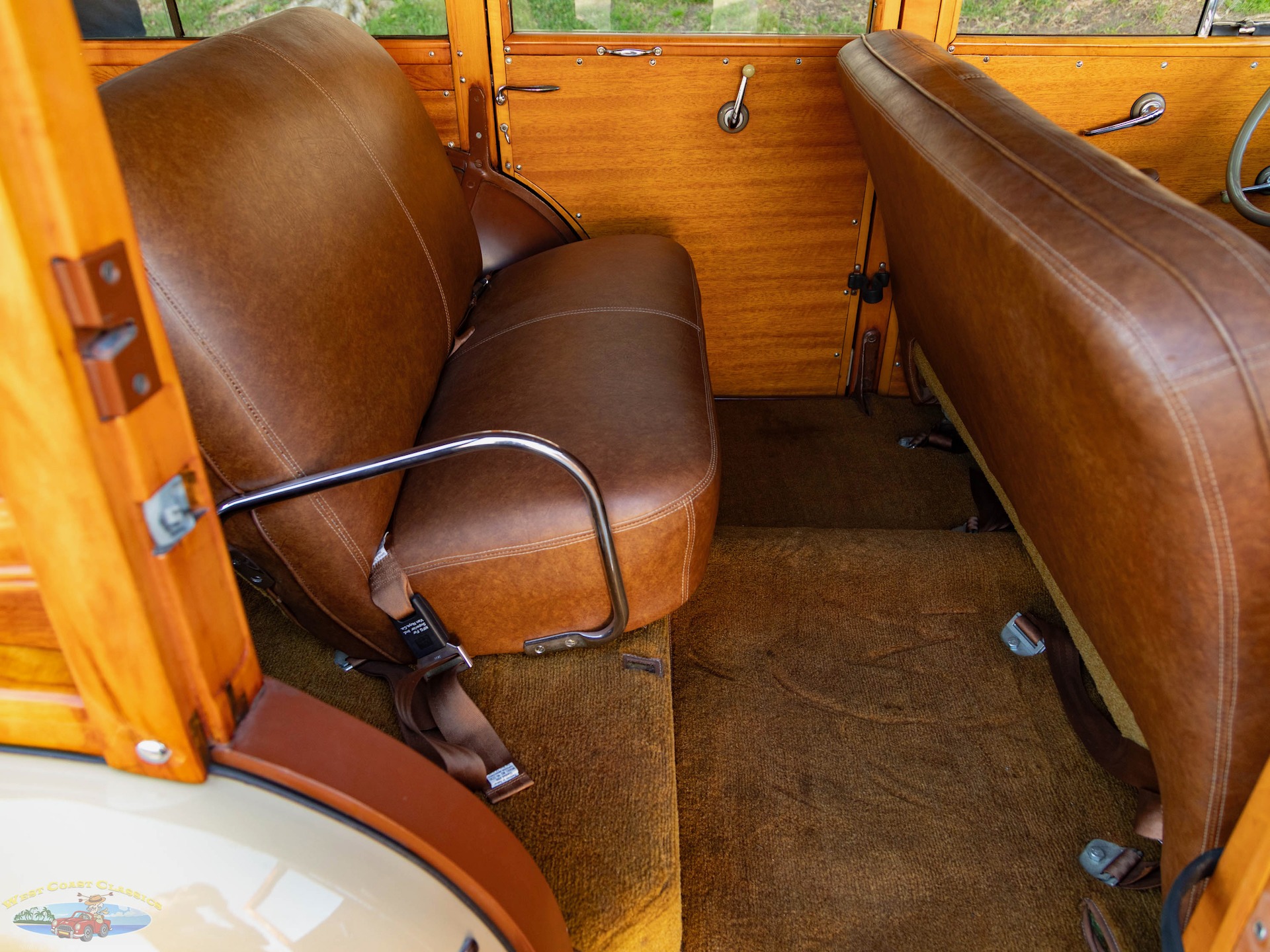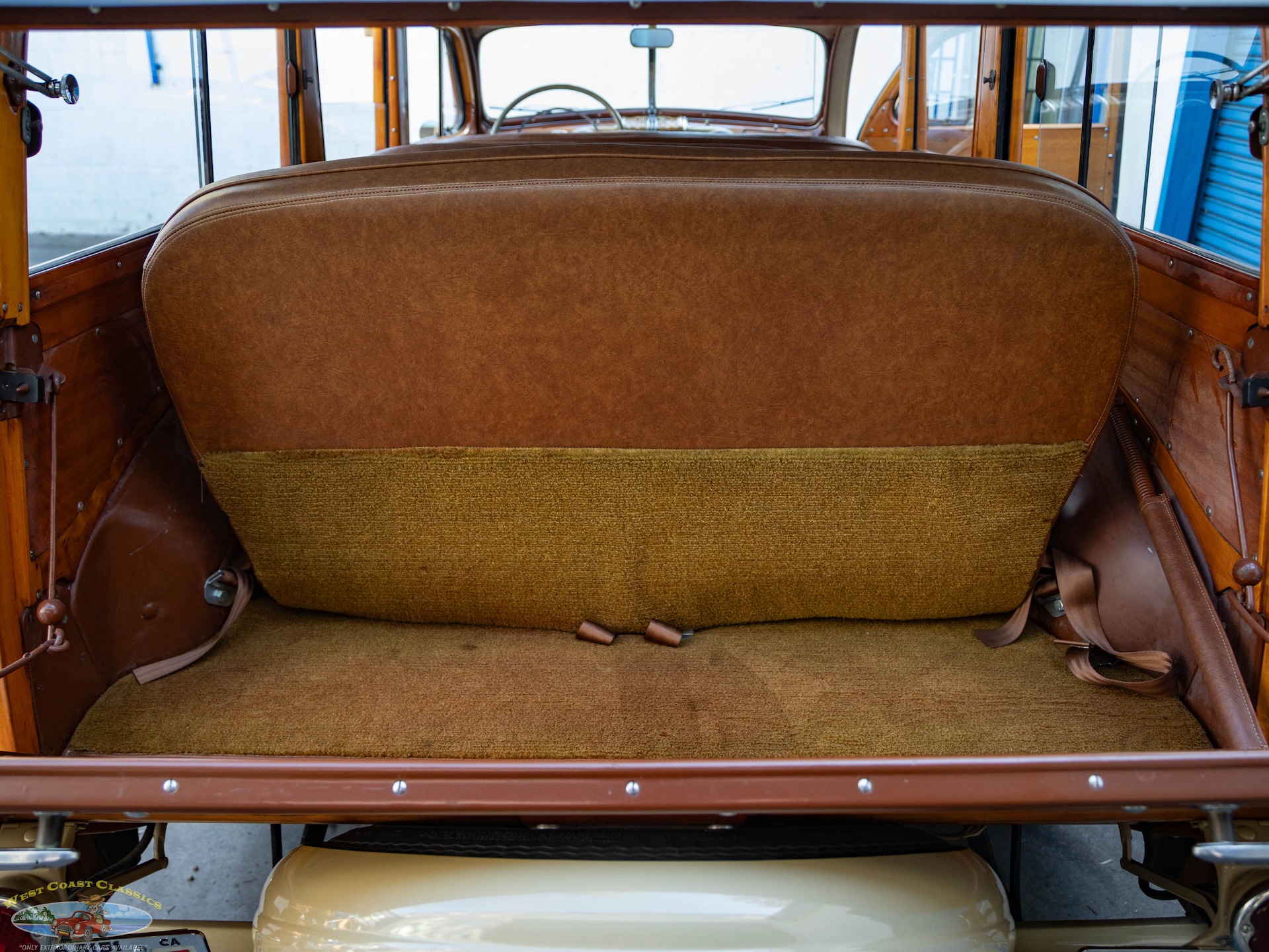 Inside, the cabin is a showcase of vintage luxury, featuring a split front bench and two rear benches upholstered in rich brown leather. The second-row seat folds down, and the third row is removable, offering versatility for passengers and cargo. The wood-trimmed door cards and ceiling, along with the refinished wood on the doors, tailgate, and side panels, create a warm and inviting atmosphere. Modern conveniences for its time include a push-button AM radio and a Merco-Therm ventilation and heating system, ensuring comfort on every journey.