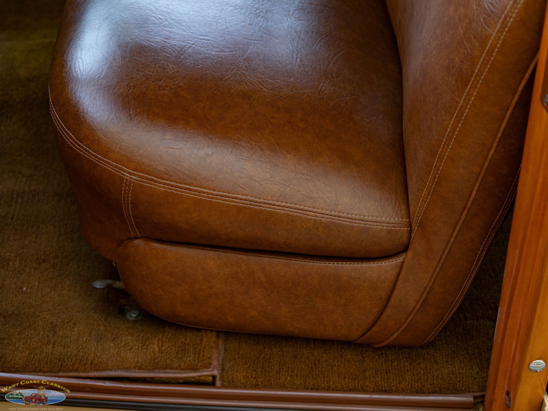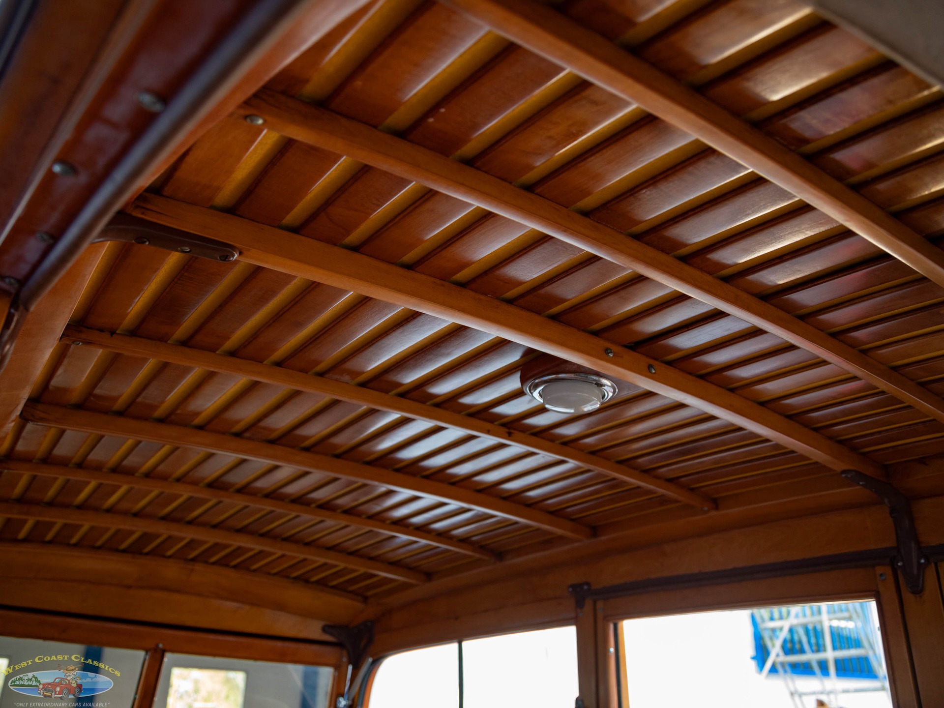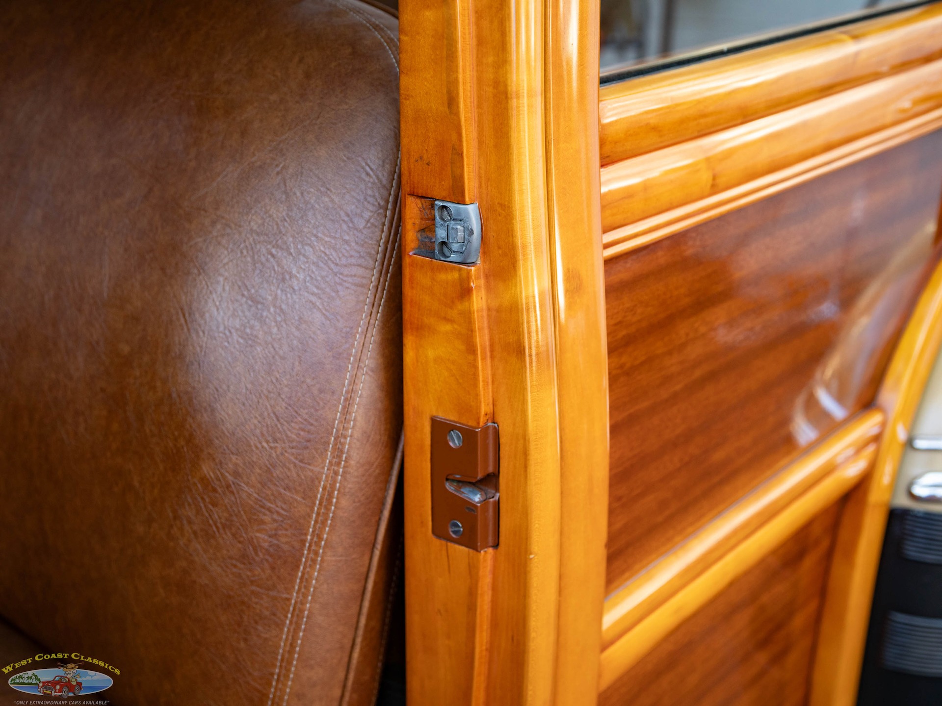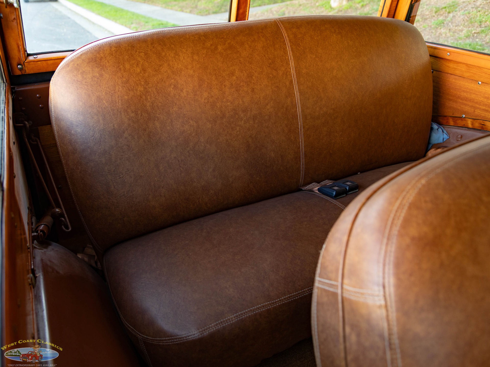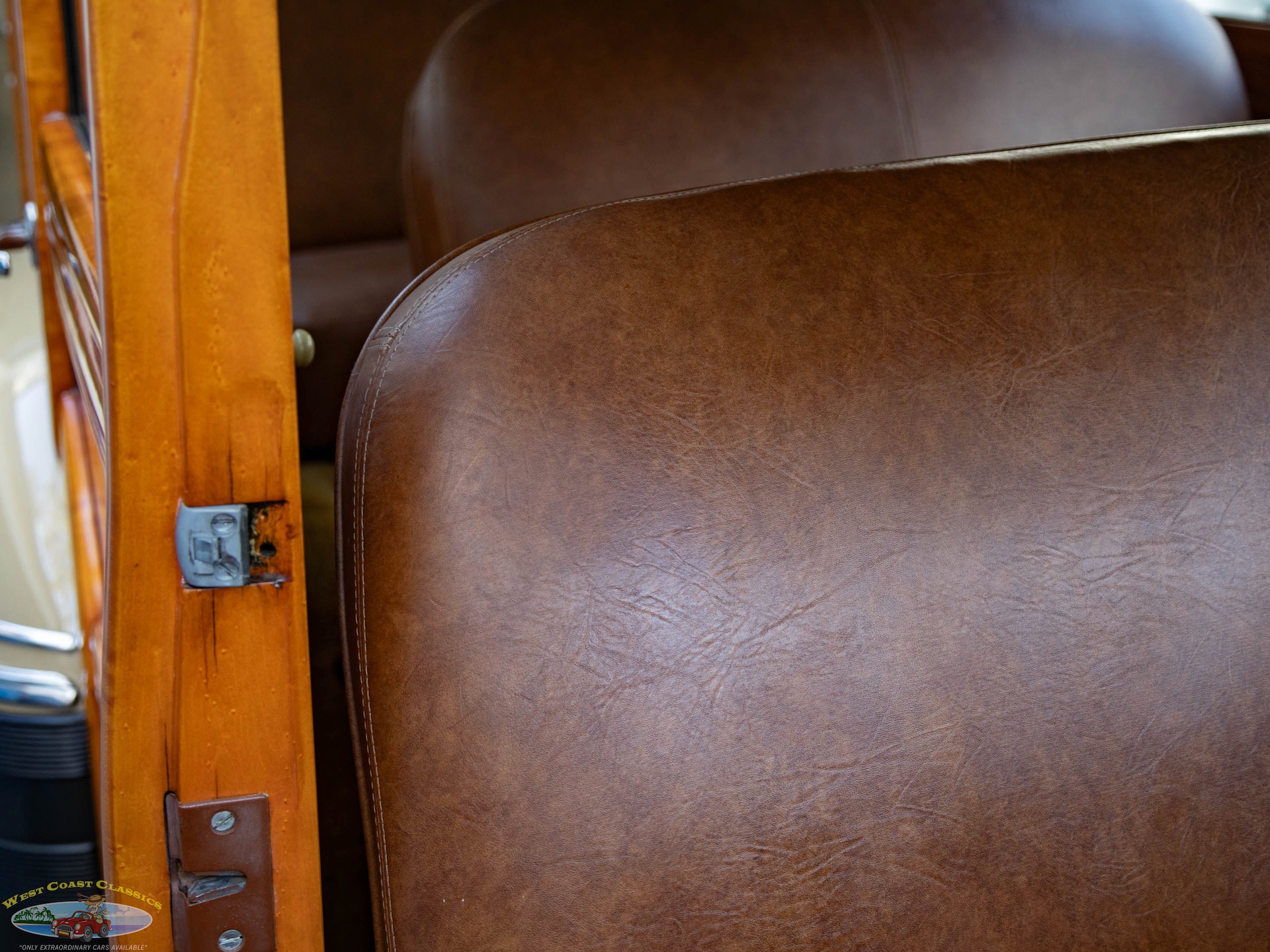 Inside, the cabin is a showcase of vintage luxury, featuring a split front bench and two rear benches upholstered in rich brown leather. The second-row seat folds down, and the third row is removable, offering versatility for passengers and cargo. The wood-trimmed door cards and ceiling, along with the refinished wood on the doors, tailgate, and side panels, create a warm and inviting atmosphere. Modern conveniences for its time include a push-button AM radio and a Merco-Therm ventilation and heating system, ensuring comfort on every journey.