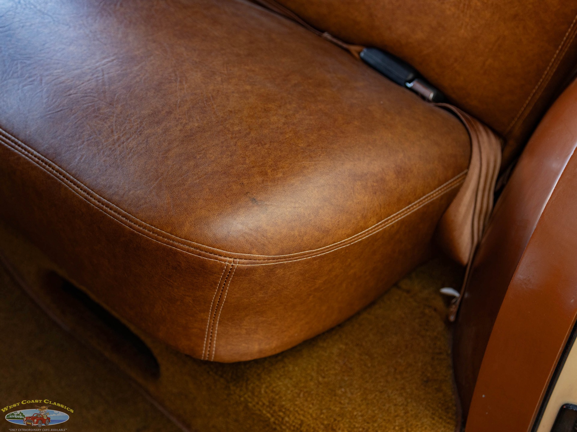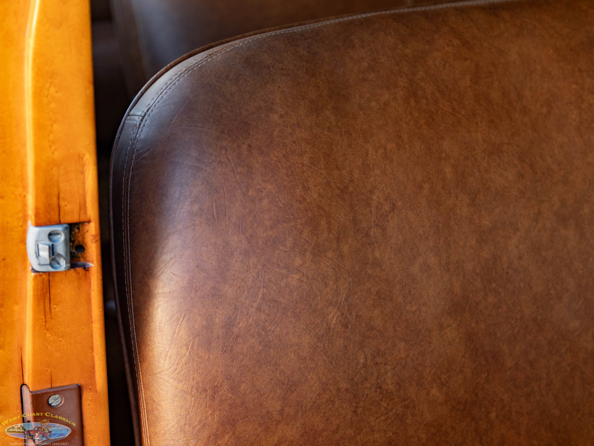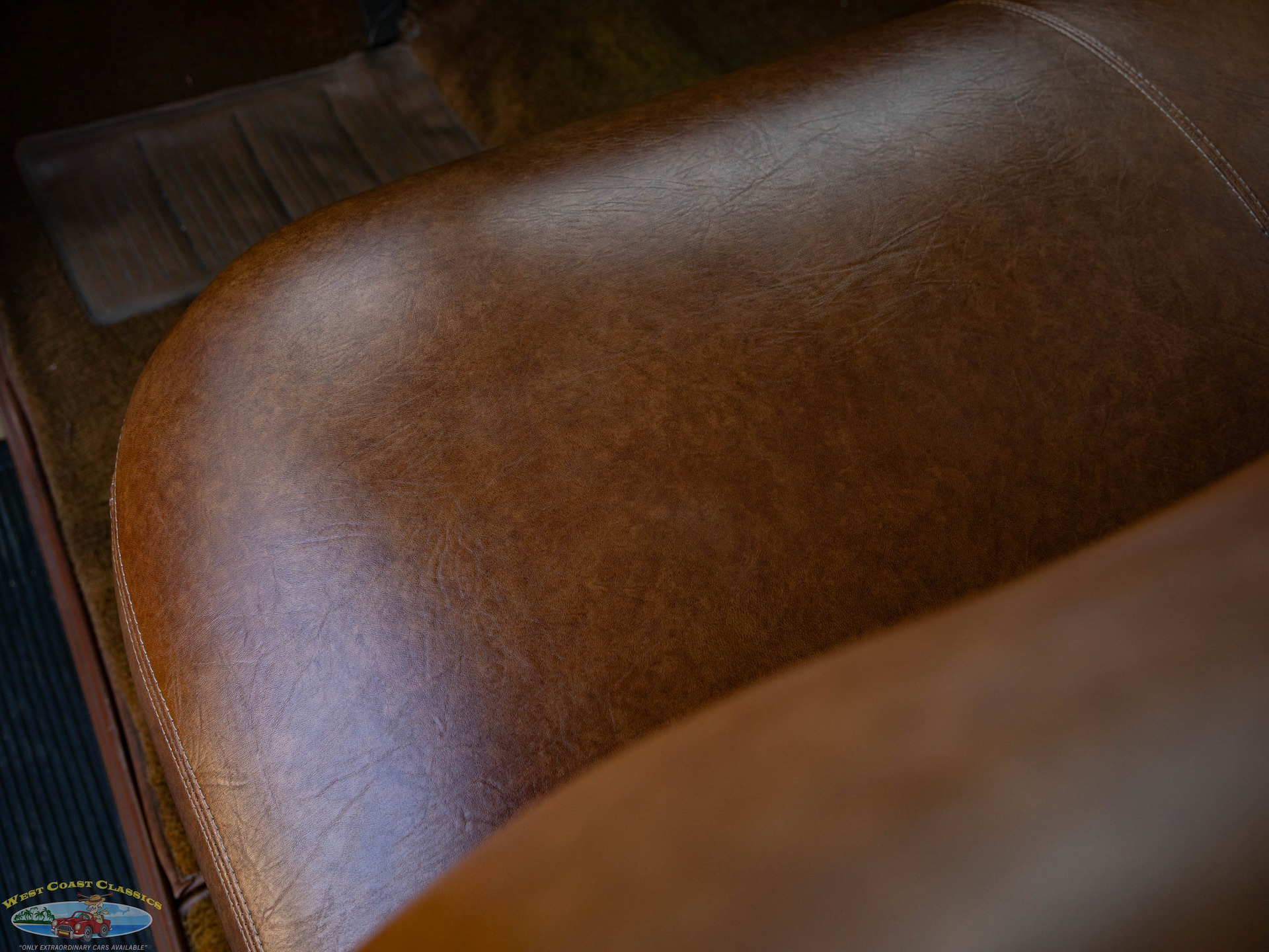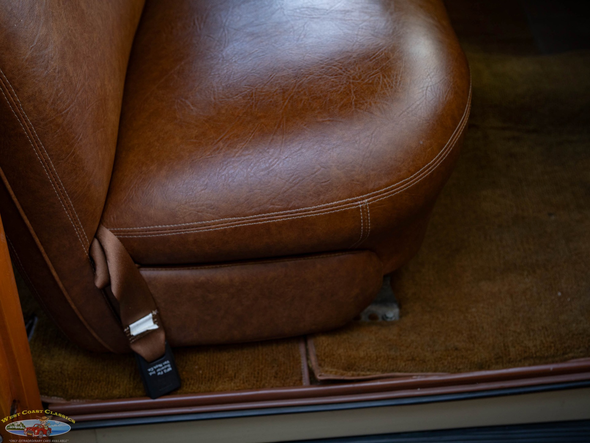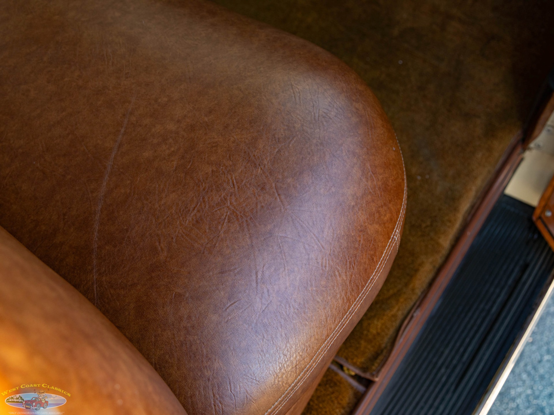 Inside, the cabin is a showcase of vintage luxury, featuring a split front bench and two rear benches upholstered in rich brown leather. The second-row seat folds down, and the third row is removable, offering versatility for passengers and cargo. The wood-trimmed door cards and ceiling, along with the refinished wood on the doors, tailgate, and side panels, create a warm and inviting atmosphere. Modern conveniences for its time include a push-button AM radio and a Merco-Therm ventilation and heating system, ensuring comfort on every journey.