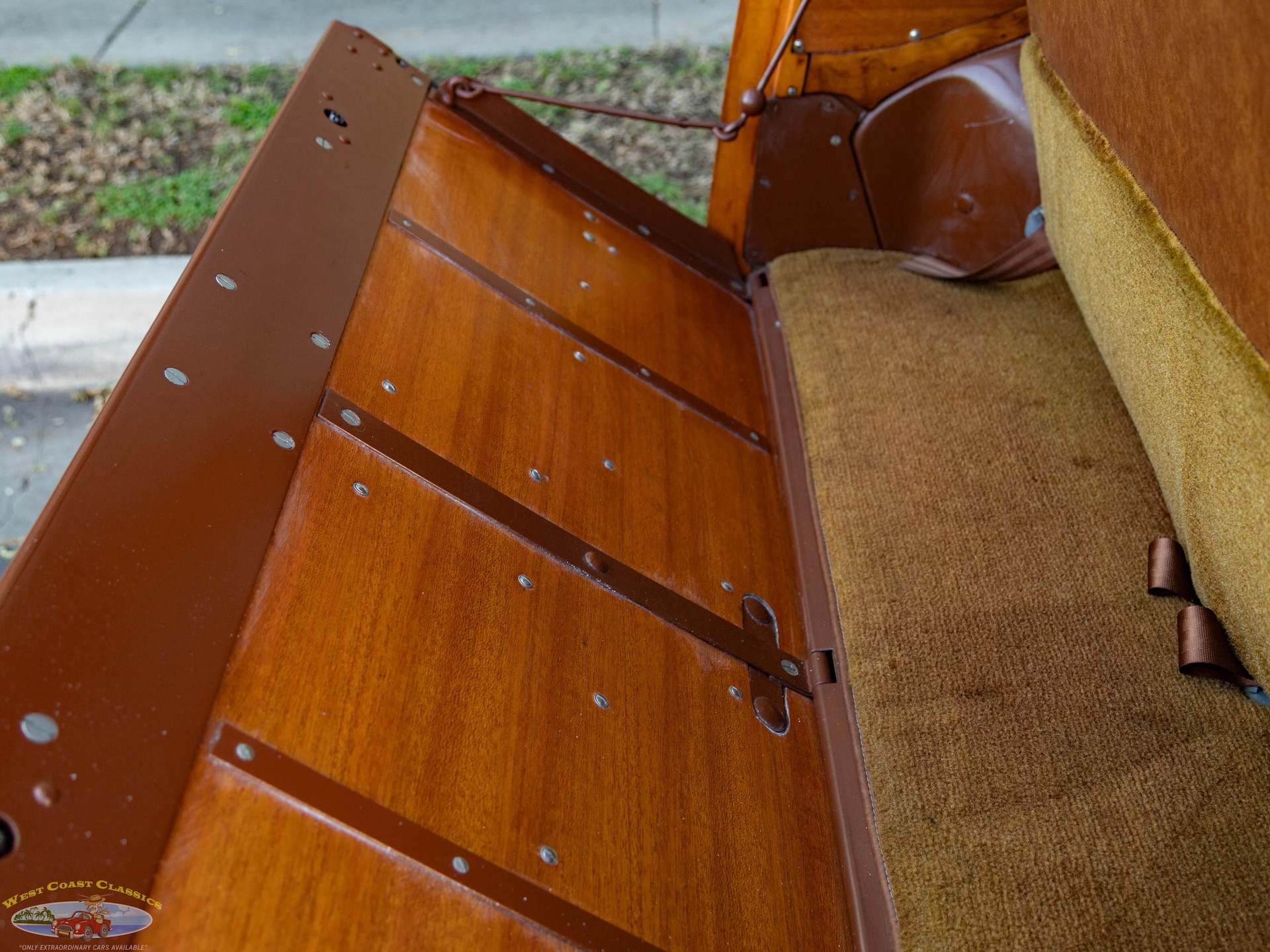 The 'Taffy Brown' exterior is complemented by the exquisite Maple Woodgrain panels, a testament to the craftsmanship and attention to detail that went into the construction of this vehicle. The original Bird's Eye Maple wood, famously set aside by Henry Ford for special projects, adds a touch of exclusivity and historical significance. The vehicle rides on 15-inch steel wheels adorned with chrome hubcaps and trim rings, wrapped in 225/75 Coker Classic wide-whitewall tires, enhancing its classic appeal.