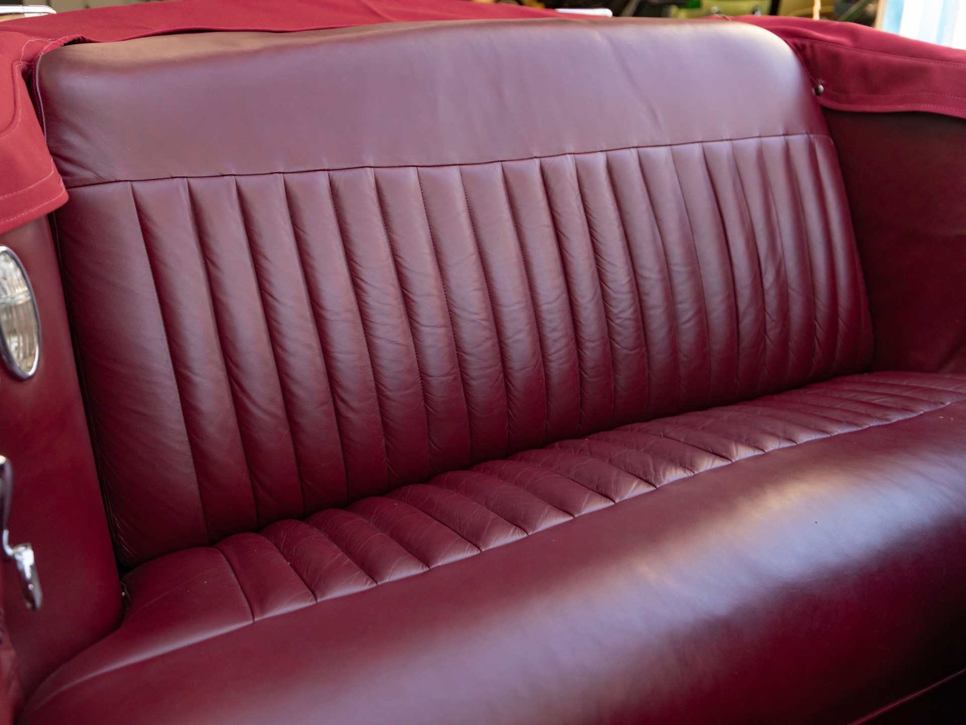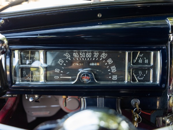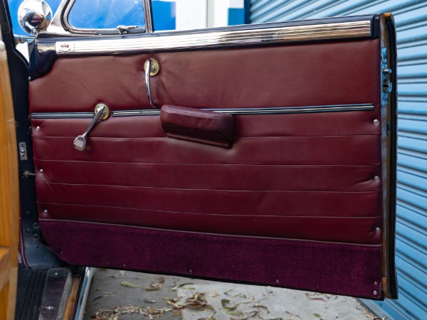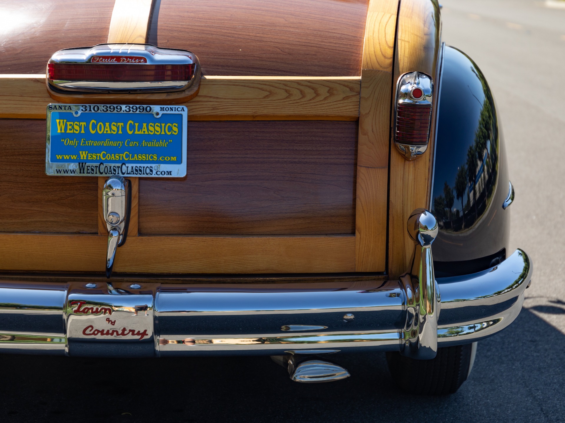 These 1946-48 years are the classic 'T & C' models most enthusiasts and collectors aspire to own. The bodies were framed with white ash, fitted with interlocking miters, and varnished to perfection. Mahogany veneer plywood filled the spaces within the framing. They feature a Spitfire Straight Eight, 323.5 cu. inch engine developing 135 horsepower coupled to a unique fluid drive semi-automatic transmission. This particularly beautiful Town & Country was an incredible all original wood and paint example prior to the painstaking nut and bolt restoration finished in the most striking of color combinations of Newport Blue with a Dark Red leather interior.