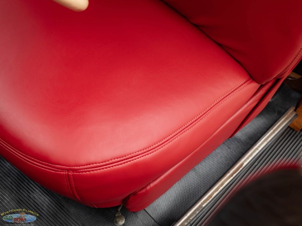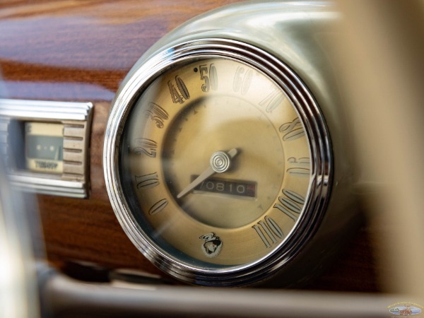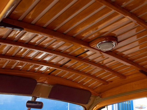 The cabin features a split front bench and two rear benches upholstered in the same all original 'Red' leather upholstery. Matching materials line the ceiling, and the doors, tailgate, and side panels are trimmed with refinished wood. Equipment includes an AM radio along with a Merco-Therm ventilation and heating system. The two-spoke steering wheel features a chrome horn ring and frames a 110-mph speedometer, auxiliary gauges, and an analog clock. The 255ci flathead V8 features a single downdraft carburetor with an offset oil-bath air cleaner. Power is sent to the rear wheels via a Merc-o-Matic two-speed automatic transmission.