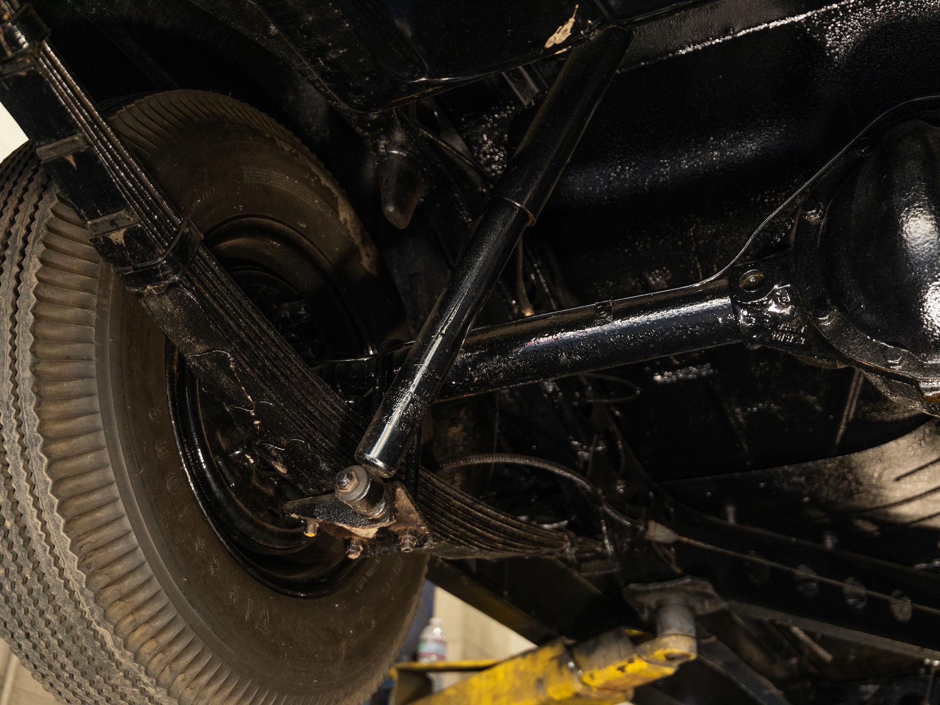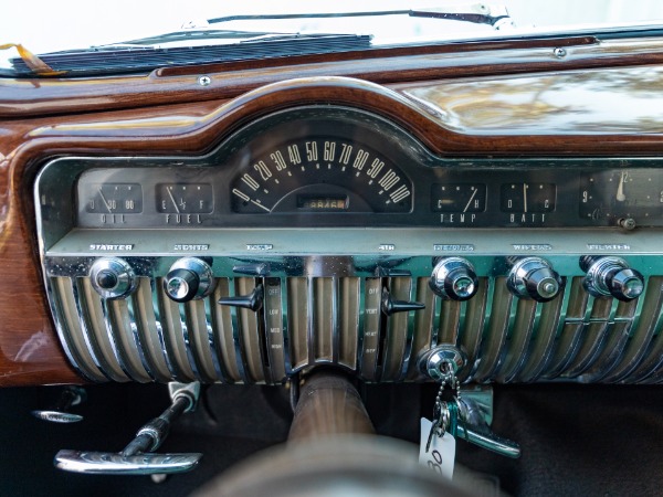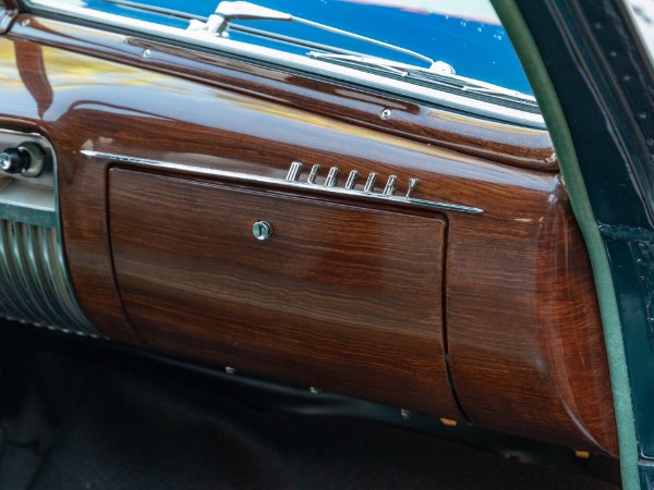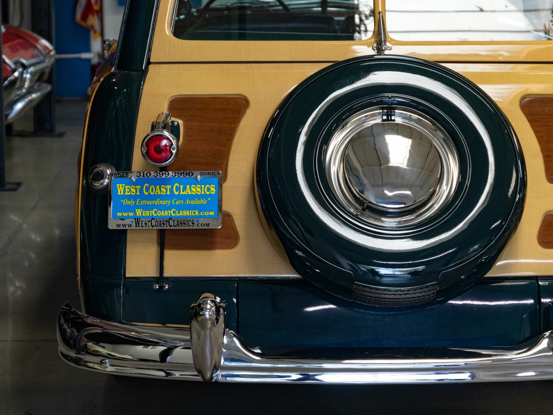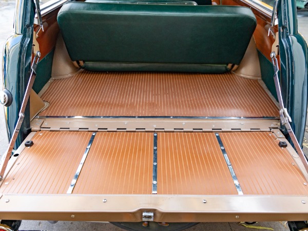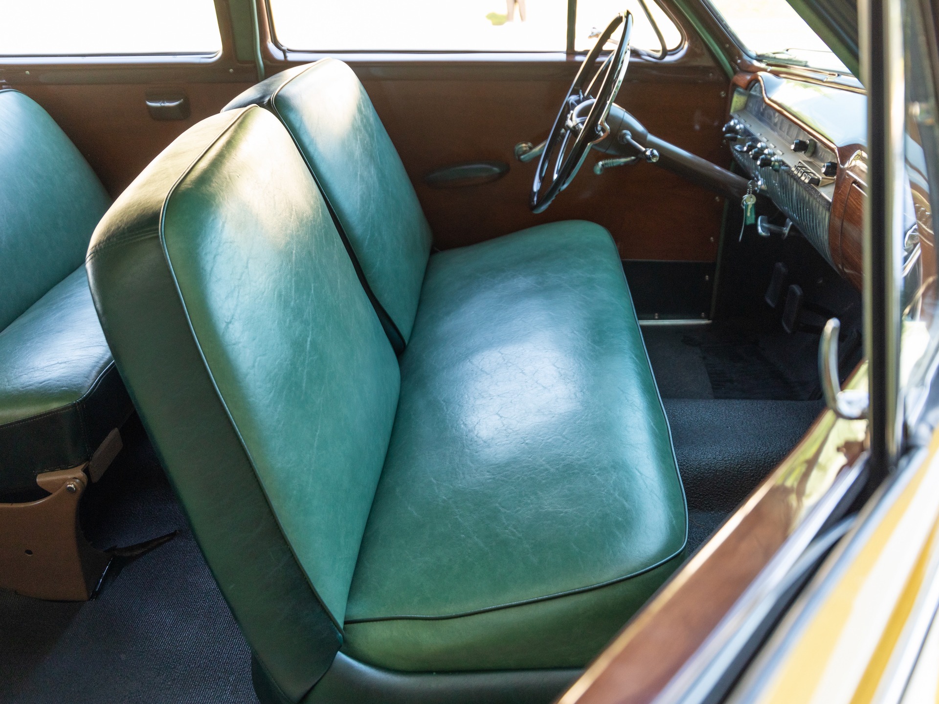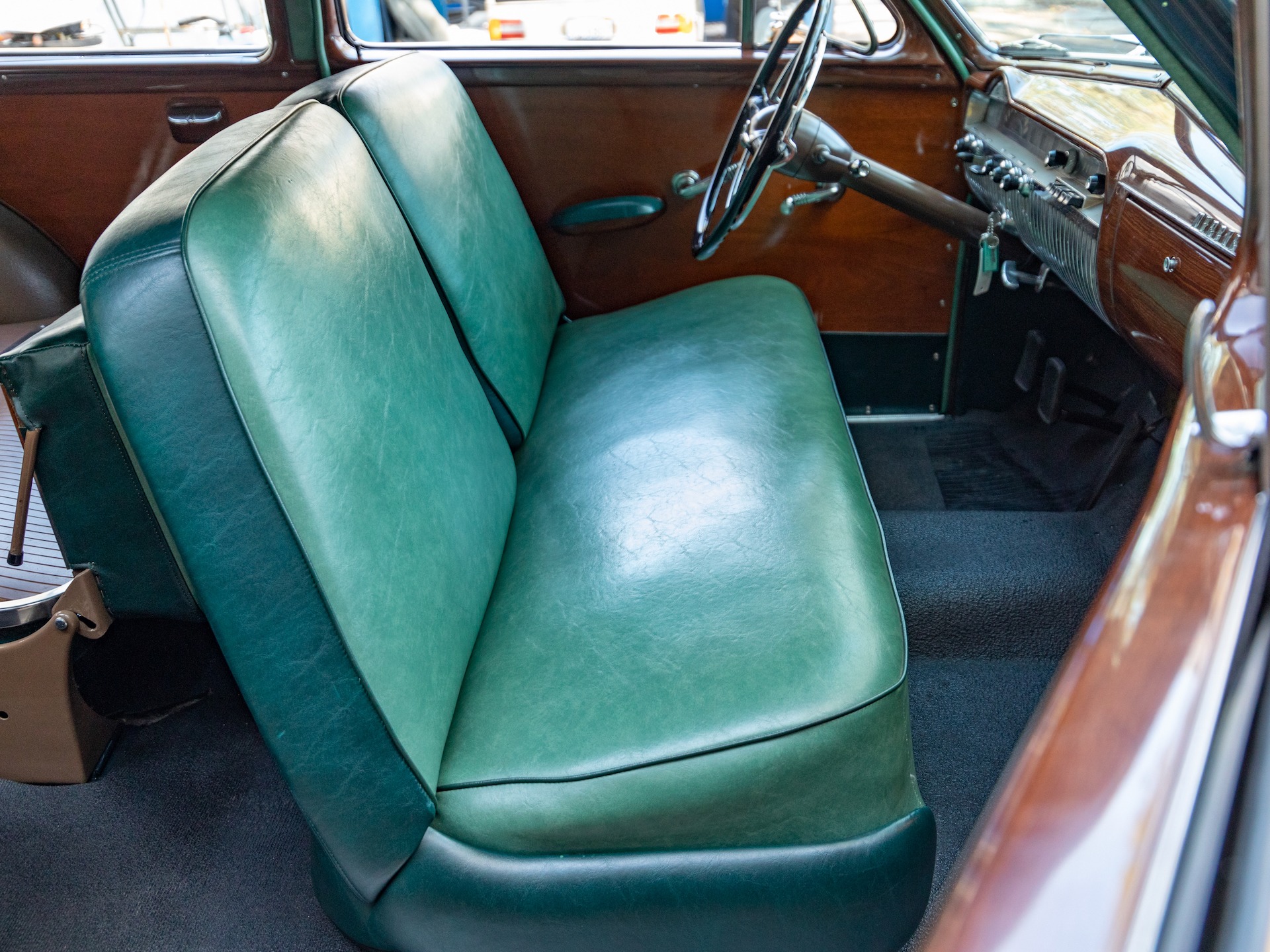 The cabin features a split front bench and two rear benches upholstered in the same 'Light Green' upholstery. Matching materials line the ceiling, and the doors, tailgate, and side panels are trimmed with refinished wood. Equipment includes an AM radio along with a Merco-Therm ventilation and heating system. The two-spoke steering wheel features a chrome horn ring and frames a 110-mph speedometer, auxiliary gauges, and an analog clock. The 255ci flathead V8 features a single downdraft carburetor with an offset oil-bath air cleaner.