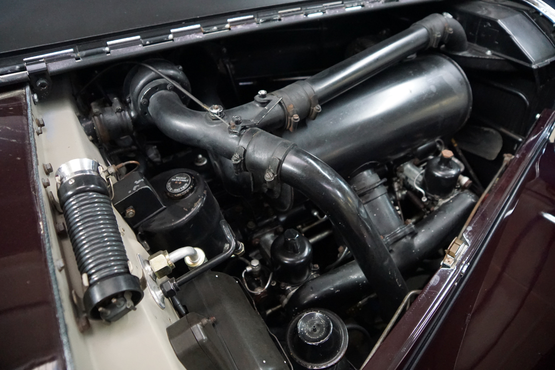 The Mk VI became the R-type in 1952; logically, it should have been the Mk VII but Crewe did not want to share its nomenclature with Jaguar. With the long boot treatment and extended rear wings (less spats), the R-type had a more graceful profile than its predecessor, with a liftup aluminium bootlid giving access to the significantly increased luggage space, up from 6 to 10cu ft. Its styling modifications were attributed to John Blatchley, later responsible for the Silver Cloud and the Silver Shadow. The car rode on a massive separate chassis using leaf springs at the rear and featuring independent coil springing at the front, quite an impressive advance for the marque in this period. A control on the steering wheel center adjusts the hardness of the rear springing by hydraulically adjusting the rear dampers. This is achieved via opening a check valve that provides pressure by diverting transmission oil to the dampers. A pedal-operated central lubrication system type 'Bijur-Girling' allows oil to be applied to moving parts of the suspension from a central reservoir by using a foot pedal