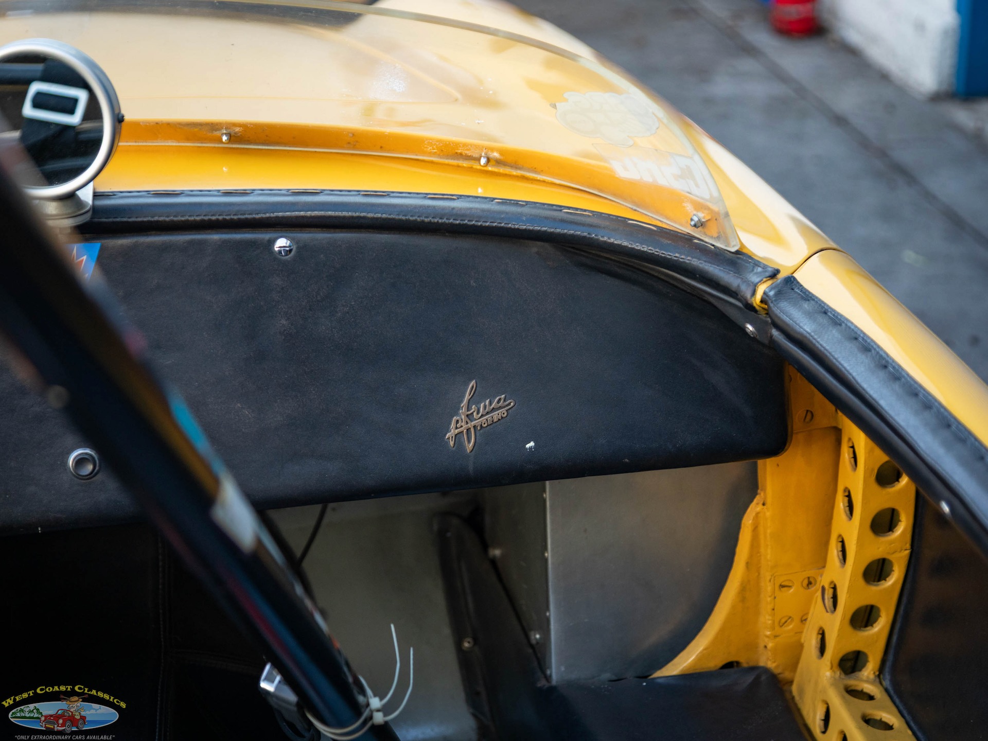 Note Pietro Fruas logo on the dashboard. The tube chassis features an independent front suspension utilizing Fiat Topolino components, as well as a leaf-sprung solid rear end. Braking is managed by 4-wheel hydraulic drums, though no master cylinder, lines, or hoses are currently installed. Dry weight when the car is assembled is reported to be approximately 1200 pounds.