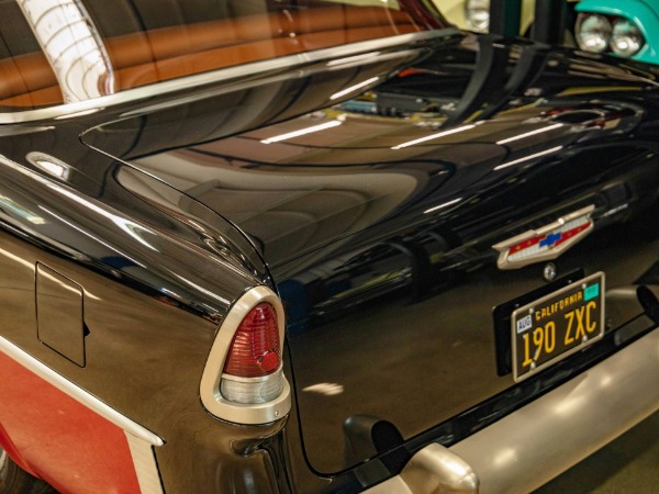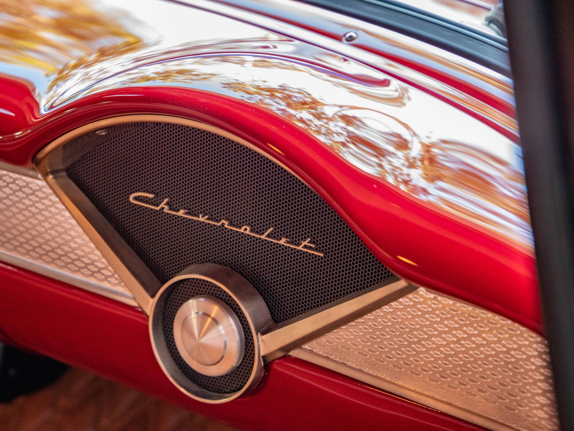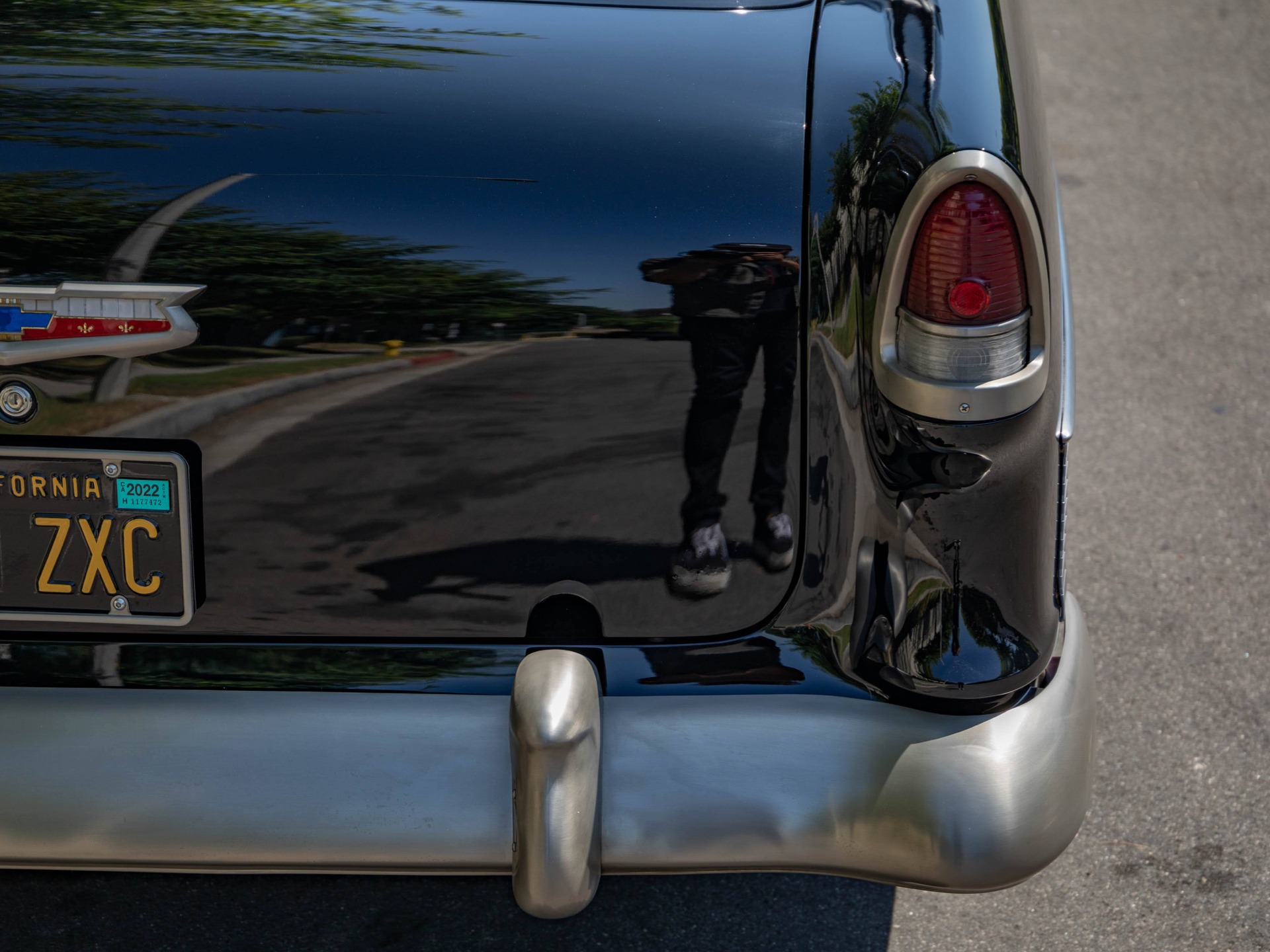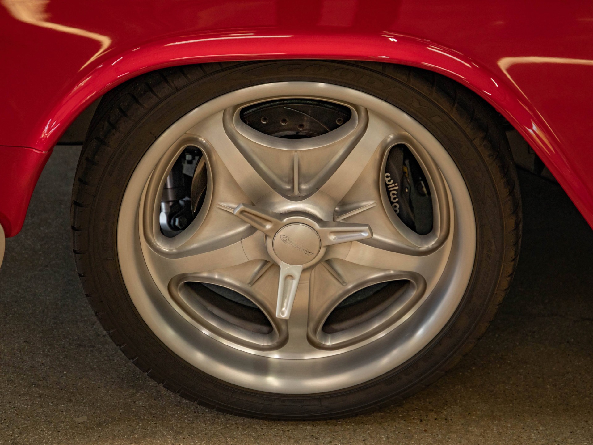 The chassis is based on a stock '55 with the rear C notched to accommodate the custom crossmember for the Ride Tech (Jasper, Indiana) airbags and Shockwave 8,000s. Other rear modifications include literally the rear - a Ford 9 inch with 3.50 limited slip gears, 31 spline axles, triangulated four bar and Wilwood (Camarillo, CA) four piston calipers with 12 inch slotted rotors that complete the rear brake system.