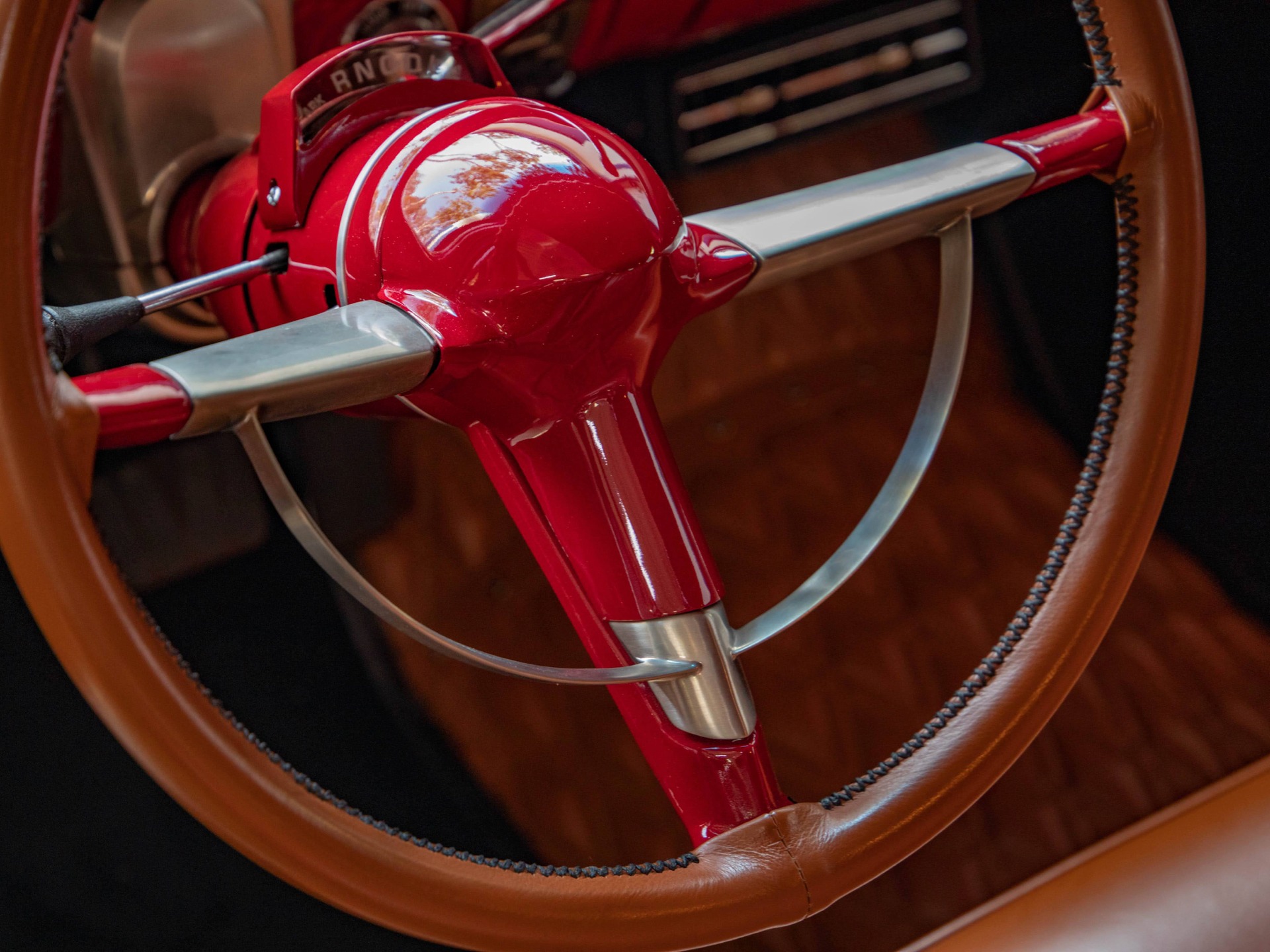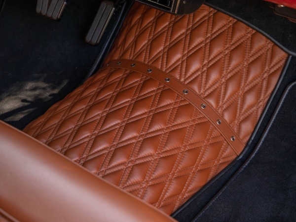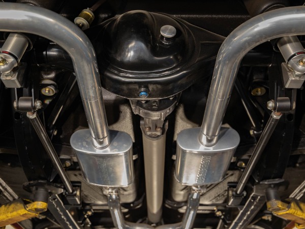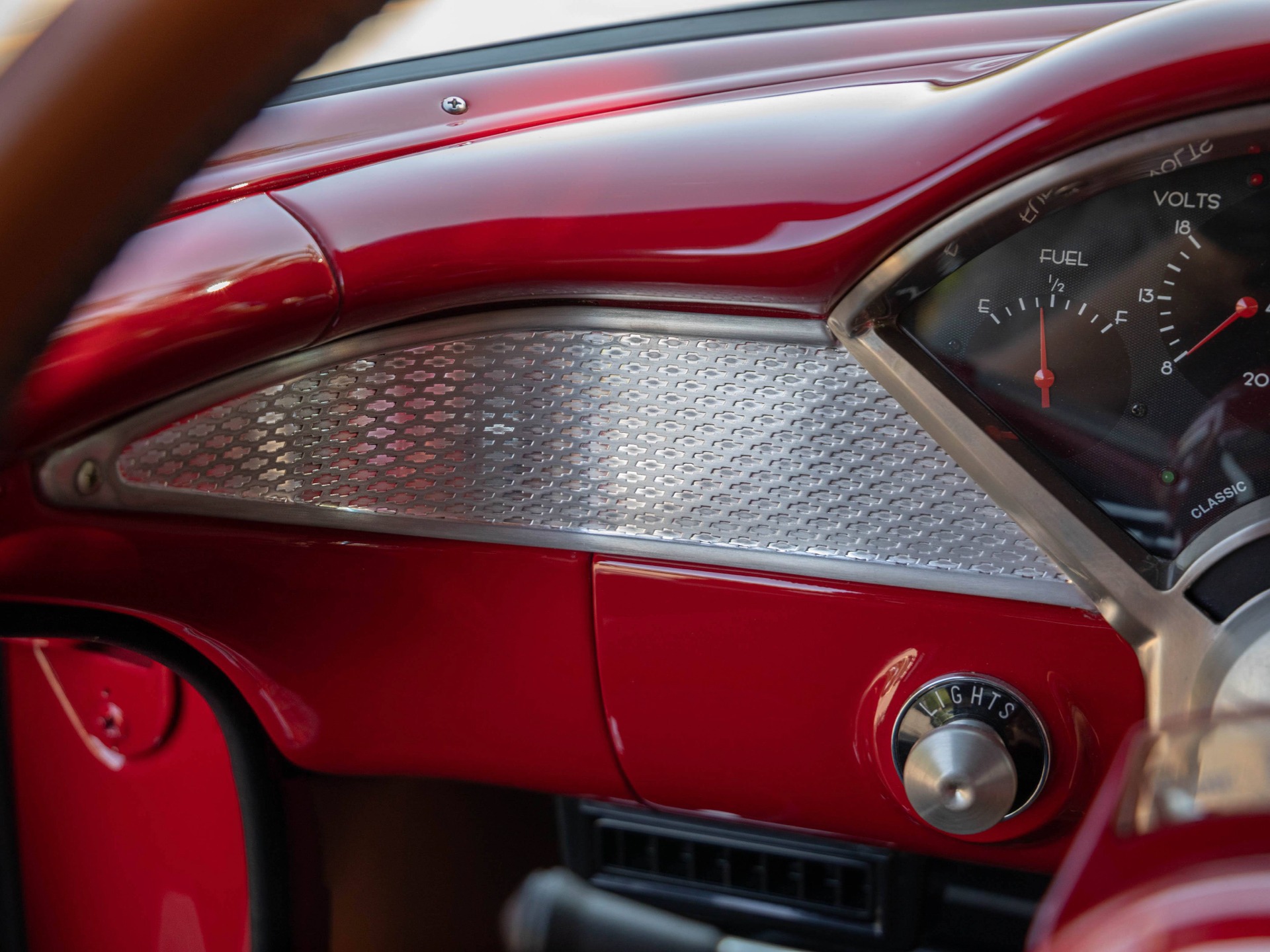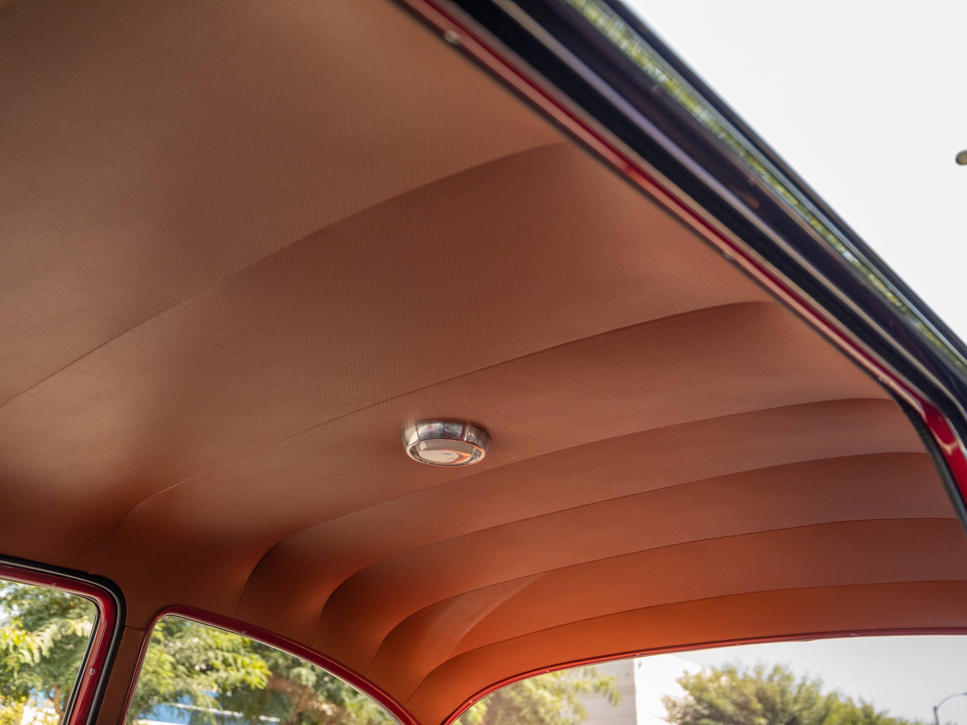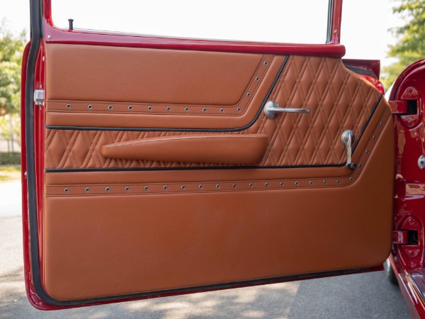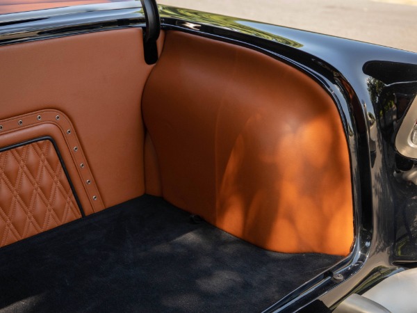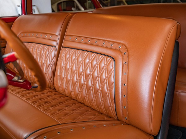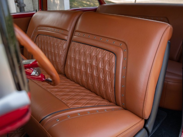 The interior utilizes a stock dashboard with 'Classic Instruments' gauges set into brushed nickel insert. Wiring was handled by Huey Weatherbee while the wire comes from American Autowire. A stock front seat is retained while a custom rear bench was scratch built by Fast Ed Brescia. The seating and door panels are covered in Cinnamon & Black Scottish leather in a double diamond pattern with Black Mercedes valor carpeting, all by Fast Ed. The leather seatbelts are adorned with nickel plated grommets and the Scottish leather is again used for the perforated headliner.