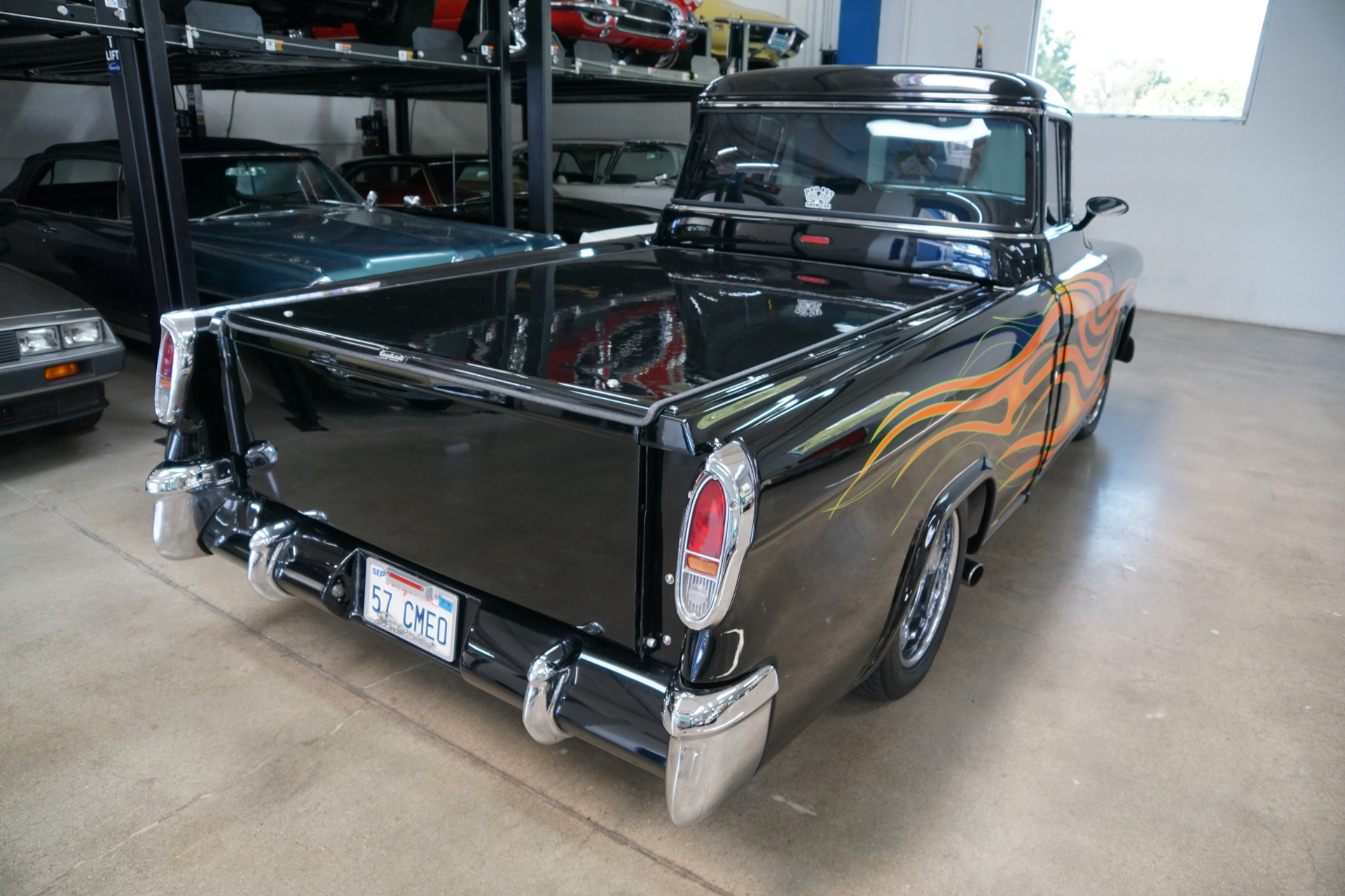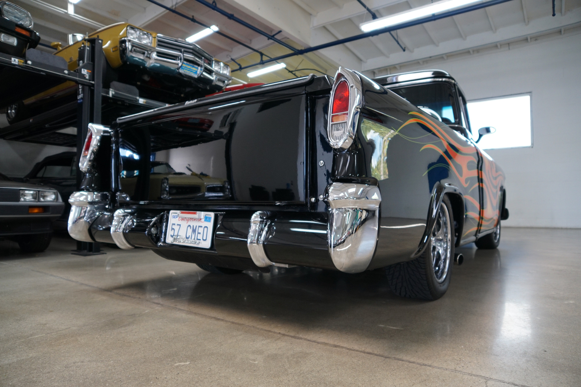 West Coast Classics are proud to present an absolutely exceptional Pro Street modified and boxed one off custom example of this 1957 Chevrolet Cameo 1/2 ton Pick Up Truck with a built 383 stroker blown engine with reportedly over 650HP which is obviously ridiculously powerful for this truck so beware! The truck is mated to a custom built Turbo 350 with AUX trans cooler automatic transmission with a B&M ratched floor shifter, Ford 9" rear end, 4 wheel power disc brakes, power steering, power windows, power locks, remote doors, power antenna, custom leather & tweed seats, 17" Custom Boyd Coddington Performer Billet chromed wheels on both sides with hidden valve stem inside of wheels, Vintage AC, Heat & defrost, custom radiator, custom air cleaner, solid Oak bed, arch leaf suspension with custom heavy duty Firestone air bags with remote fill by Allpro, 2 X 12V batteries, custom gauges & steering wheel; just a beautiful and unique and completely customized and painted by one of the most respected artists in the industry in Black with 'Indian Tribal' graphic flames and yet an instantly recognizable example of the legendary Cameo Pick Up with wraparound rear window and only very few miles since being restored and reportedly previously owned by a legend in the industry and in any case a very well known and high profile show truck!