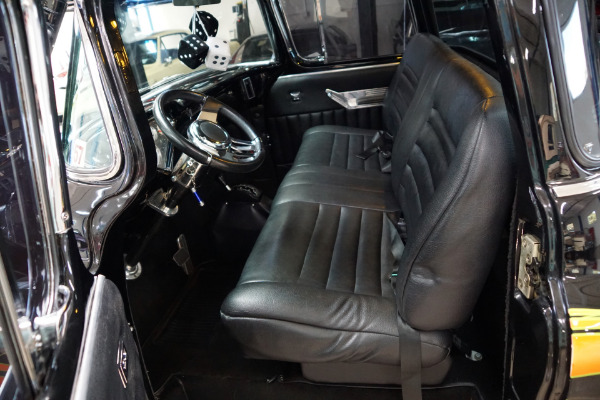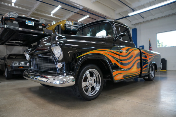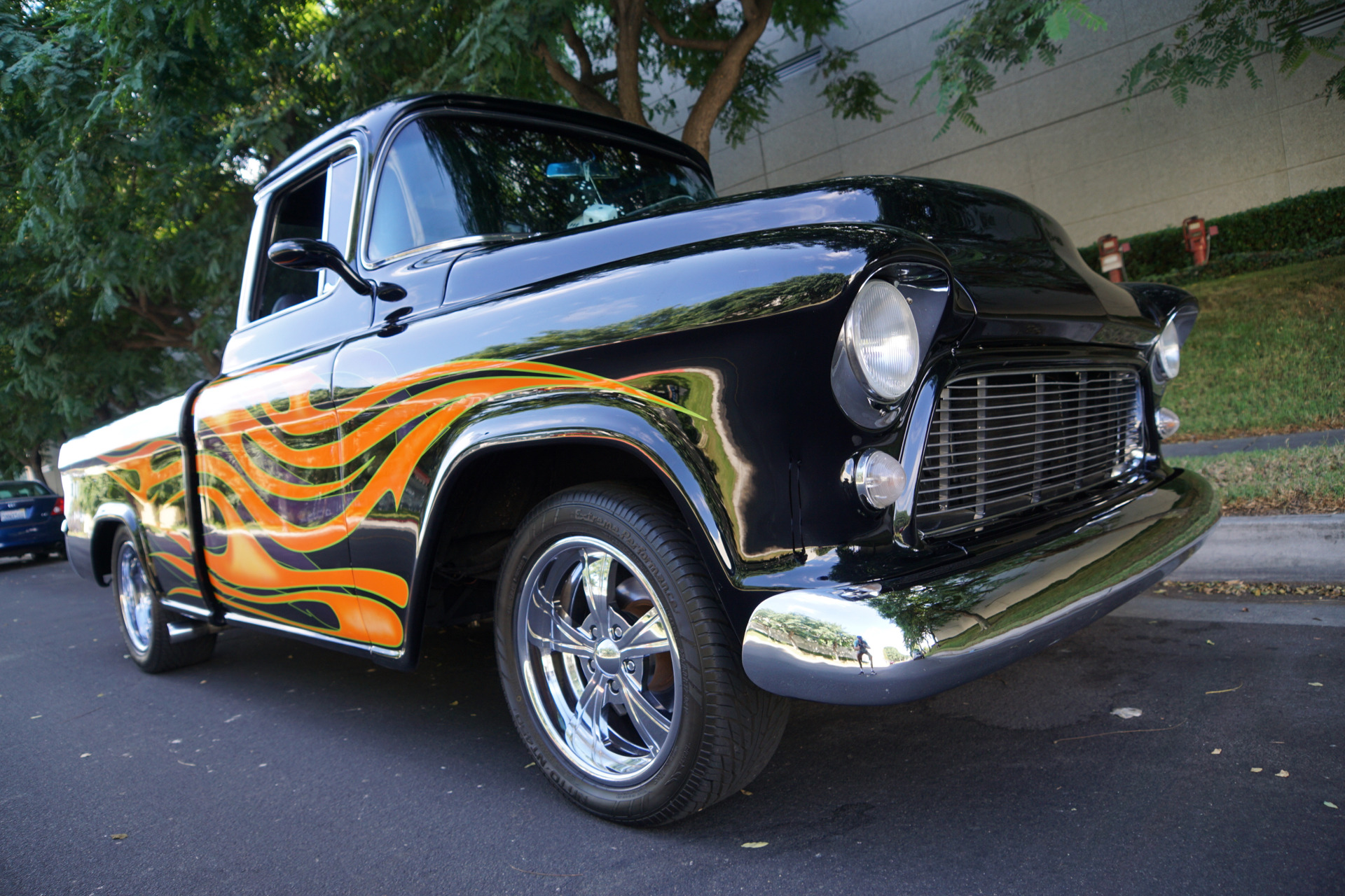This engine and drivetrain combination was built to be both supremely powerful yet manageable on the street. There's no overheating worries and maybe the custom made aluminum radiator from 'Mattsons' in Stanton, CA is part of the reason! Nothing too wild was done with the body, but a few nice touches by 'Specialized' enhanced it immensely. First the driprails were removed, and that's no easy task! Then the doors were radiused, the reverse-opening hood was bolted on, a billet grille was installed and a custom core support was fabricated. The body was filled with no trim, a built smooth filled firewall & inner fender wells and bumpers and a third brake light were added. Jag style headlights were mounted inside the '55 front end buckets. The paint was completed at the renown 'Autocrafters' in Torrance, CA with a base Black with master painter Rick Leos and Eduardo 'Lalo' Hernandez completing the wild custom 'Indian Tribal' flames. The custom hood opens in reverse and was engineered by 'No Limit Engineering'. A custom 16 gallon gas tank has been installed under the bed with a fill through floor mechanism. The fiberglass bed of the truck with a custom tailgate has a solid oak wood floor that was left over from the 1906 San Francisco Fire which is coated with high gloss polyurethane. A custom bed cover with locking mechanism is by 'Gaylord' protects it and is painted to match.