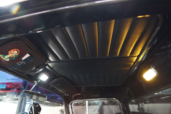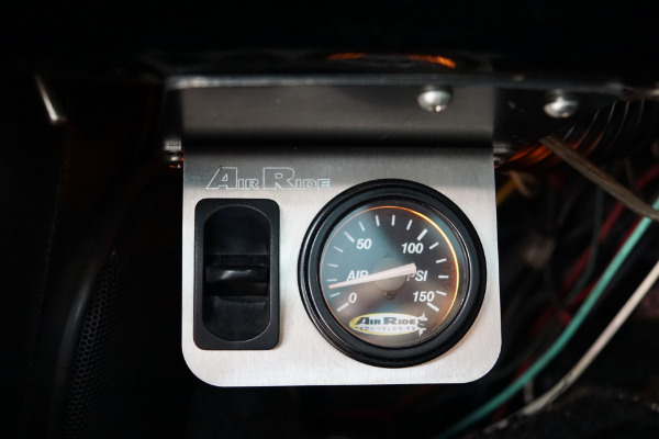 For the interior 'Fiber Tech' in Huntington Beach were hired and they opted for BMW ultra soft leather in Black with Tweed upholstery by 'Touch of Class' for the seats and a custom made headliner and all interior wells were filled ground smoothed. A Flaming River steering column to give the driver a lot of adjustability was topped with a Flaming River steering wheel wrapped in leather. The dash was customized by 'Specialized' with a bevy of Auto Meter gauges installed. The wiring was completely redone with 'Quickwire' products with all connections soldered for ultimate reliability and labeled and with the fuse panel relocated behind the rear seat for easy access. The glovebox remained functional and the entire floor was covered with a heatshield to keep the cab cool. The windows and antenna are power and the doors handles have been shaved and are electrically opened by remote control as are the power locks and the custom light system under the hood. The truck has 2 x 12 volt batteries. The main battery powers the ignition system. The housing was custom built and is located under the floor of the passenger seat. The auxillary battery powers all other electrical units and is custom mounted under the undercarriage on the passenger side. Both batteries are charged automatically by an isolator and a CTek charger that automatically keeps both batteries fully charged. There is also a custom hidden hitch behind the rear license plate and there are two hidden kill switches.