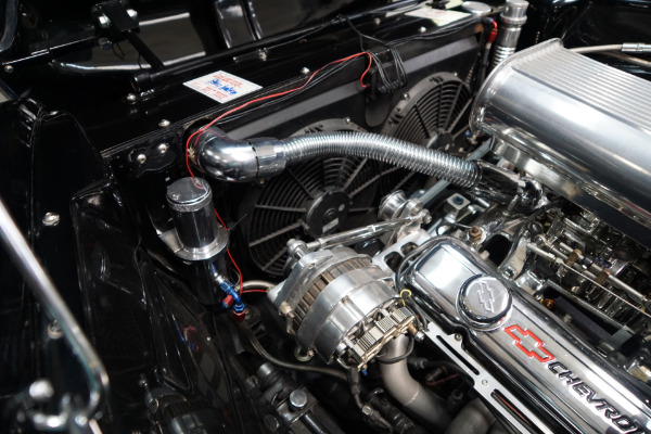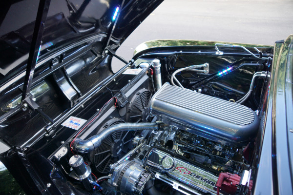 The engine compartment was completely detailed before the powerplant was then dropped between the framerails, a 383 stroker Chevy engine with a big 'Mooneyham and Sharp' 6:71 blower supercharger, built by one of the most famous hot rod shops of all time, 'Blair's Speed Shop' in Pasadena, CA. To handle the estimated 650HP, Blair's used a steel Eagle stroker crank and H-Beam steel Eagle rods. Pistons are custom Ross units with Xtreme rings. Aluminum heads with a custom valve job contribute to the low 8:1 compression ratio that's needed for this big boost combination. A Comp Cams camshaft (0.515 lift with 248/257 duration) is driven by a gear drive. Two Holley 650 double pumpers supply the air/fuel mixture. 'Street & Performance's' serpentine belt system was used and it even drives the Vintage Air conditioning system. The truck also has a heater and defrost and a custom emergency brake. A premium sound system with AM/FM/CD is located under the passenger front seat with remote control, 2 side speakers, & 2 Boom Box speakers behind the rear seat.