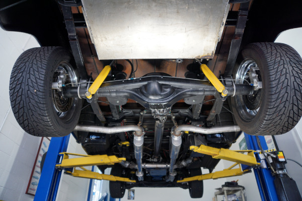 A custom machined air cleaner and a set of built headers and Magna flow mufflers were used to help control the sound of this beautiful beast. The custom exhaust front to rear is completely jet coated. 3.5" Electric cutouts from Doug's Headers allow for uncorked cruising where applicable and are controlled from a switch on the dash. The transmission is a 700R4 with overdrive built by the 'Toy Shop' in Pomona, CA and 'Art Carr's California Performance Transmissions' custom built the B&M Mega Ratched floor shifter controlled and used a 3,000 stall speed convertor. A B&M transmission cooler keeps things at operating temperature. Gil also had a Gear Vendors under/overdrive installed so he could cruise, despite the 4.11 gears.
