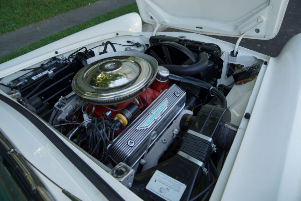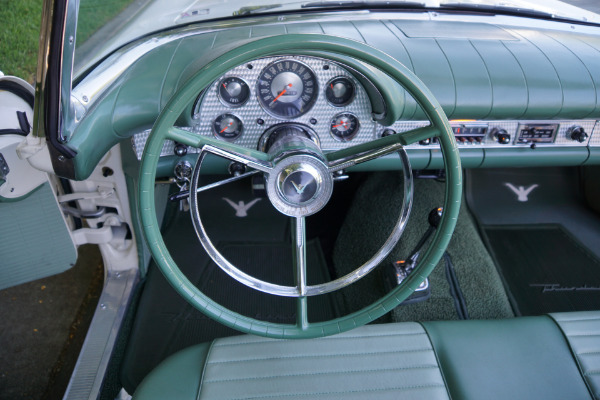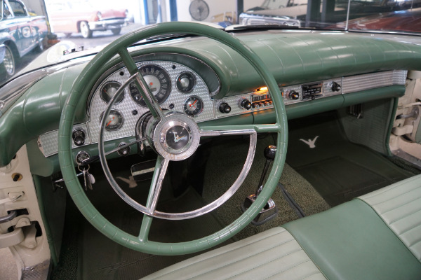 The car has an extraordarily striking appearance with it's original factory color 'Colonial White' matched to a very rare and stunning 'Willow' color vinyl interior with a bench seat, automatic interior courtesy lighting, rayon loop carpeting, half-circle steering wheel horn ring, winged 'Thunderbird' front end emblem, stainless steel window surround moldings, dual horns, dual exhaust and a removable fiberglass hardtop!