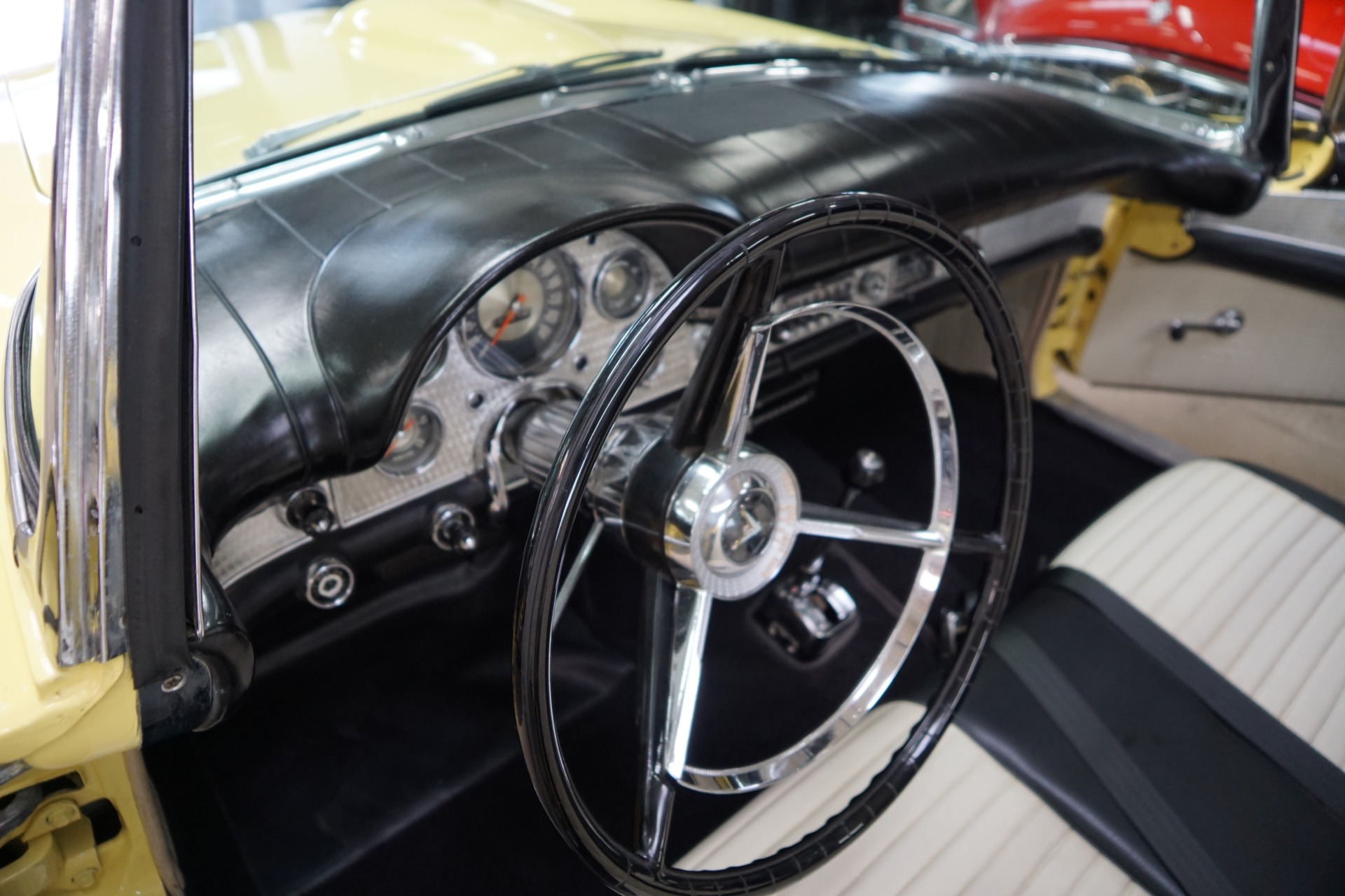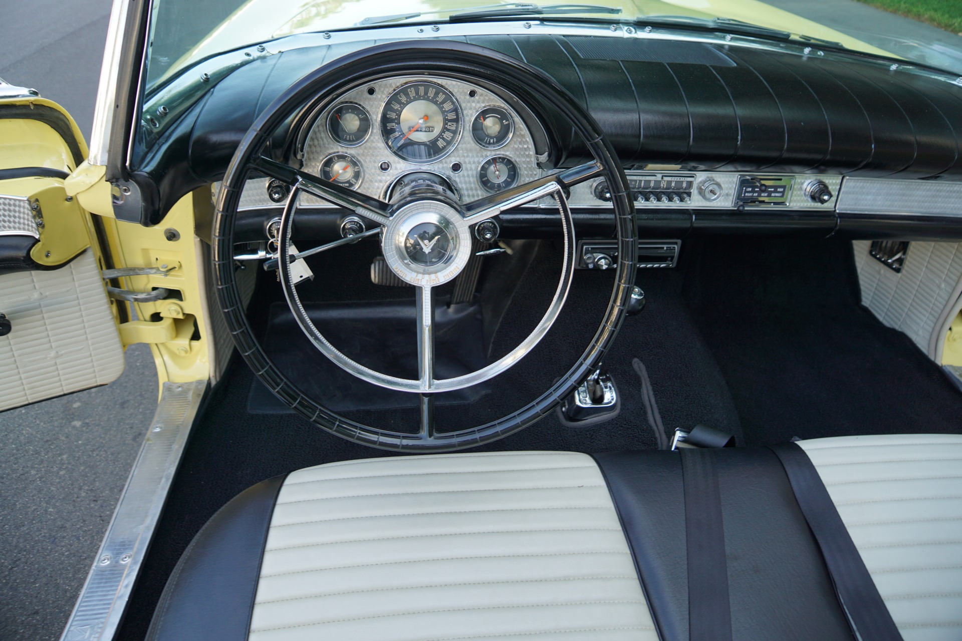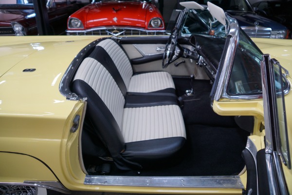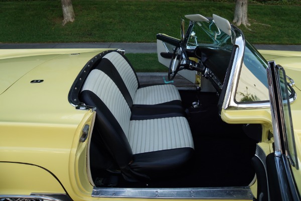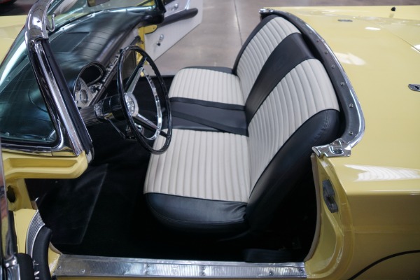 The car has an extraordinarily striking appearance in its 'Inca Gold' color matched to a quite stunning 'Black & White' color vinyl interior with a bench seat, automatic interior courtesy lighting, rayon loop carpeting, half-circle steering wheel horn ring, winged 'Thunderbird' front end emblem, stainless steel window surround moldings, dual horns, dual exhaust, rear fender skirts, 4 way power seat, a full and fitted tonneau cover, telescopic steering column, Dayton chrome wire wheels and iconic removable porthole fiberglass hardtop!