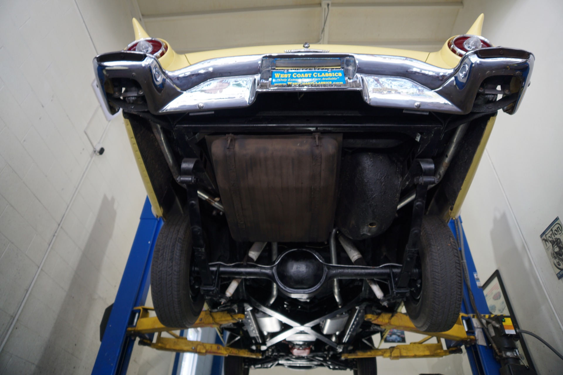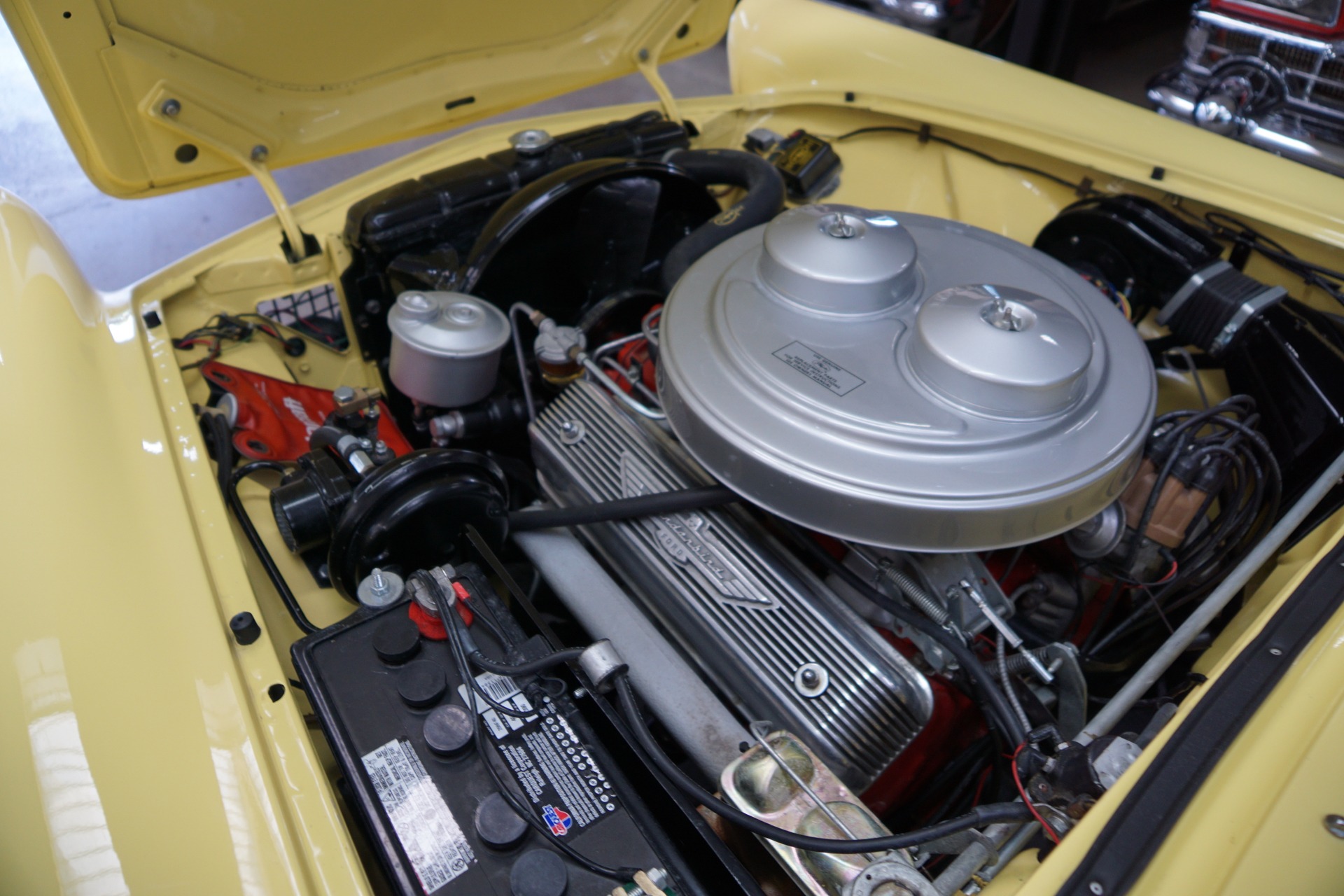 The car's original 'E' Code 312 V8 engine with rebuilt and original dual 4 barrel Holley carbs is extremely strong and powerful and sounds absolutely magnificent. The transmission shifts smoothly though the gears and the power steering and power brakes make the car an absolute pleasure to drive. Four new whitewall radial tires have just been installed on brand new chrome wire wheels with matching center caps. All the chrome was removed and re-chromed.