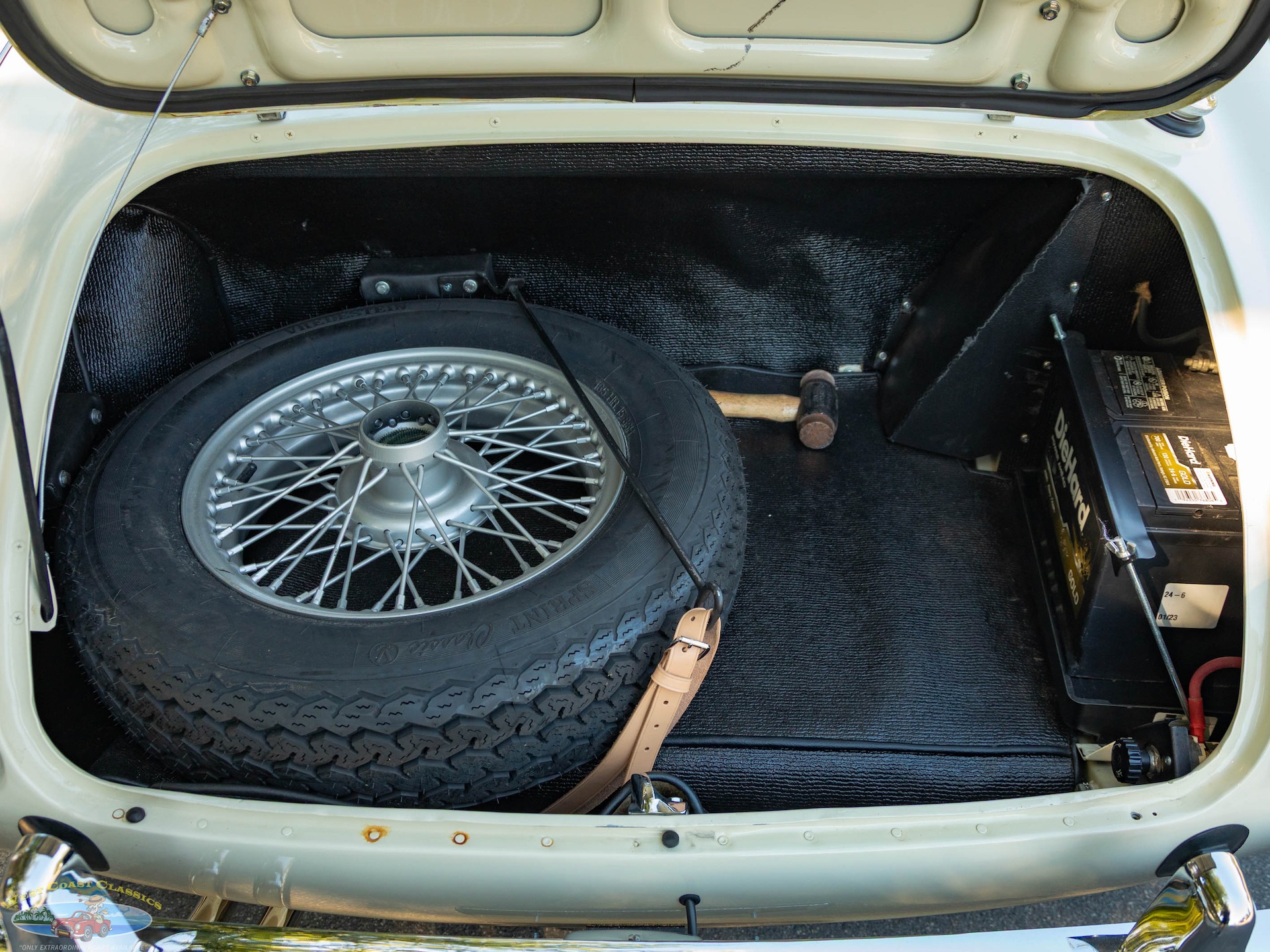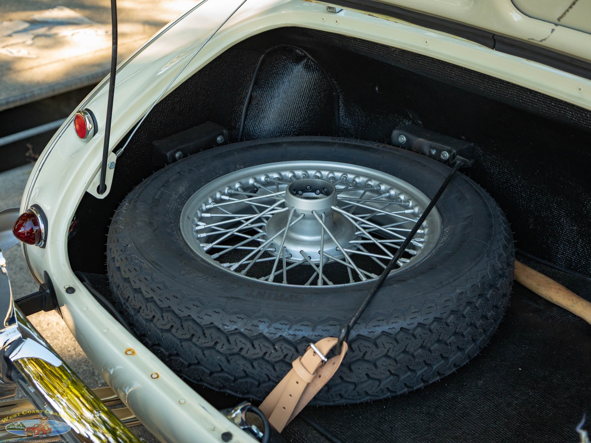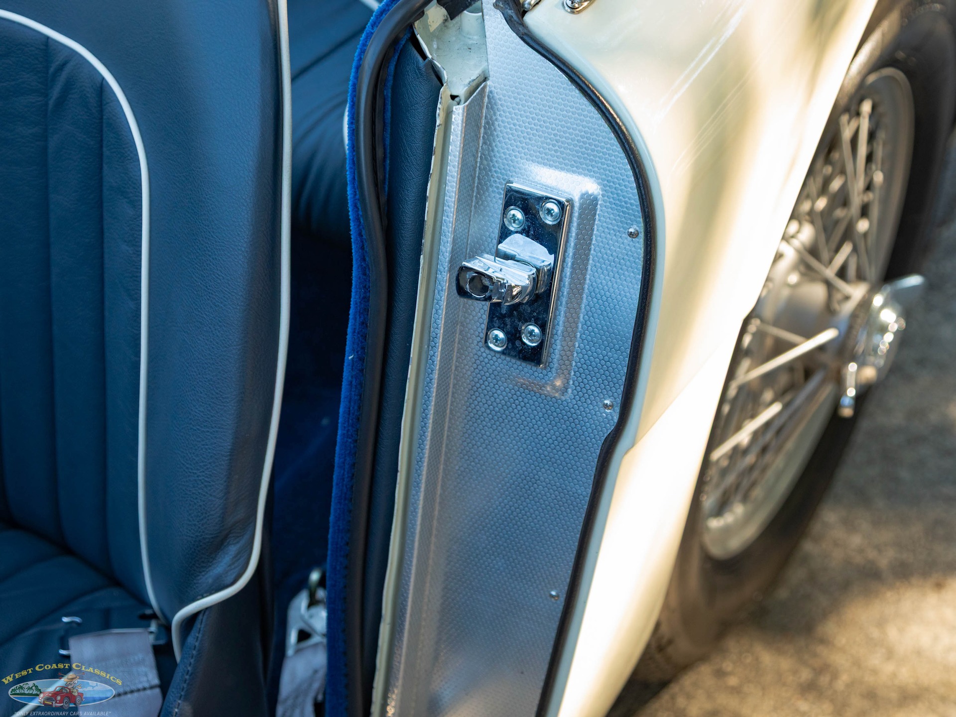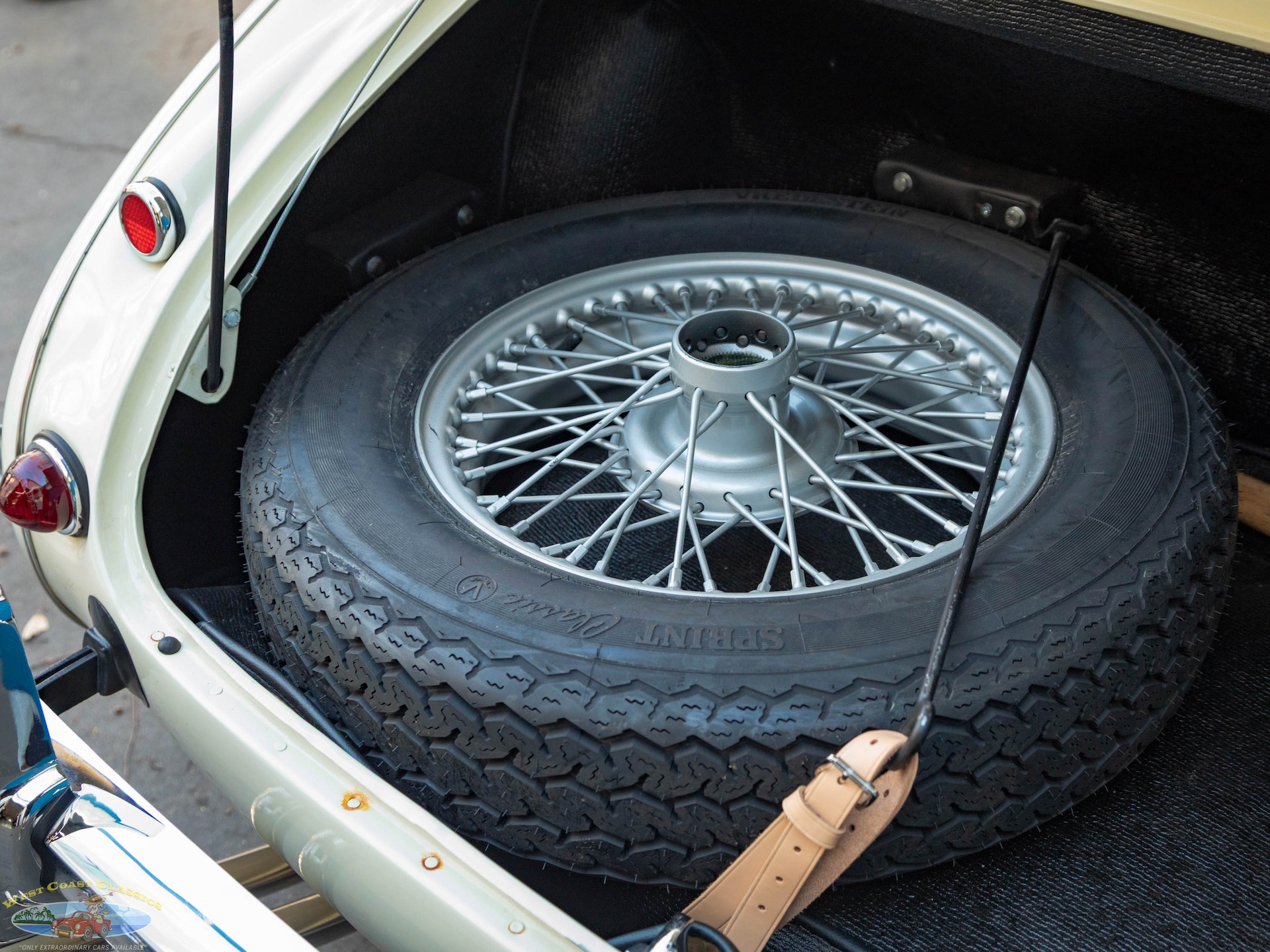 The car looks extremely impressive in striking 'Olde English White' paint and the Blue interior with White piping is in exceptional condition also with original gold type gauges which are all in correct working order! The new black soft top is in great shape, both functionally and otherwise and the car boasts its side curtains. The car had four chrome wire knock off wheels with new tires and a spare aluminum wire wheel (not chrome) in its correctly mounted position in the trunk.