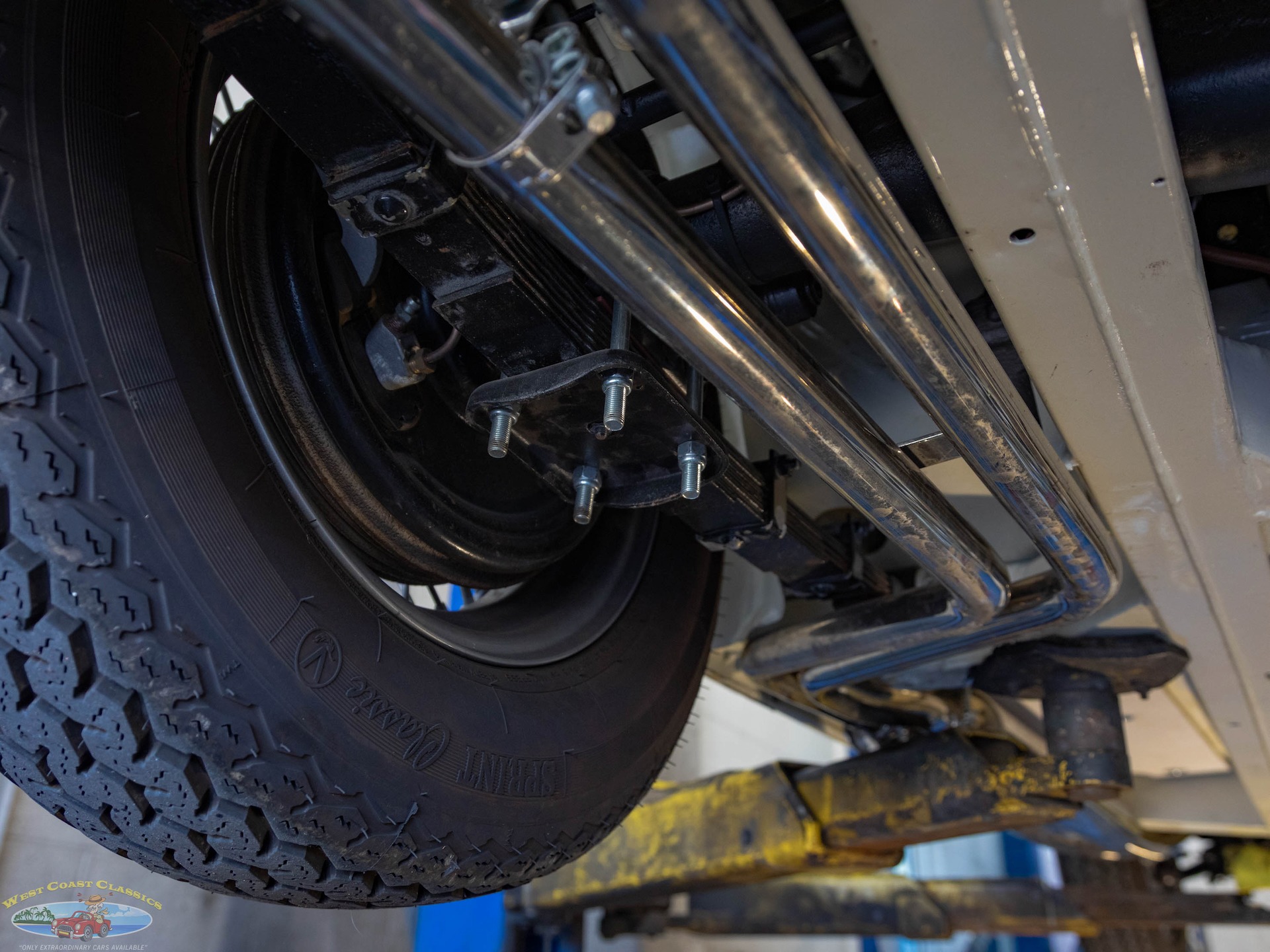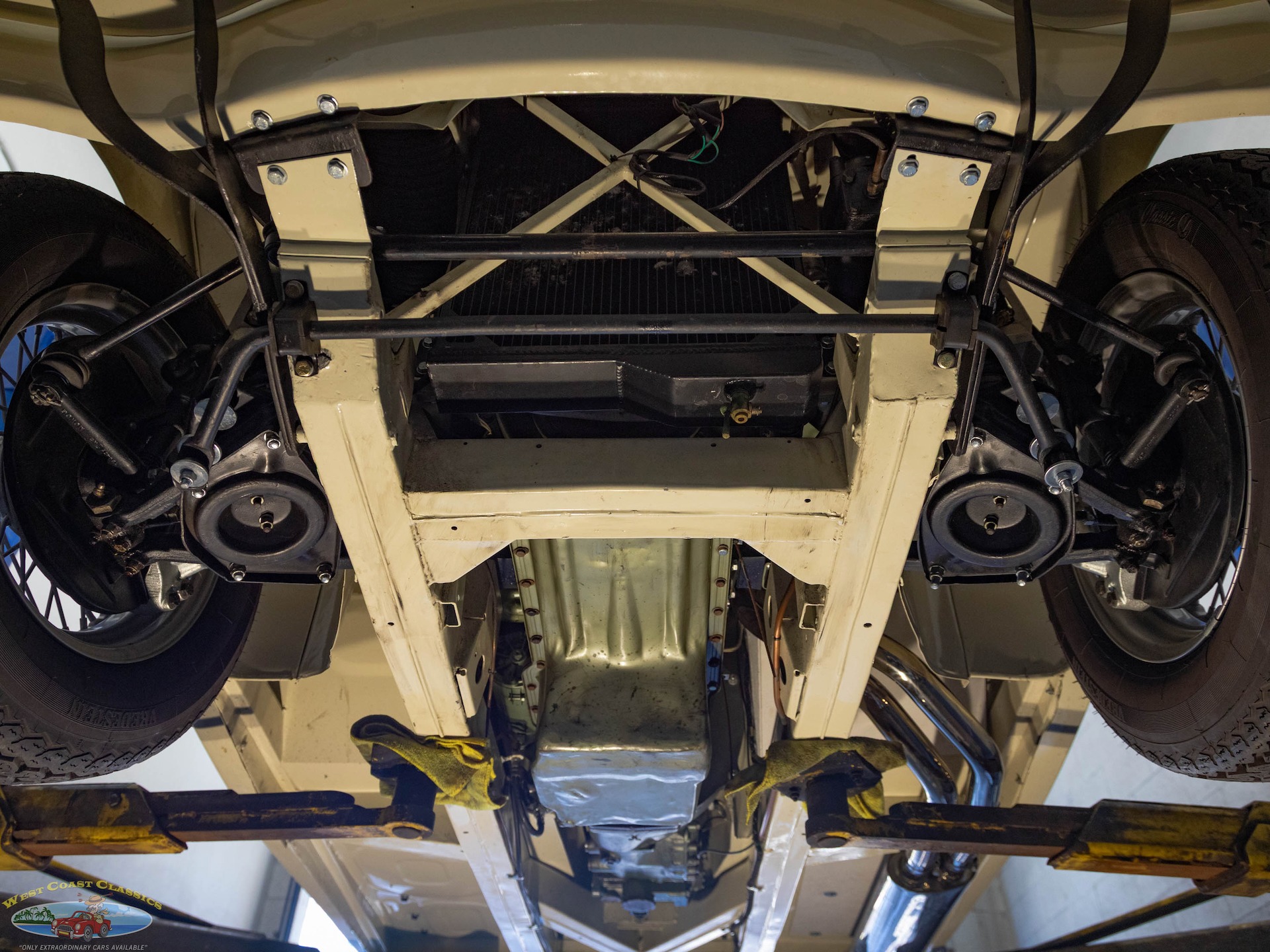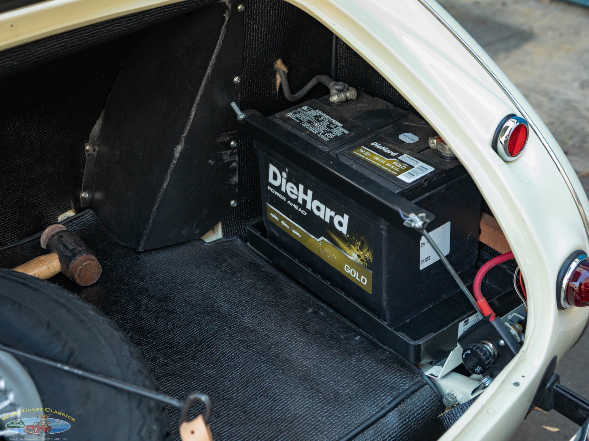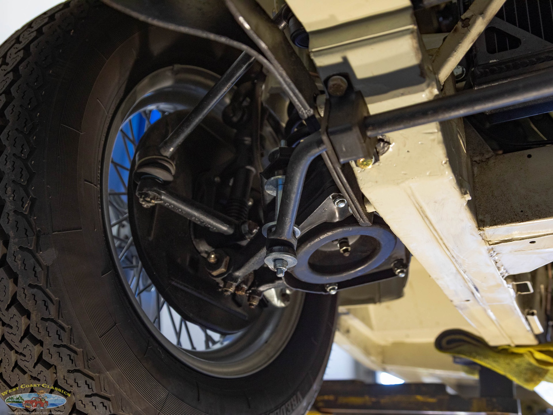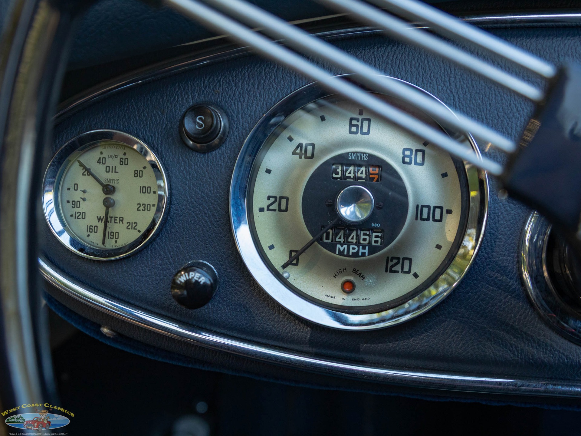 The car looks extremely impressive in striking 'Olde English White' paint and the Blue interior with White piping is in exceptional condition also with original gold type gauges which are all in correct working order! The new black soft top is in great shape, both functionally and otherwise and the car boasts its side curtains. The car had four chrome wire knock off wheels with new tires and a spare aluminum wire wheel (not chrome) in its correctly mounted position in the trunk.