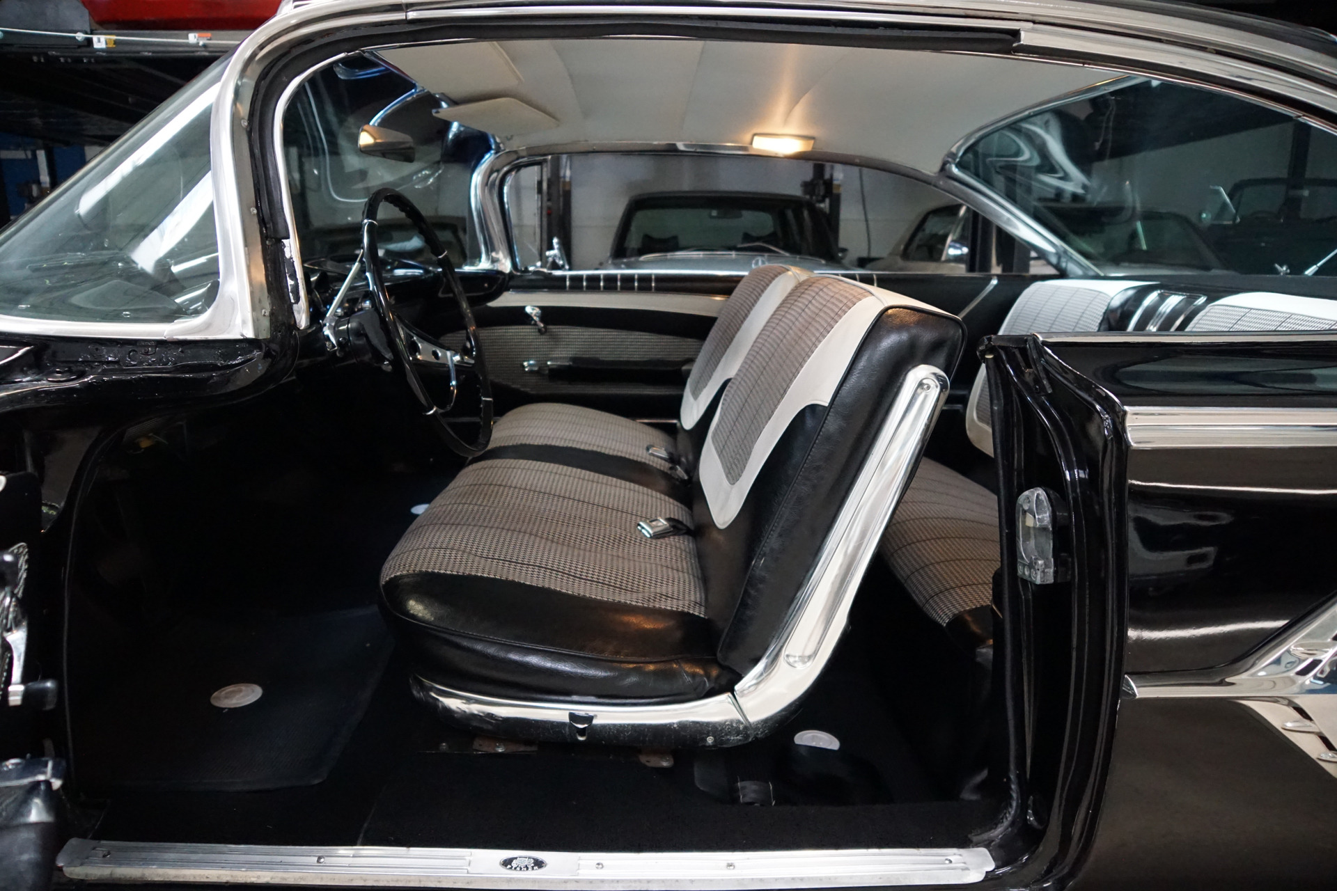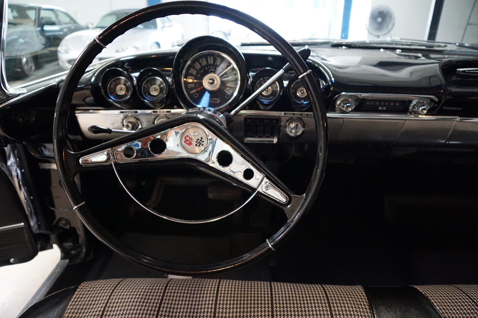 As with all other full-size GM lines, the cars were finished with the knee-banger, wrap around windshields and tailfins and the front end sported a full width grille with dual headlamps mounted at each end. The car boasted all the regular Bel Air equipment plus Nylon pattern cloth seats, electric clock, full carpeting and dual backup lights.