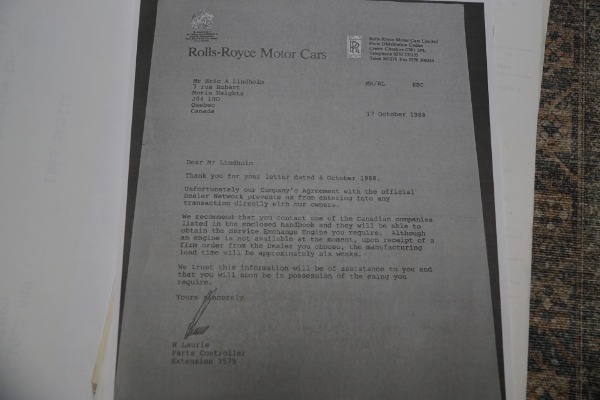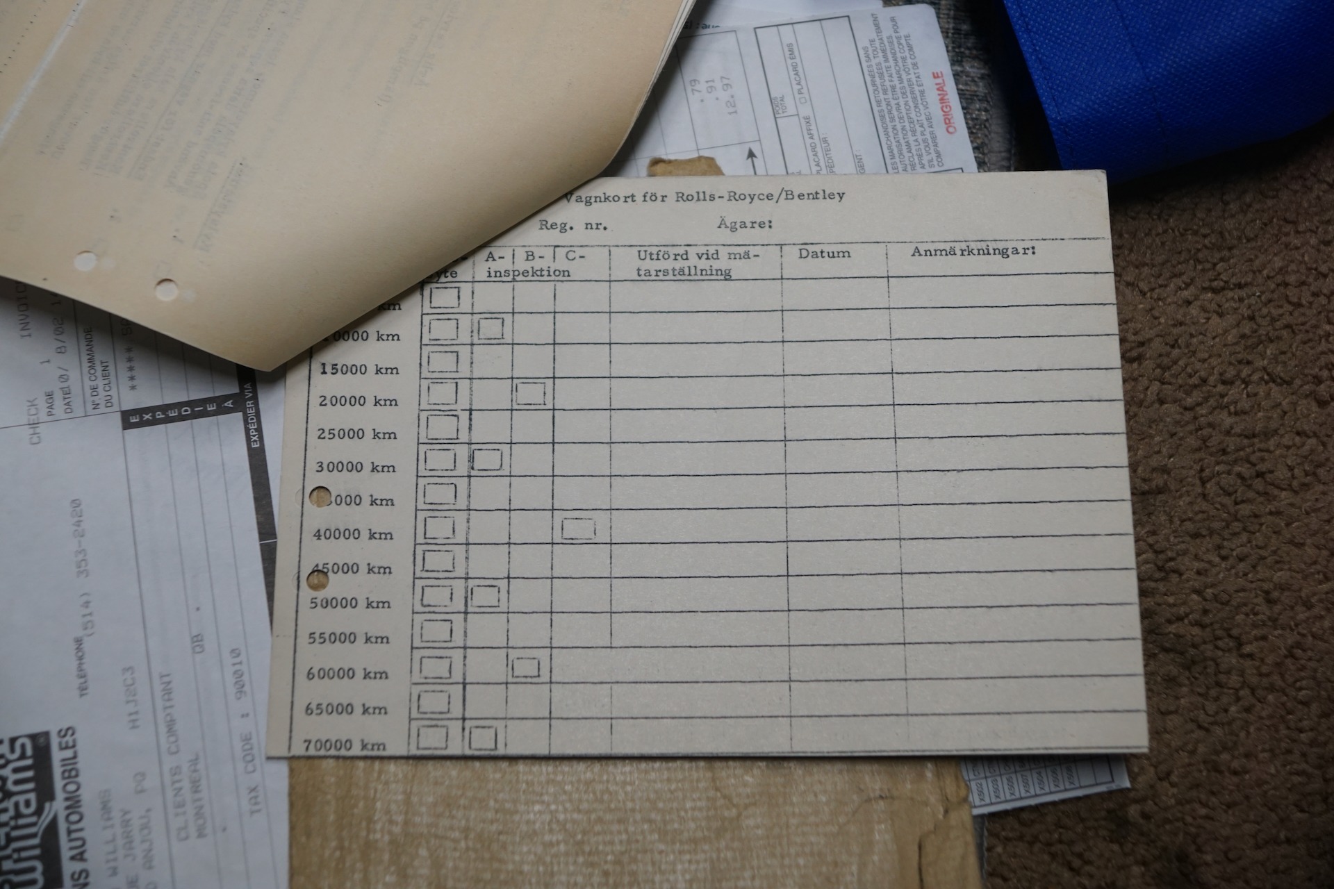 Connolly leather is legendary for being exclusively used in Rolls Royce and other high end British cars and came from unfenced cows which produced unblemished hides. All the chrome work including the front Rolls Royce grille and bumpers is absolutely outstanding. The door panels, carpets, dashboard and the original mohair headliner remarkably show virtually no signs of any wear. The car has it's original spare wheel with original jack still located in their rightful place of storage in the trunk compartment. The car also boasts its original factory build sheets from Rolls Royce of Crewe and the original delivery order form and paperwork!