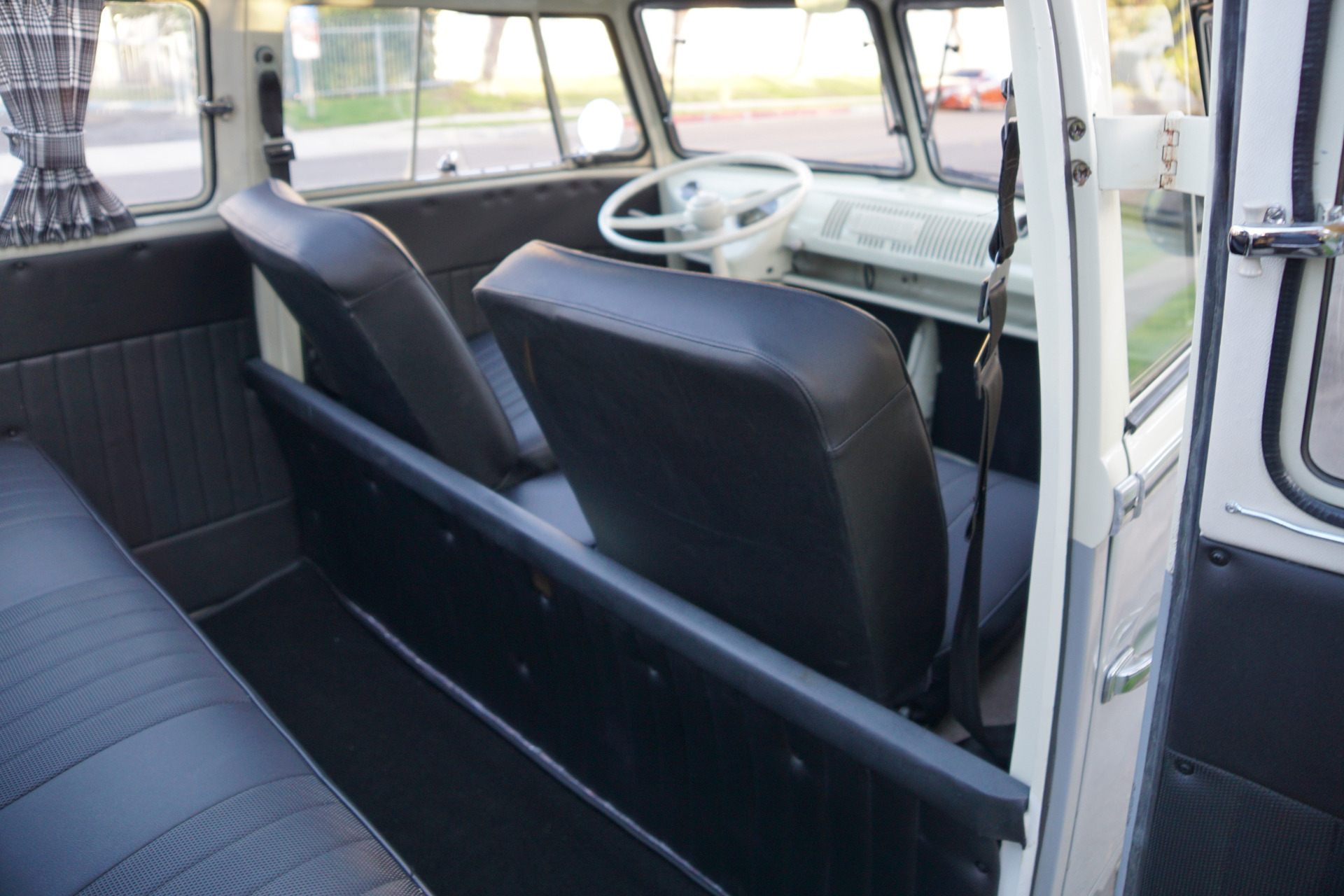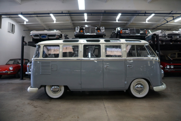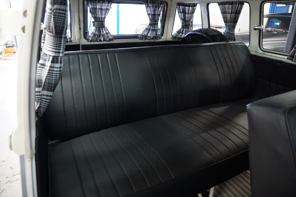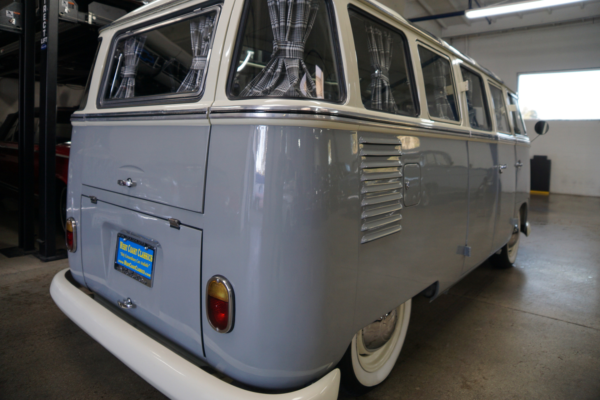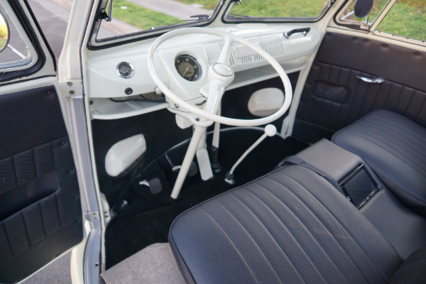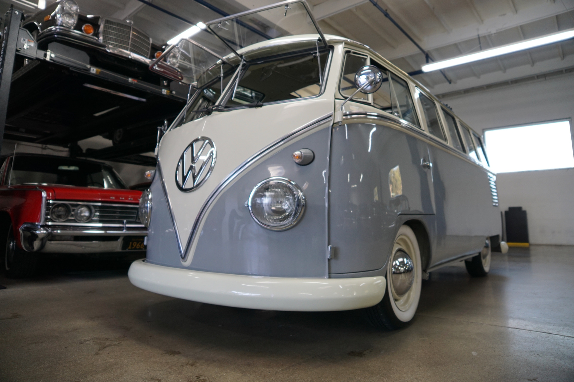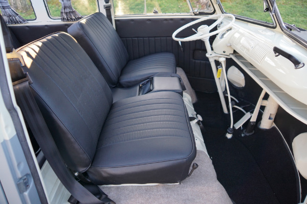 This particular bus is a highly desirable recent restoration with only some 300 miles since being finished in 'Mouse Gray over White' of a collectible Type 24 Bus (Deluxe 9 passenger Microbus). Most Deluxe Microbuses were ordered as Samba models (a $160 option) that included a sliding canvas sunroof flanked by 4 skylight windows on each side of the roof (that's a 23 window bus through model 1963 and a 21 window bus starting in model year 1964). The deluxe Microbus was Volkswagens top-of-the-line transporter.