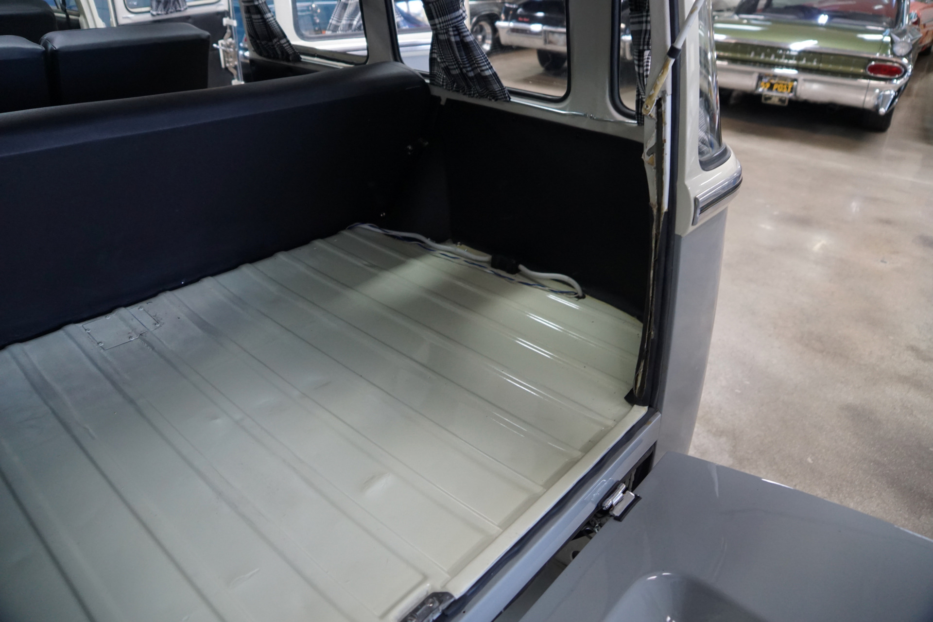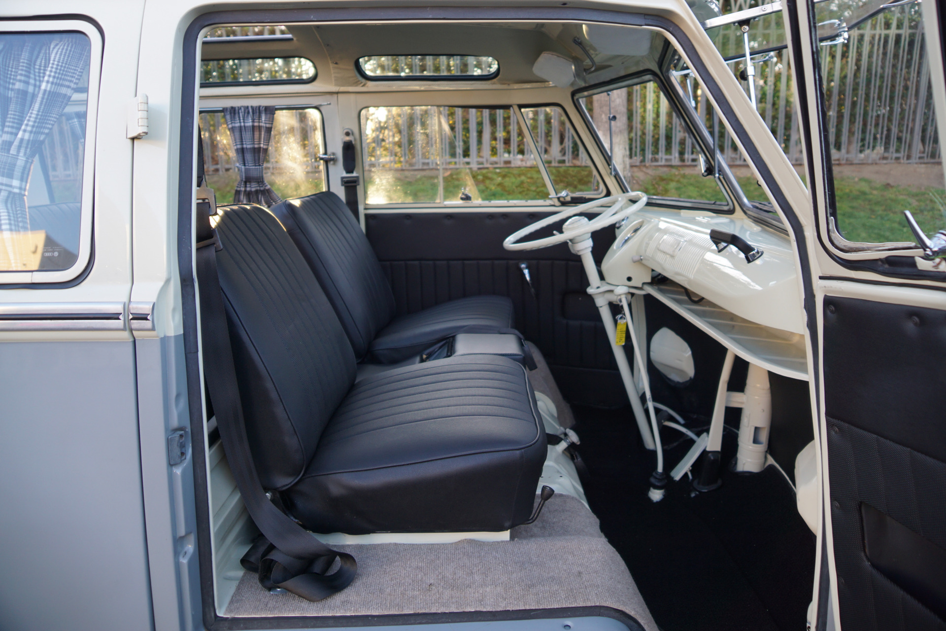 The body on this particular example is razor straight and all the door and panel fits are as original and as they should be and the bus is fitted with highly desirable 'original German' Safari front and rear windows & side pop-out windows. The bus was finished in a very professional and a gorgeous two-tone color combination of 'Mouse Gray over White' paint and the bus has an absolutely beautiful all new 'Gray & Black' carpeted interior and a carpeted rear deck!
