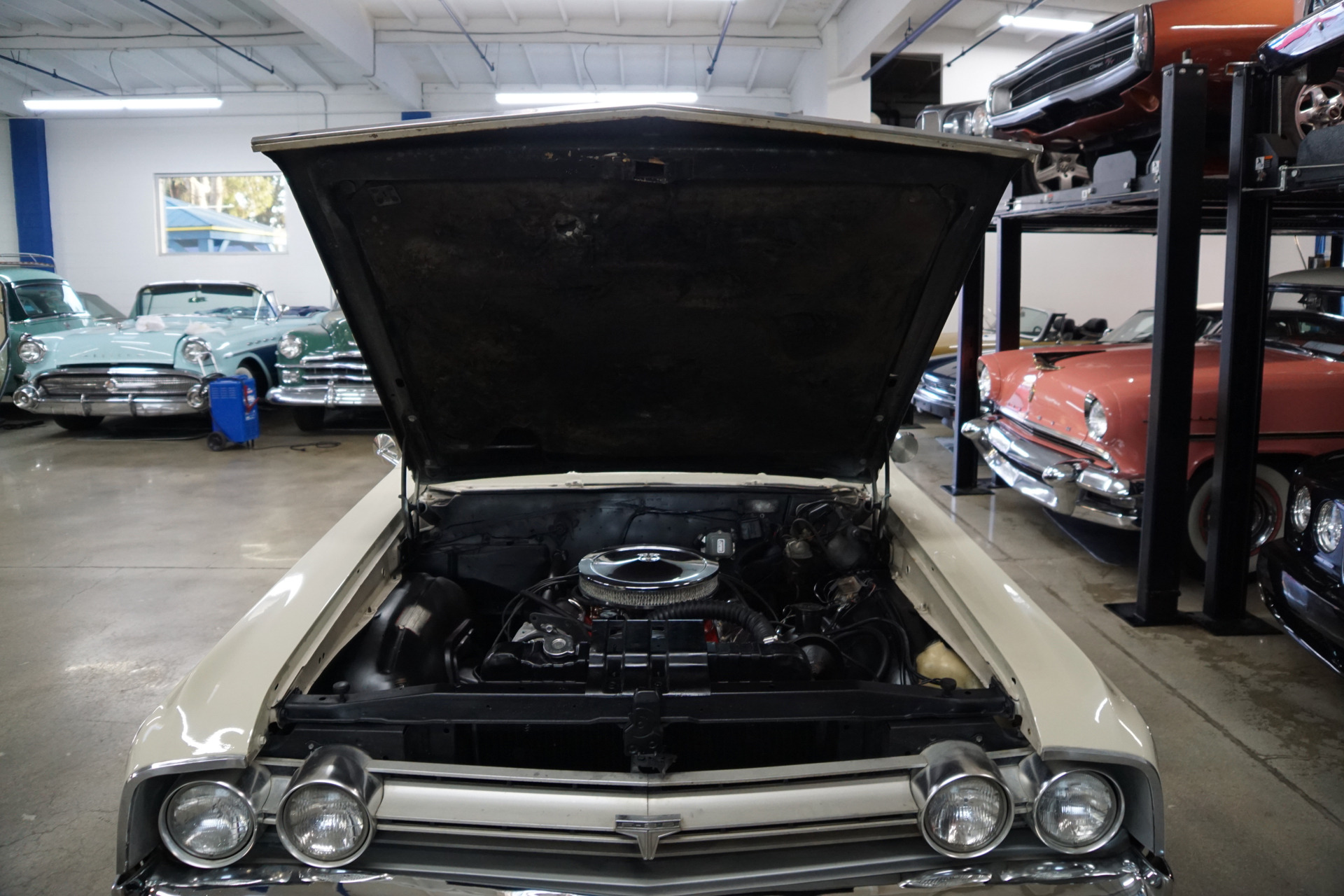 This particular car is an original southern California 1964 F-85 Cutlass Convertible which has been cloned as a tribute to resemble a 442 Convertible and boasts its original factory power steering, a power top, it's original 'Olds' AM radio & 8 track cassette player. The car has 'Torque Thrust' wheels and a 'Flowmaster' dual exhaust. The desirable optional 'Jetaway' automatic transmission shifts smoothly through all the gears, there are no noticeable oil leaks and the temperature always remains cool!