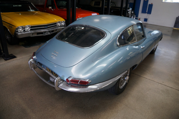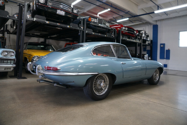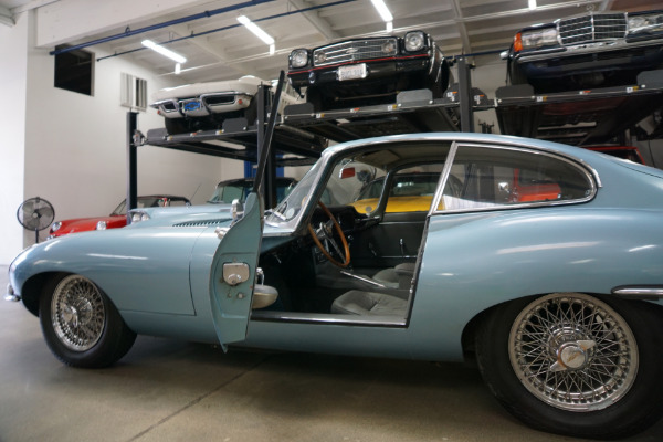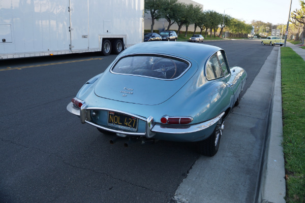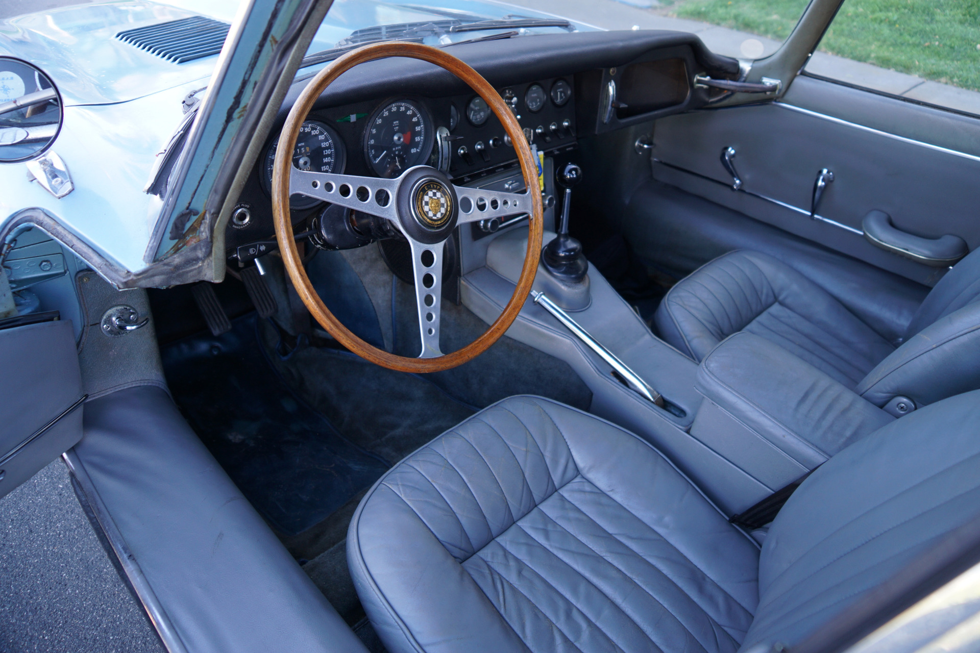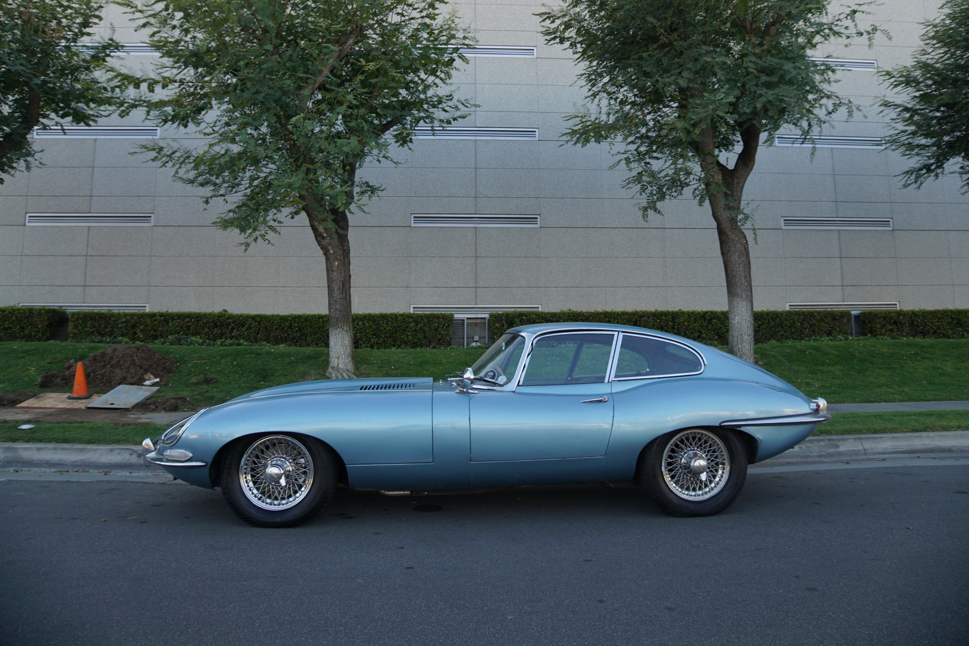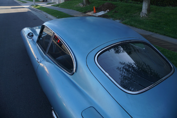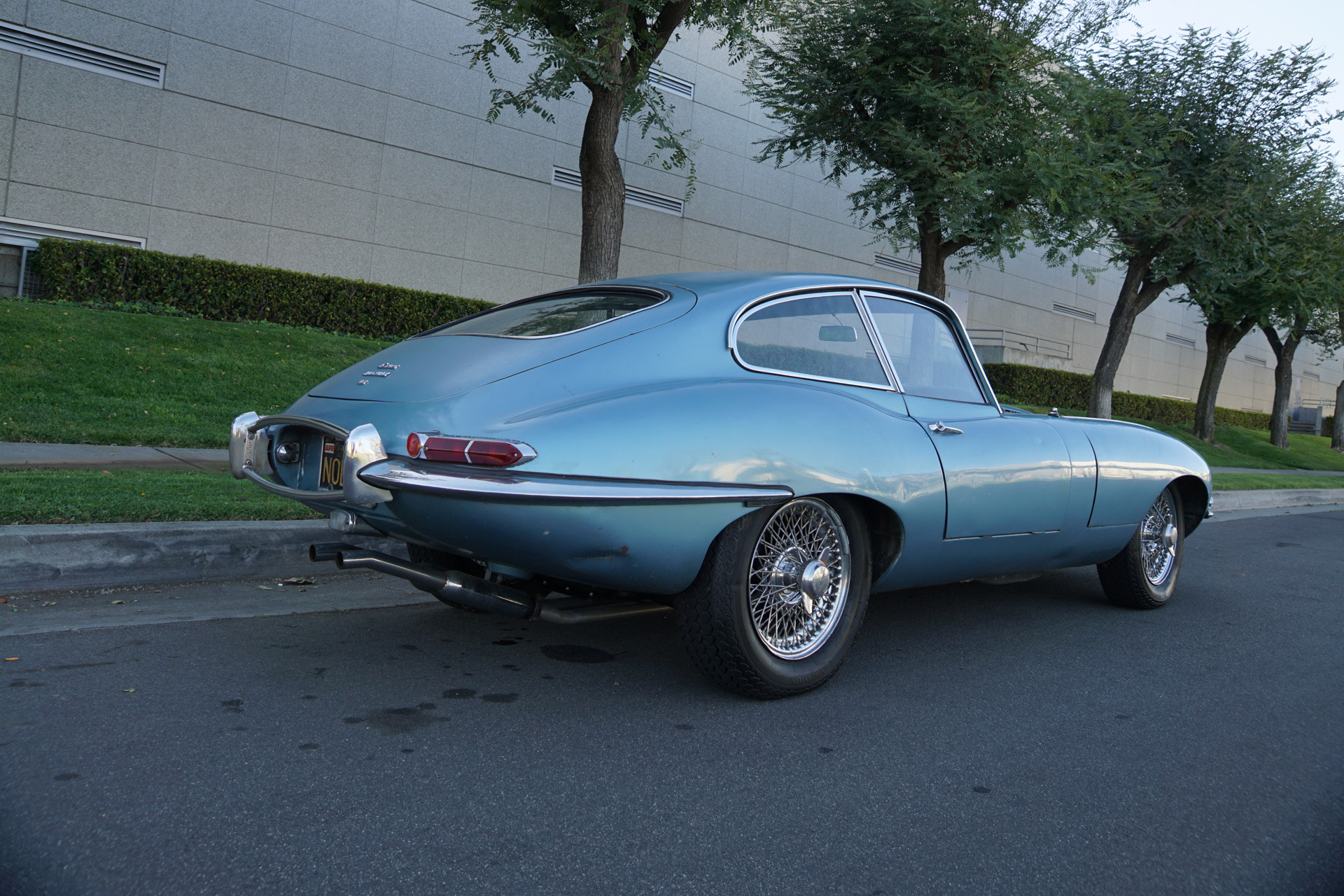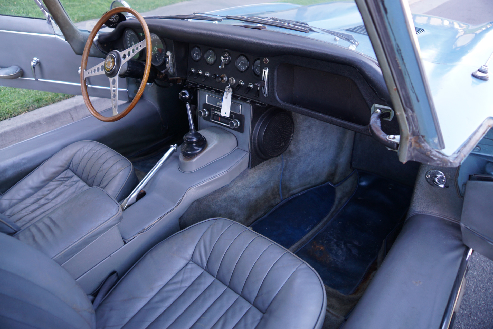 It is also of considerable note that this fine example has been under only two southern California family ownership since new! So here it is, a completely unrestored, apart from one older repaint in it's original 'Opalescent Silver Blue' factory color paint, original southern California 1965 Jaguar XKE E-Type Series 1 Coupe with the 4 speed manual transmission coupe and with it's all original interior & original matching #'s 6 cylinder 4.2/265HP engine & transmission with four original Jaguar chrome knock off spoked wire wheels, handbooks and spare chrome wire wheel!