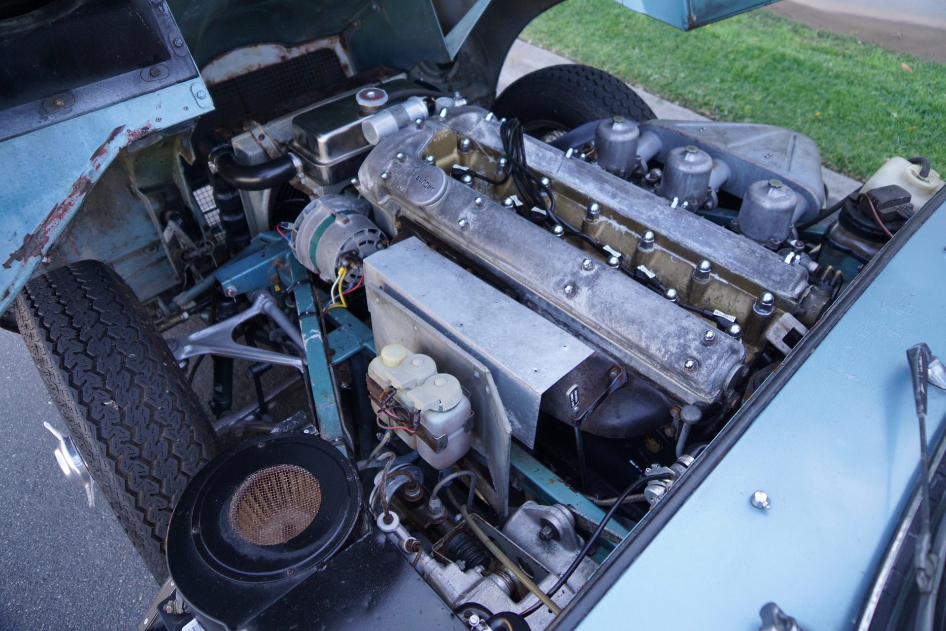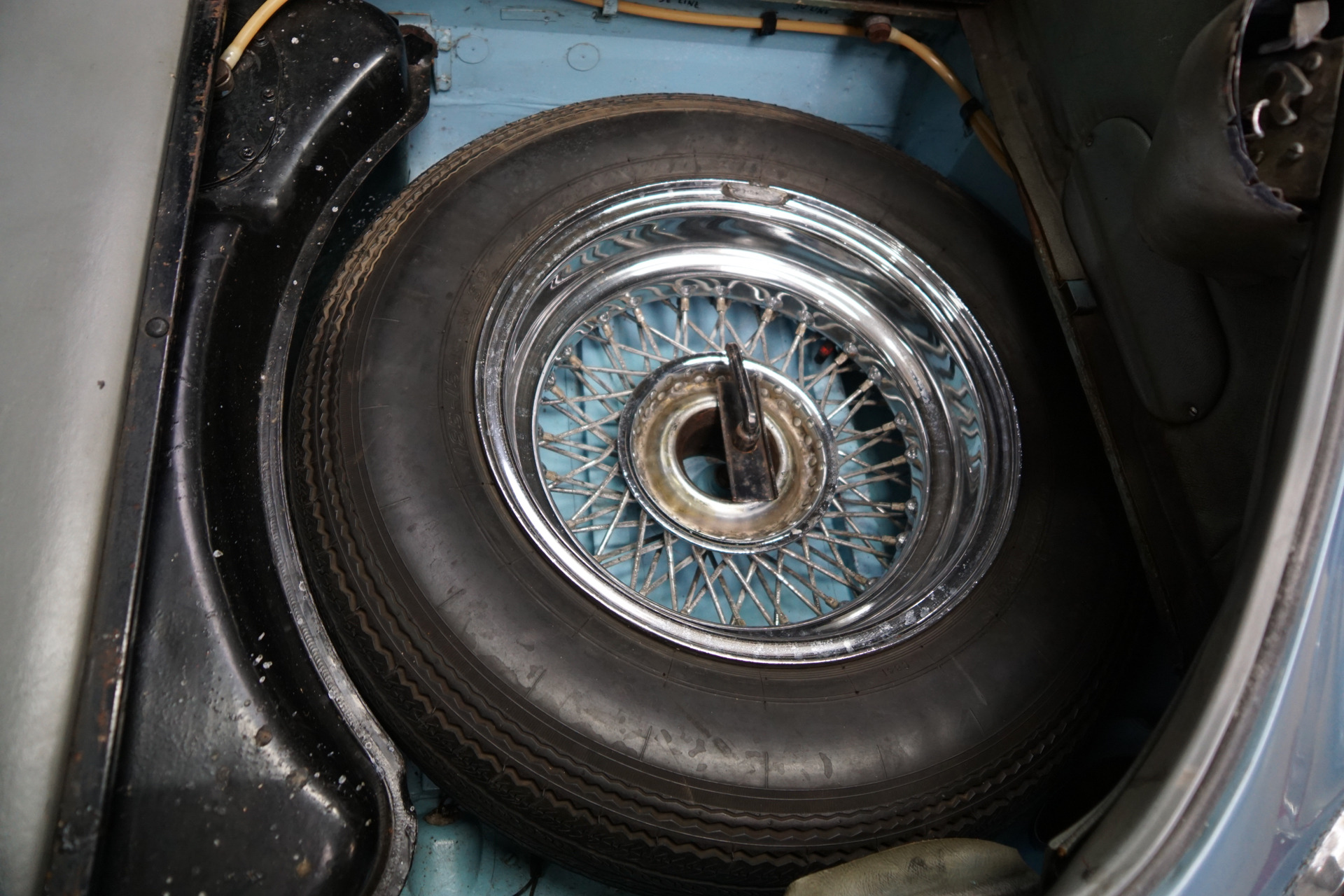 The car has a razor straight and is a virtually rust free California car apart from some very minor bubbling in the rear end assembly; it is a prime candidate for a full cosmetic restoration for the Jaguar enthusiast or simply a great daily driver for any classic British sports car lover! The floor boards and all the typical rust-prone areas are completely solid, original and rust-free! The car has no signs of any accidents of any kind and has a razor straight body and sports its original factory 'Opalescent Silver Blue' color older repaint which has some light scratches and a couple of small dents and imperfections from its many years spent 'unattended' in the garage and yet the car's all original leather interior is still quite impressive with both front bucket seats, the door panels, headliner, dashboard and carpets all quite original and in very presentable condition throughout. Please note the car also has it's original spare wire knock off wheel in the trunk.