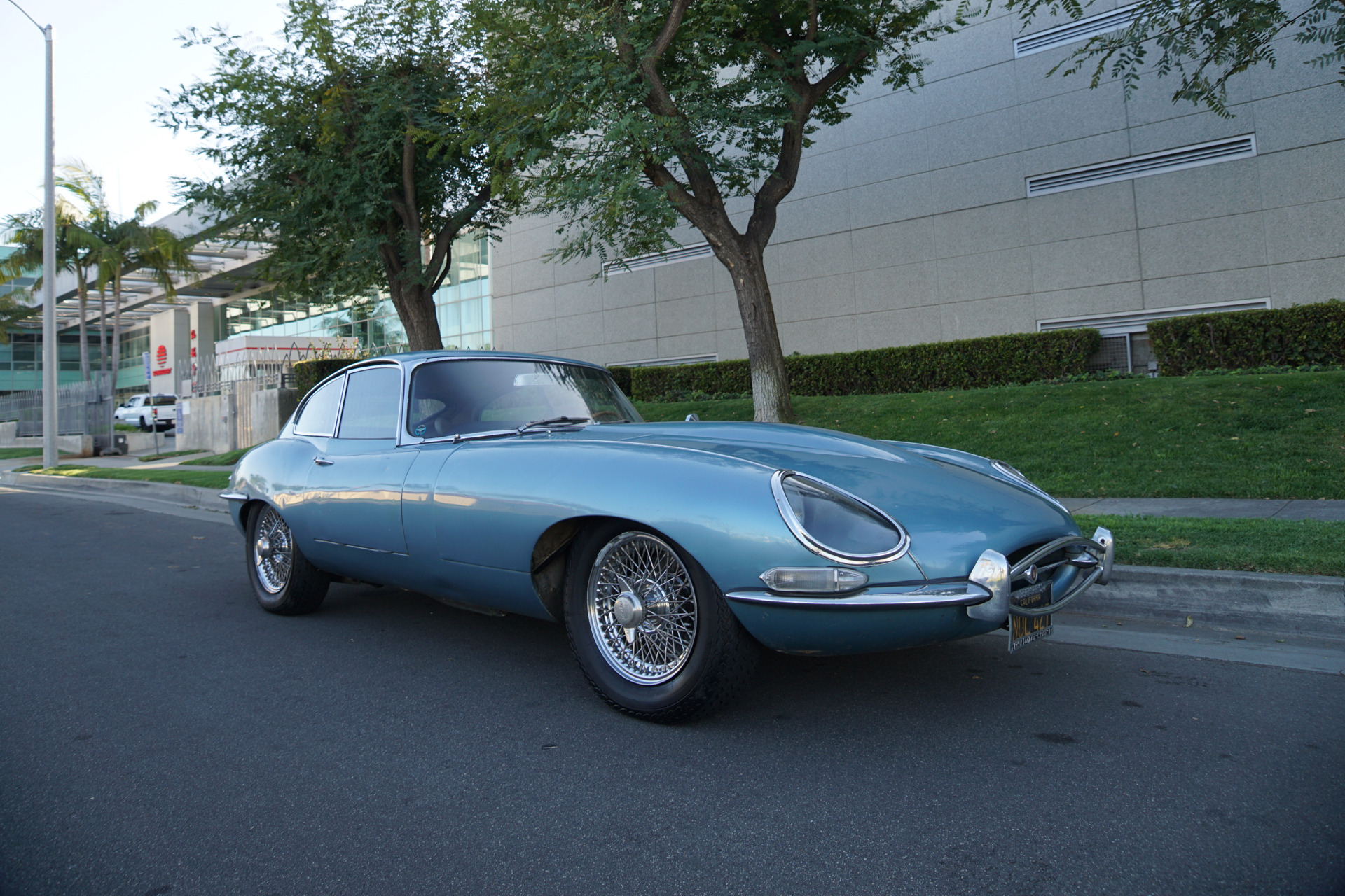 West Coast Classics are proud to present an extraordinarily rare and virtually rust free genuine 'barn find' example of this coveted original southern California 1965 Jaguar XKE E-Type Series I coupe with a highly desirable 4 speed manual transmission and with it's original matching #'s 4.2L 265HP 6 cylinder engine and heads with original triple SU carburetors & original 4 speed manual transmission, in it's original 'Opalescent Silver Blue' factory color paint and with its faded but all original 'Light Blue/Gray' leather interior with wooden steering wheel, original California 'Black License Plates' and original five factory chrome wire knock-off wheels & original mallet!