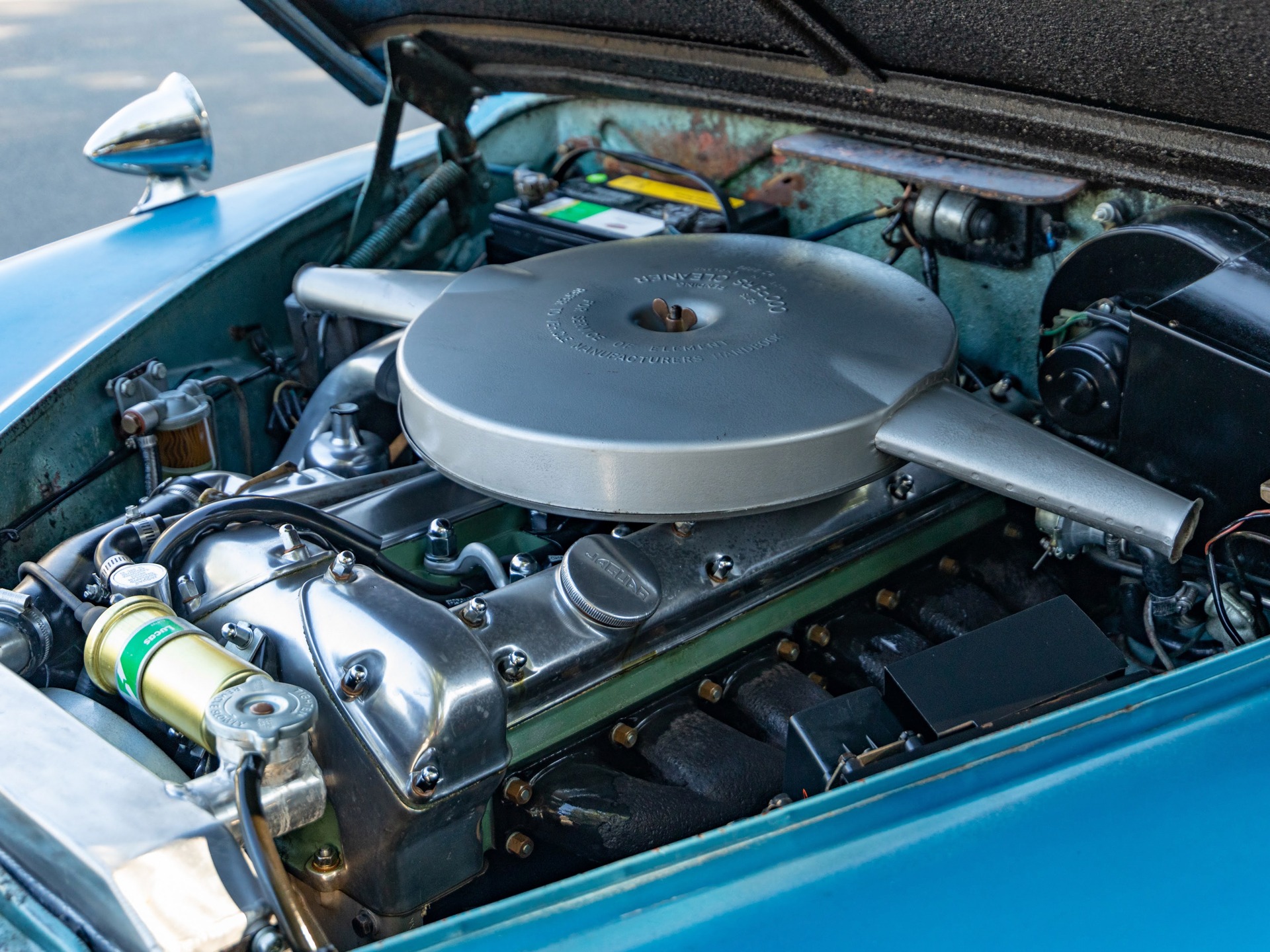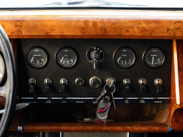 This particular model was fitted with rare factory options including the very desirable 4 speed manual transmission with Overdrive, fog lights, radio and wheels and the car still has its original spare wheel and jack and factory tools located in their original storage compartments in the trunk. The interior of the Mark II boasted bucket seats in front with traditional English fold-down tea trays in their rears. The fascia was neatly arranged with instrumentation right in front of the driver with a row of secondary gauges and toggle switches lined up impressively in the leather grained center of the dash and the 4 speed manual transmission was installed on the center console. The Mark II was discontinued in September 1967.