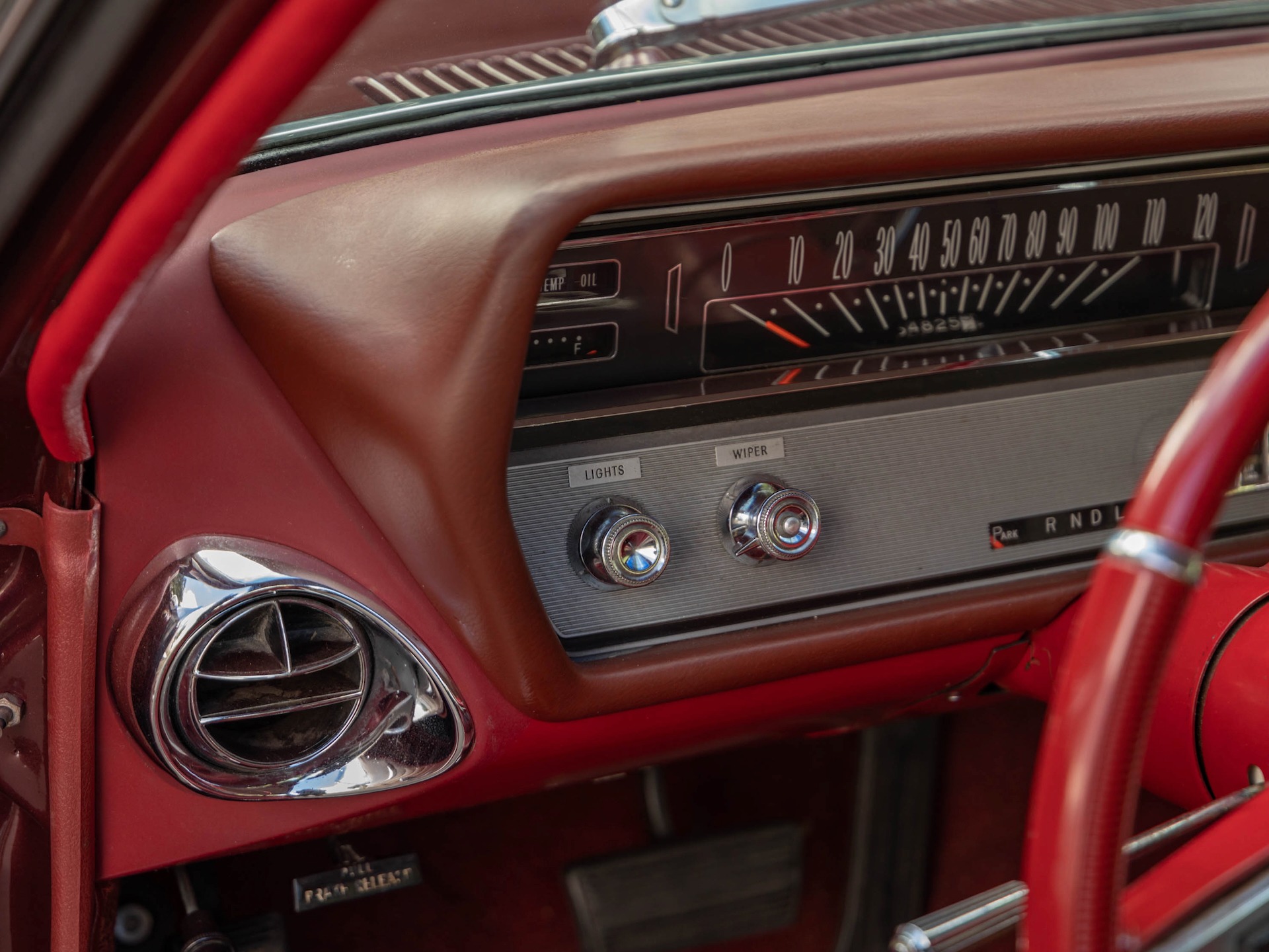 The car looks extremely impressive with it's original 'Burgundy Mist' over a 'White' hardtop color paint and the original 'Red' interior is in exceptional condition throughout with the complete interior, including the dashboard, the matching headliner, the carpets and all the seats and door panels also in quite exceptional condition throughout! All the chromework is also in very good condition and the original spare wheel with it's jack is in the trunk.