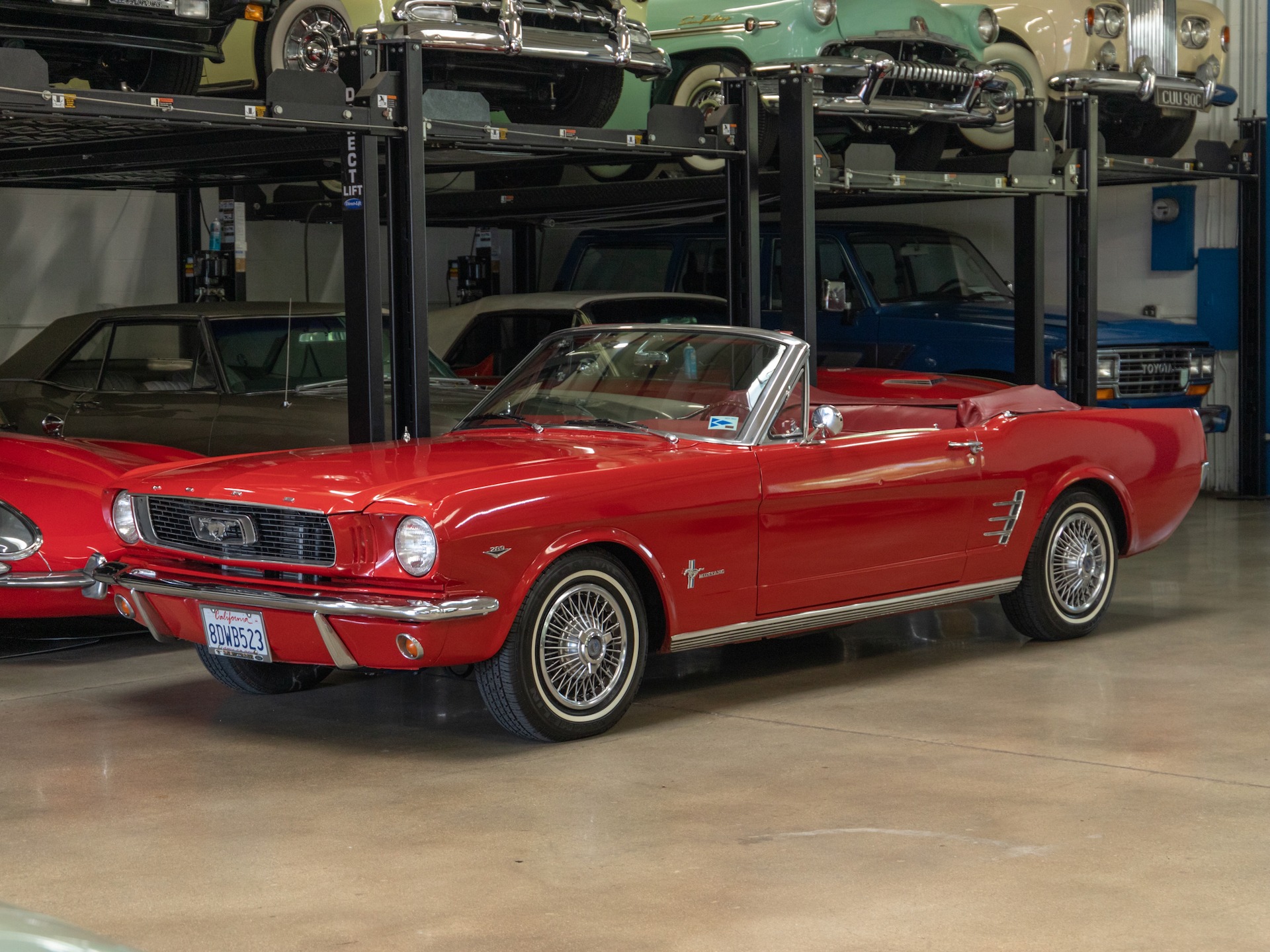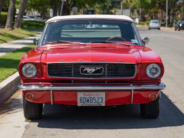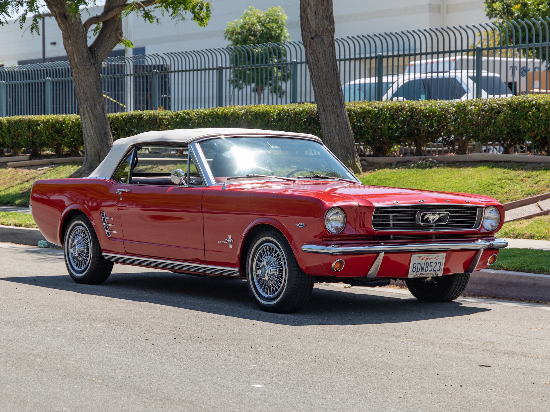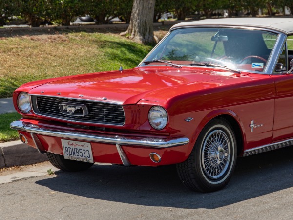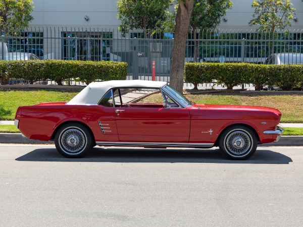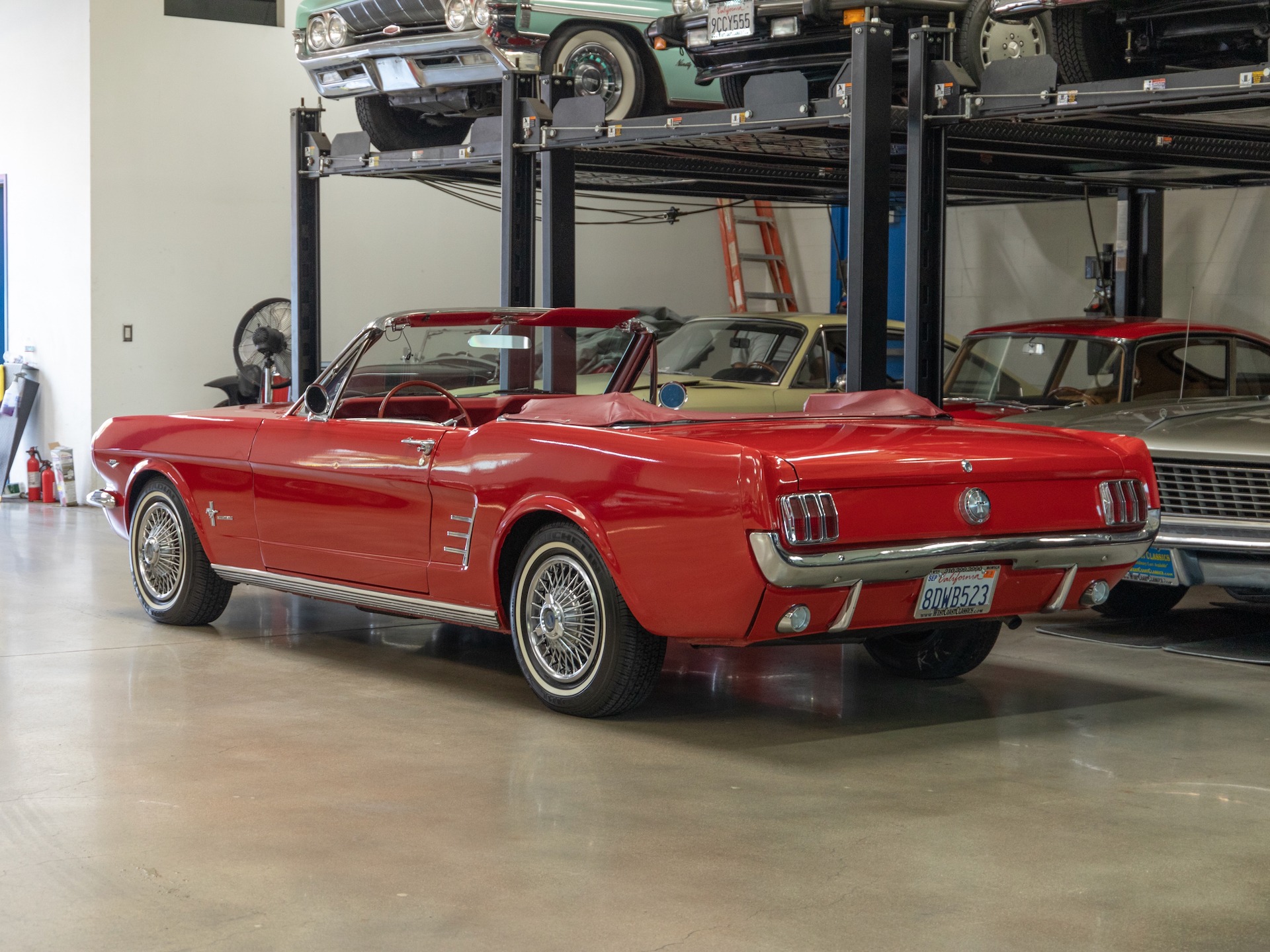 West Coast Classics are proud to present a great daily driving and striking example of this 1966 Ford Mustang 'C' code 289 V8 Convertible with custom upgrades including a rebuilt fuel injected 289 V8 engine with an automatic transmission in original 'Candyapple Red' factory color paint with a very striking reupholstered original 'Red vinyl & Red Rosette' vinyl trim interior and a new 'White' power soft top and with the desirable additions of after market air conditioning and power front disc brakes.