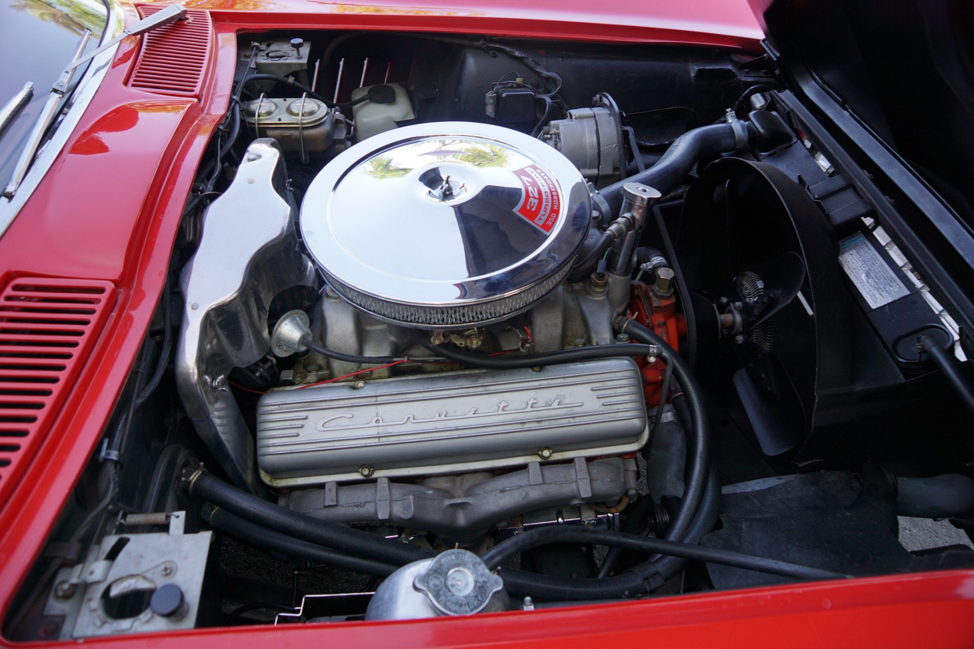 The car was equipped with a small block 327 engine with the L79 option, which is the 350HP version. It also came with the M21 Close Ratio 4 speed transmission, Positraction, and a 3.55:1 rear end. These are all go fast options and the originals are still with the car. The intake manifold and carb were replaced as was the radiator and the alternator. The car has it's correct air cleaner and upper and lower ignition shielding. The brake master cylinder is original as is the driveshaft. Individual suspension components have been replaced and the tires are Red striped modern radial replacements of the old bias ply tires. The carpet is new as are the seat covers. The seat belts were replaced by the only guy certified to do so by NCRS. The top is new but the frame and moldings are original. The door panels, handles and knobs, dash and instruments, and all glass are original. The dashboard is nice and original and the clock and factory radio still work. The undercarriage is rust free and nicely detailed.