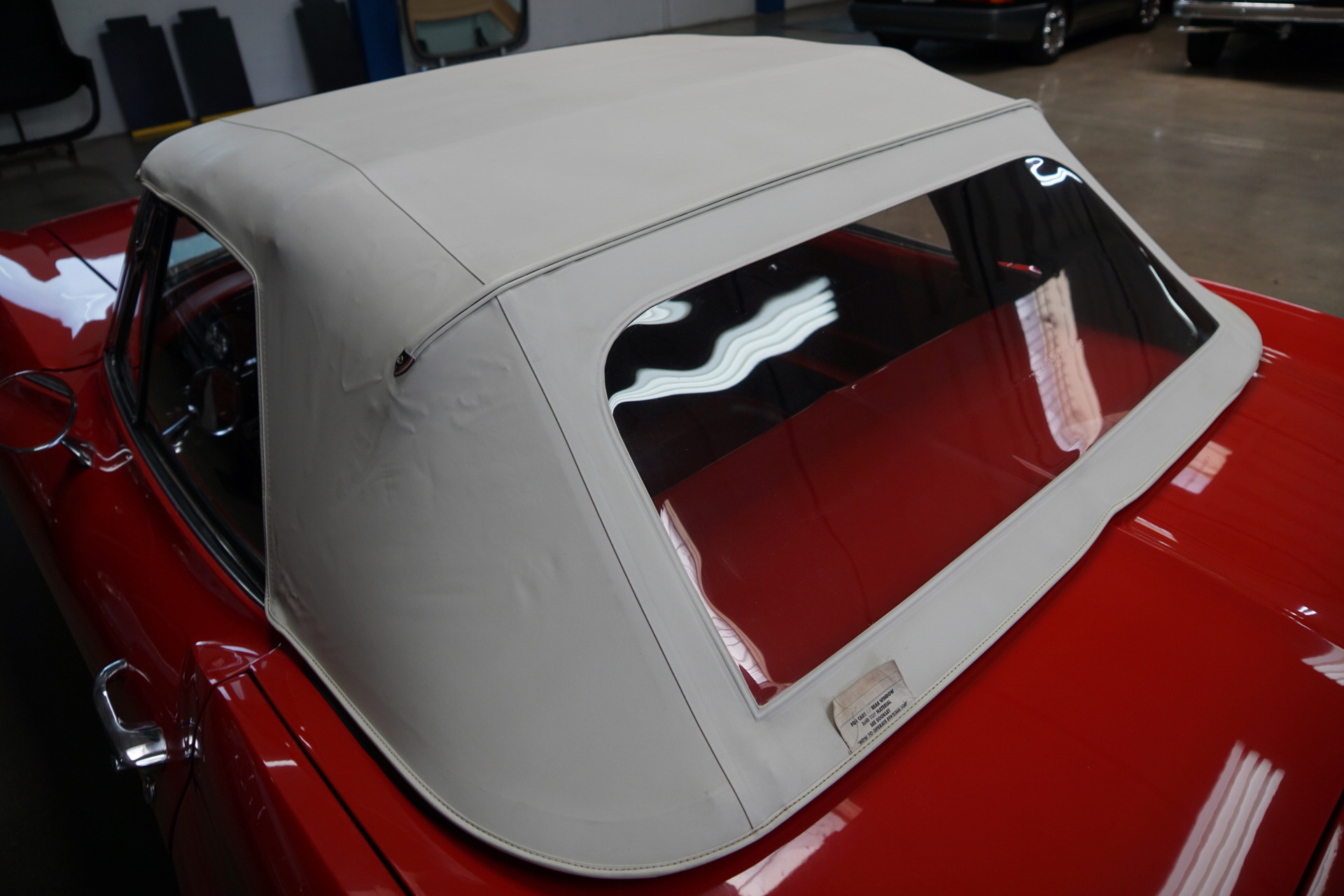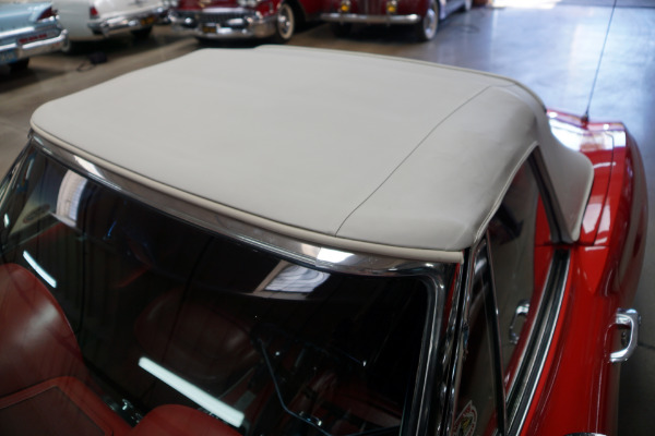 Interior is original standard Red vinyl color.All mechanics are excellent.The car car is exceptionally well preserved, as would be expected for a car out of such a prominent collection. It has no signs of any accidents and with bonding strips intact and which is the beneficiary of an obviously recent beautiful repaint in it's original 'Rally Red' factory color and looks extremely striking with it's rare matching 'Red' interior and new 'White' soft top. The car has new weather stripping and re-chromed bumpers.