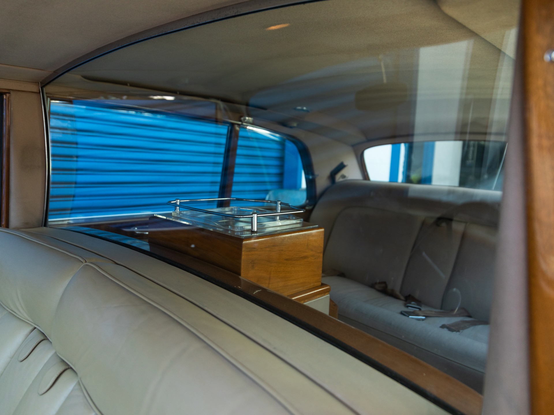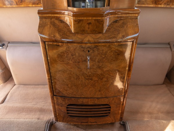 In back, with occasional-use foldaway seats stowed, legroom for passengers seated on the wide, deep sofa-like bench is best measured by the acre. The left-side rear occupant has controls for the radio, and a wood drinks cabinet provides refreshments. The car is sold with fairly extensive documentation including copies of factory work orders used during its construction, maintenance records and more.
