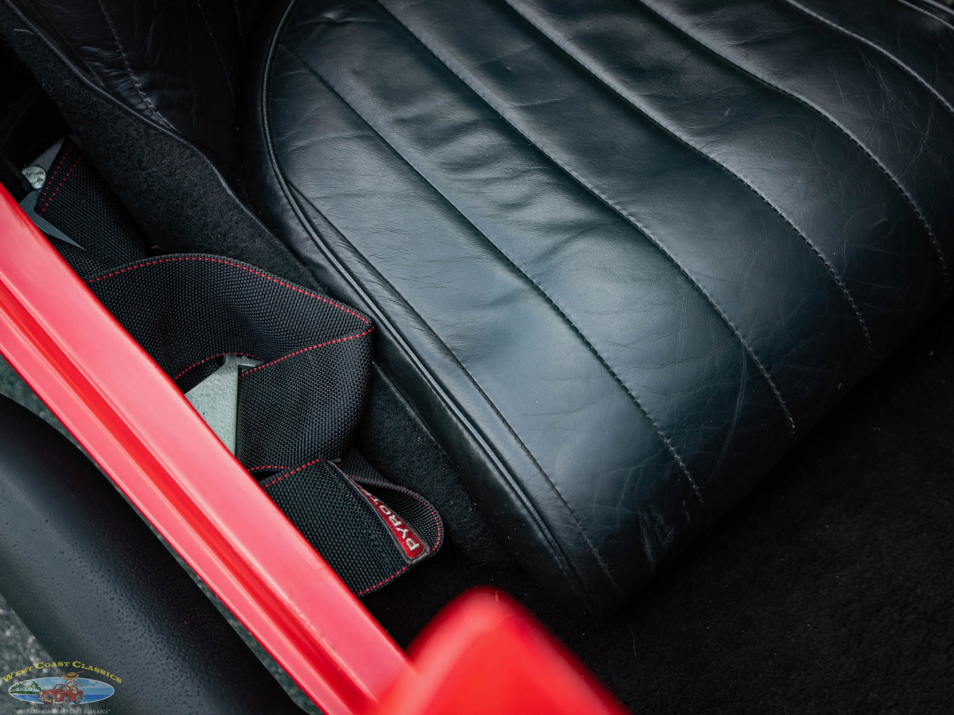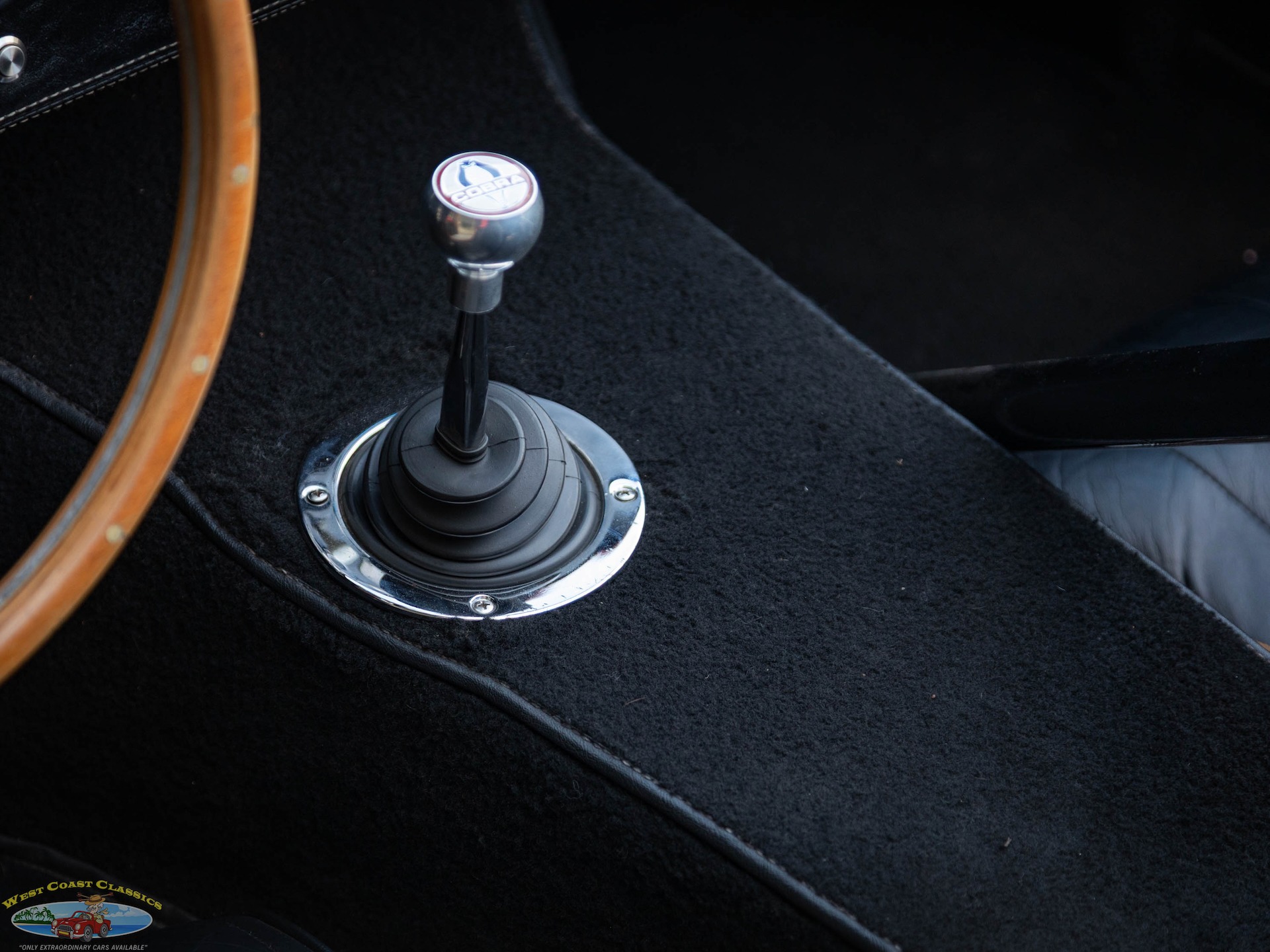 The cockpit features low-back bucket seats trimmed in Black upholstery and fitted with Pyrotect four-point harnesses. Details include a dash-mounted rearview mirror, a Cobra-branded shift knob, black carpeted floors, and electric windshield wipers. The wood-rimmed steering wheel fronts a black vinyl dashboard fascia with Stewart-Warner instrumentation. The five-digit odometer shows only some 3,500 miles.