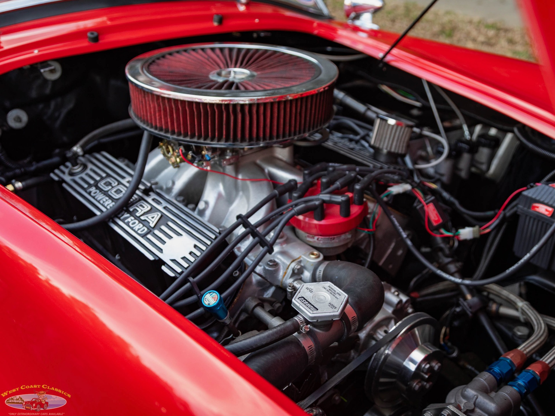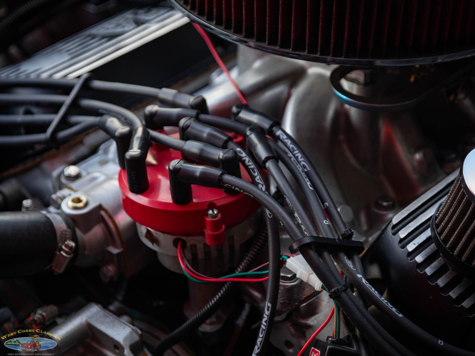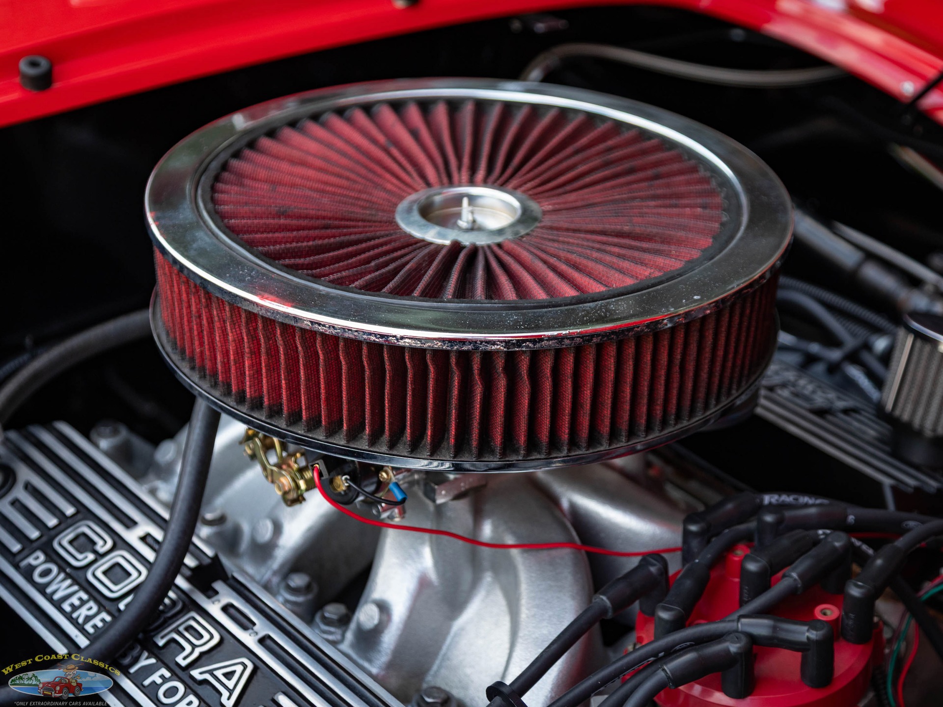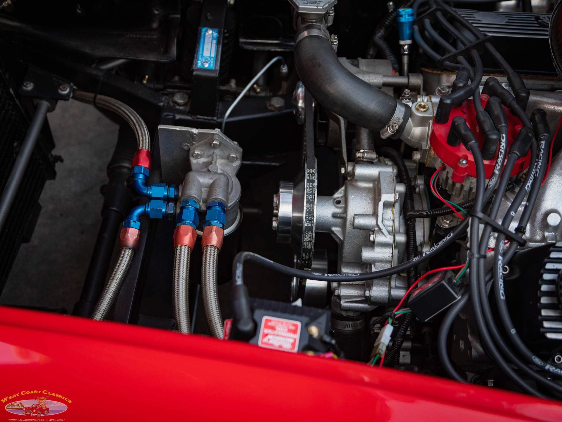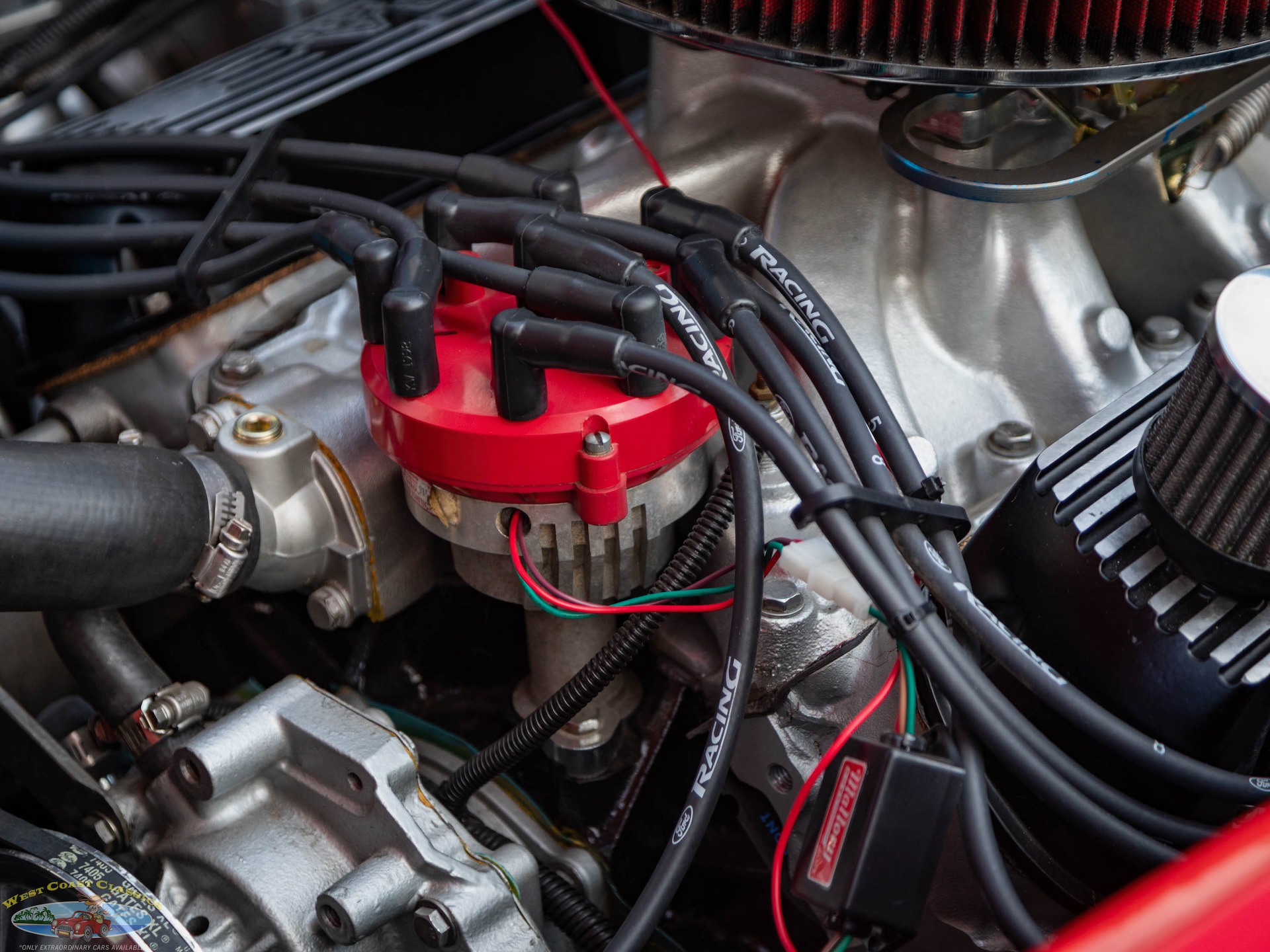 The engine is a Windsor V8 that was modified to displace 392ci, and it was assembled with forged Ross pistons, H-beam connecting rods, Ford Racing high-port aluminum heads, and SVO 1.6-ratio roller rockers. It is further equipped with an open-element air cleaner, an Edelbrock carburetor, and Mallory ignition components.
