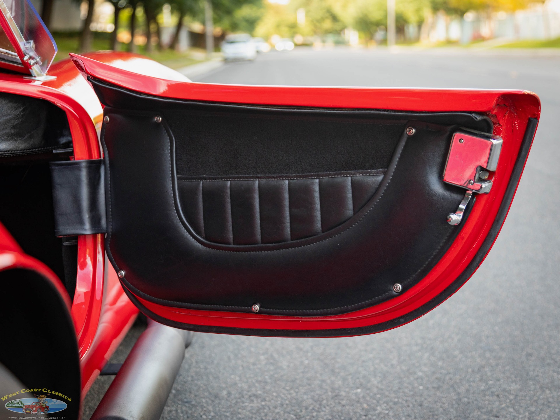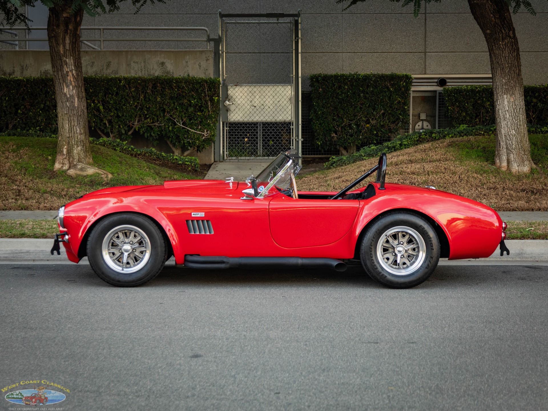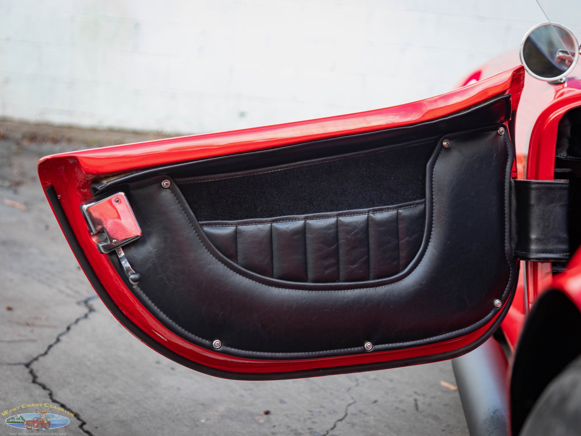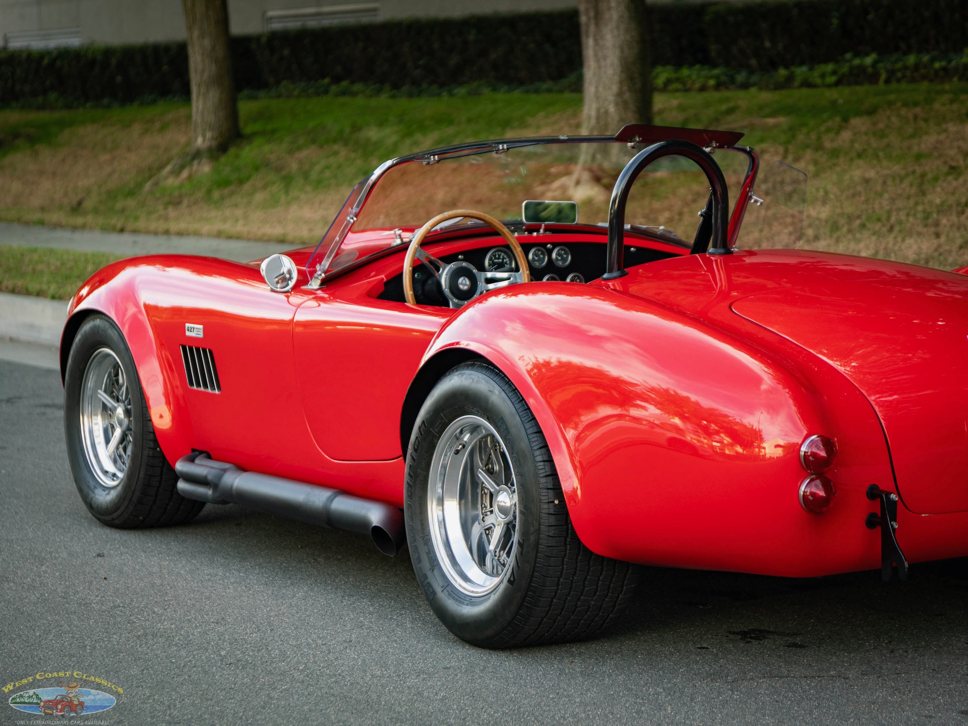 The fiberglass body is finished in Red and equipped with tinted sun visors, a hood scoop, wind wings, black-finished quick jack bumperettes, a LeMans-style fuel filler cap,a roll hoop, black quick jack bumperettes, and side-exit exhaust pipes, and the cabin is outfitted with low-back bucket seats, and a wood-rimmed steering wheel. Acquired by the selling dealer in 2025, this Unique Motorcars Cobra replica is now offered with a clean Arizona title describing the vehicle as a 1967 Shelby Cobra Roadster.