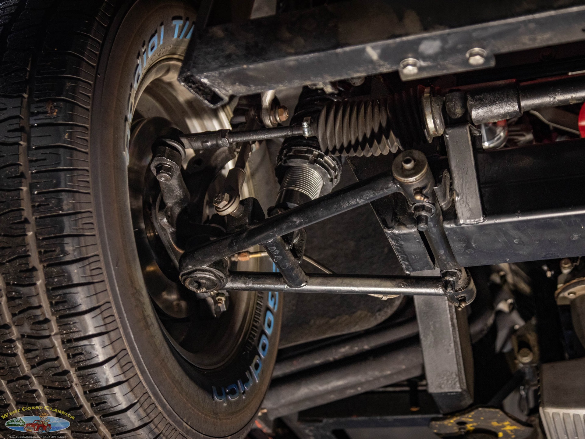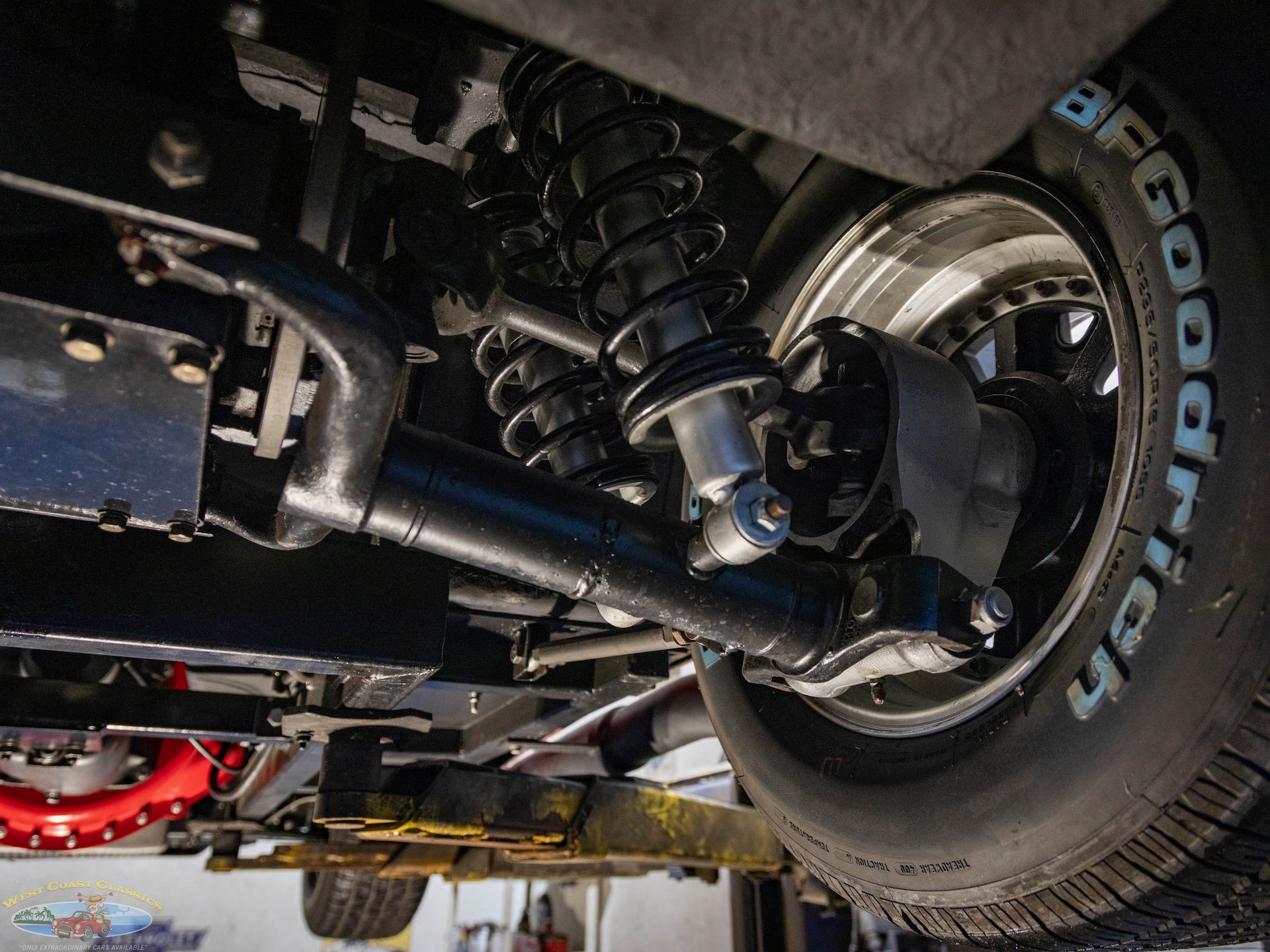 Compomotive 15 wheels are comprised of gray centers and three-eared faux knockoffs, and they are mounted with BFGoodrich Radial T/A tires. The car rides on an independent suspension with rack-and-pinion steering, four-corner adjustable coilovers, and tubular front control arms. Braking is handled by four-wheel discs, and the selling dealer states that Wilwood components were used during the build.